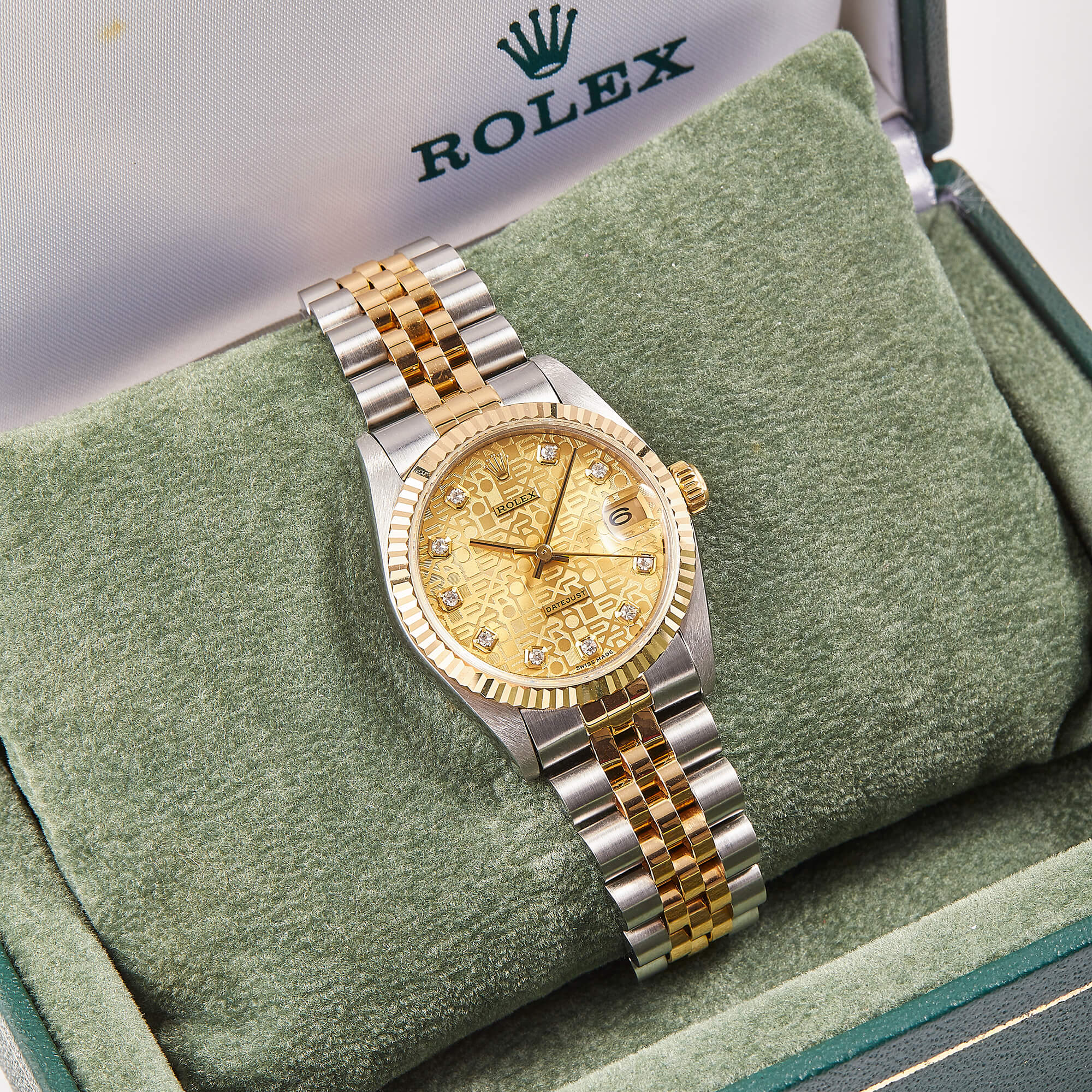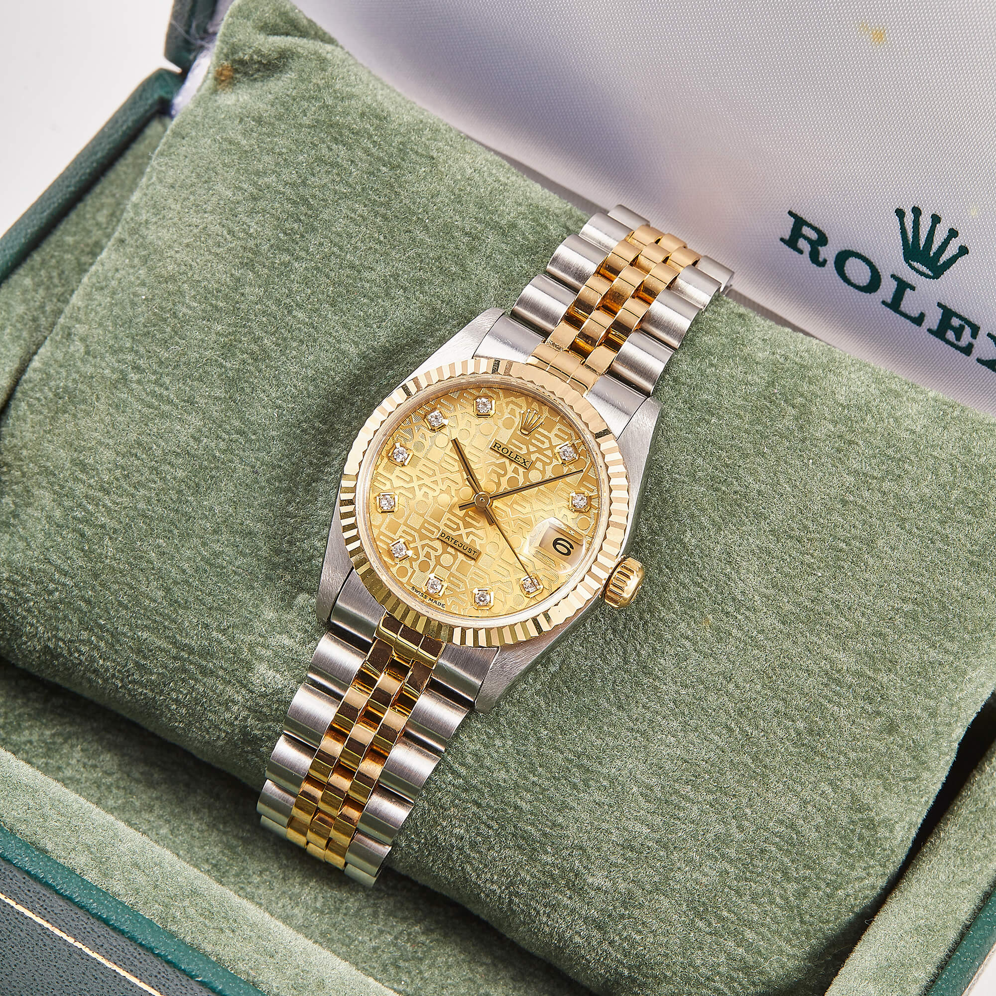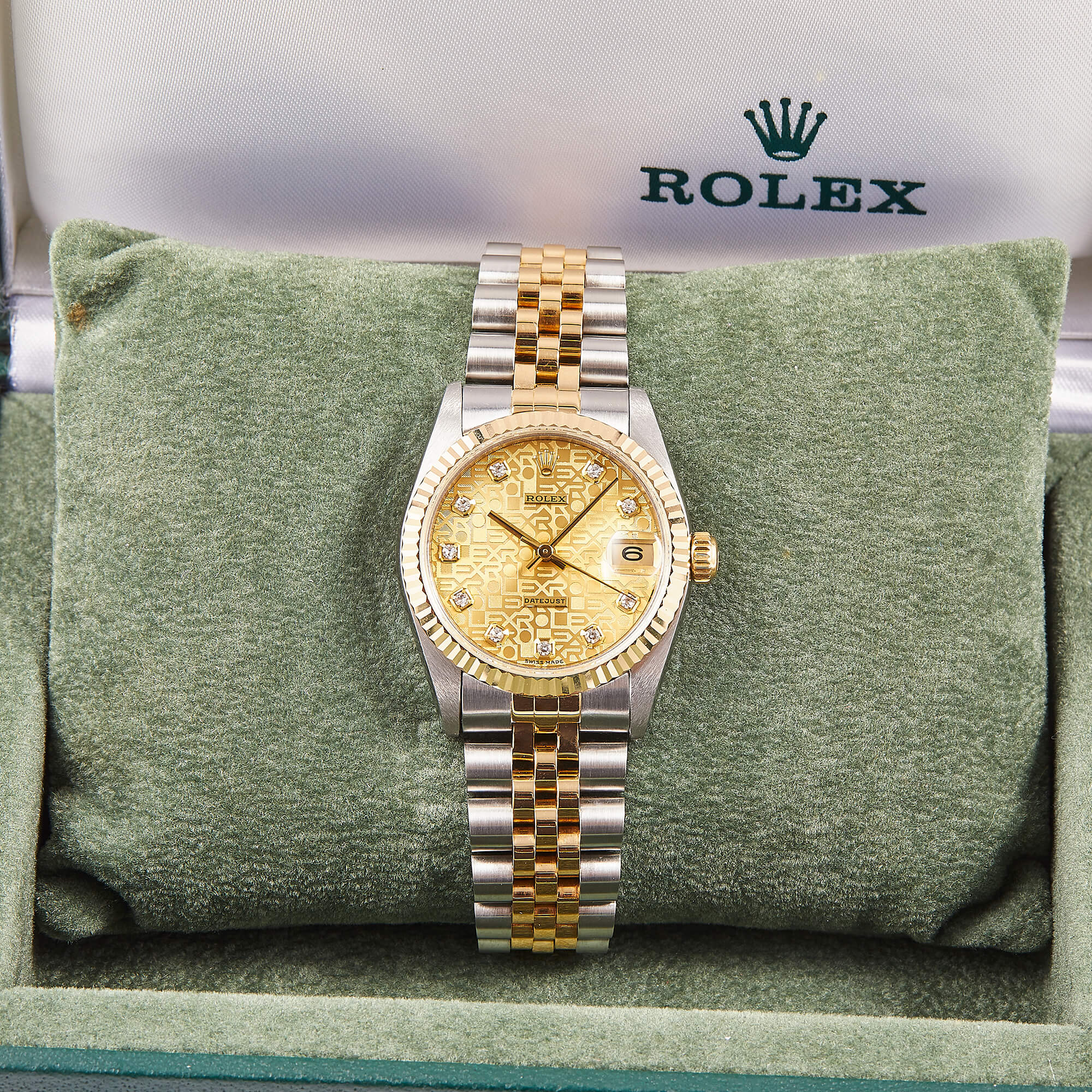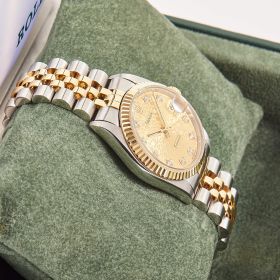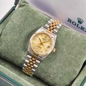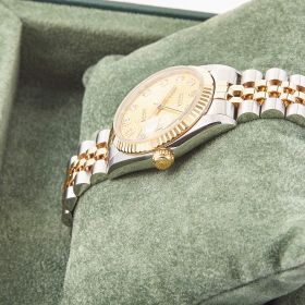 Rolex Datejust 31 Ref. 78273 mit Jubiléeband, geriffelter Lünette und champagnerfarbenen Computerzifferblatt mit Diamantindizes. Die 31mm Varianten erfreuen sich derzeit größter Beliebtheit bei modebewussten Damen.- Durchmesser