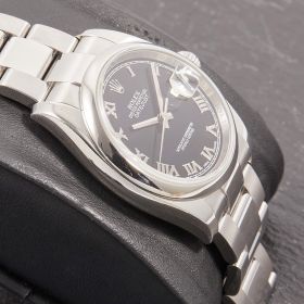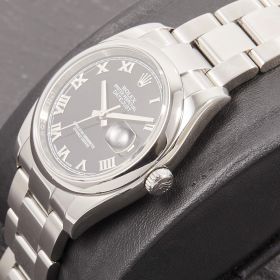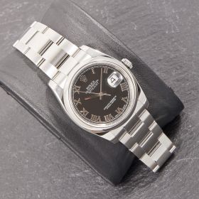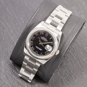 Rolex Datejust 36, Referenz 116200, mit glatter Lünette, klassischem Oysterband und einem eleganten schwarzen Zifferblatt mit römischen Indizes. Die Uhr befindet sich in schönem Zustand. Zeitlos, zuverlässig und vielseitig – eine perfekte Wahl für alle, die eine klassische Datejust in gepflegtem Zustand suchen.- Durchmesser