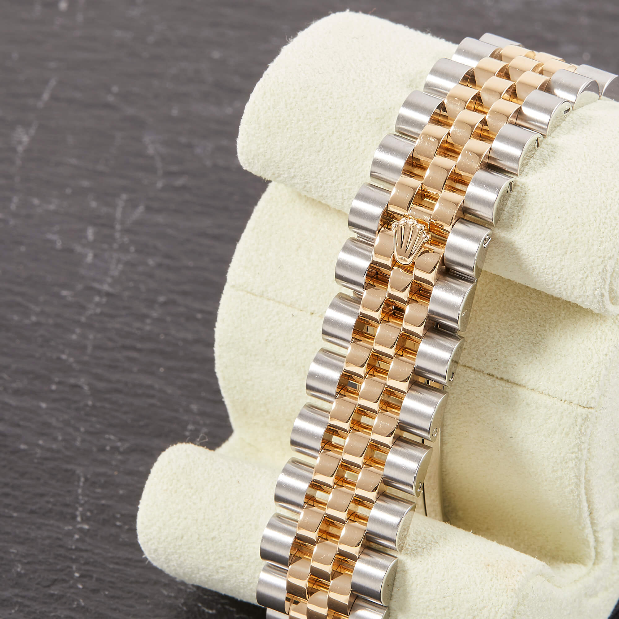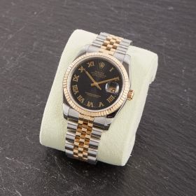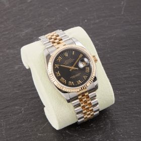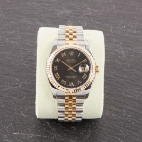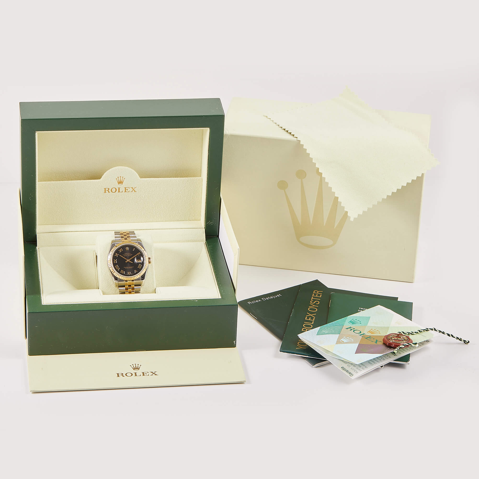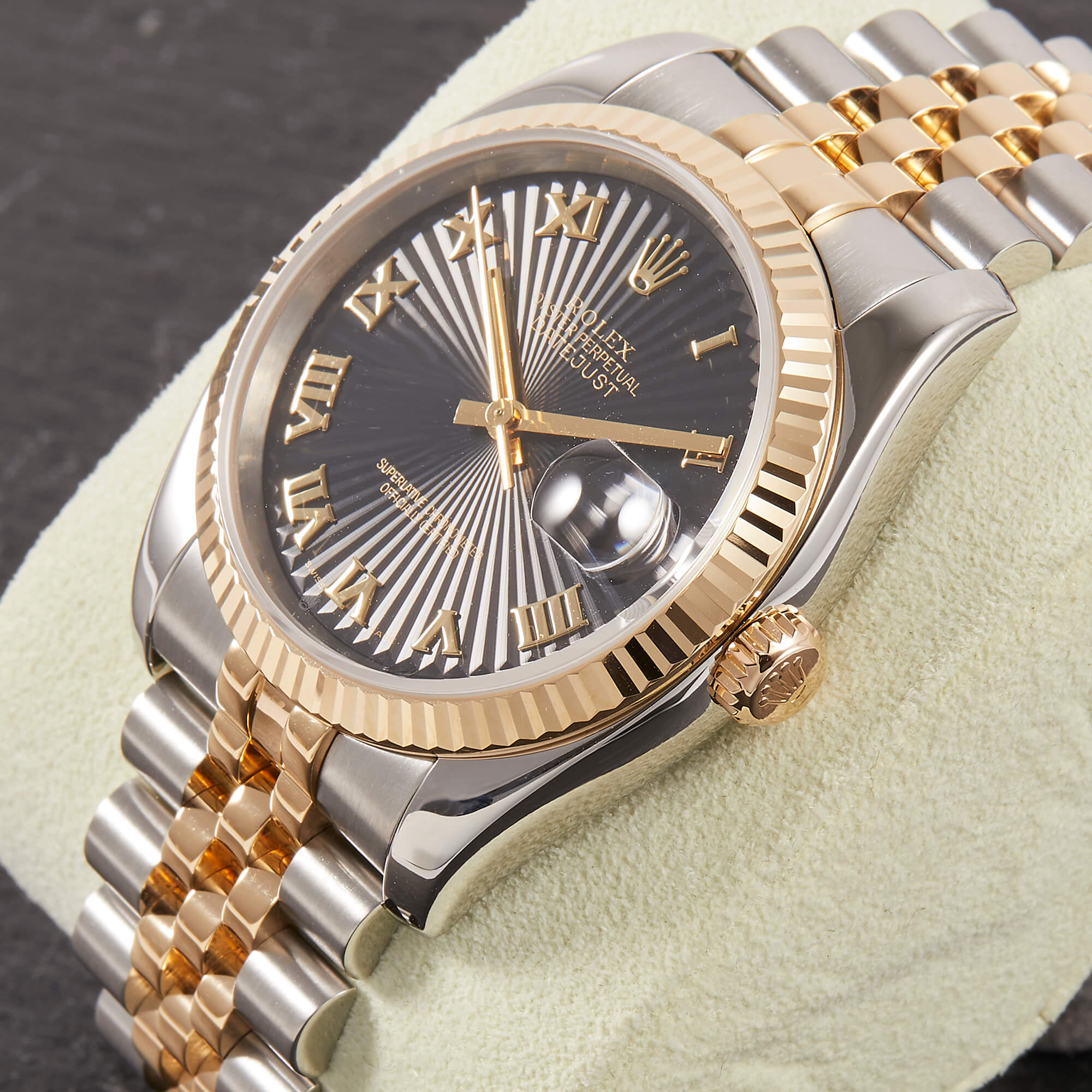 Die Rolex Datejust Referenz 116233 besticht durch ihr 36 mm großes Gehäuse aus Edelstahl und 18 Karat Gelbgold, kombiniert mit dem eleganten Superjubileeband inklusive verdeckter „Crownclasp“-Schließe. Das schwarze Sunbeam Zifferblatt mit Strichtindizes verleiht der Uhr einen edlen und zugleich zurückhaltenden Look. Im Inneren arbeitet das bewährte automatische Kaliber 3135, bekannt für Präzision und Zuverlässigkeit. Komplettiert wird dieses Angebot durch originale Box und Papiere, die den Sammlerwert erhöhen und Authentizität garantieren. Ein zeitloses und stilvolles Modell für jeden Anlass.- Durchmesser