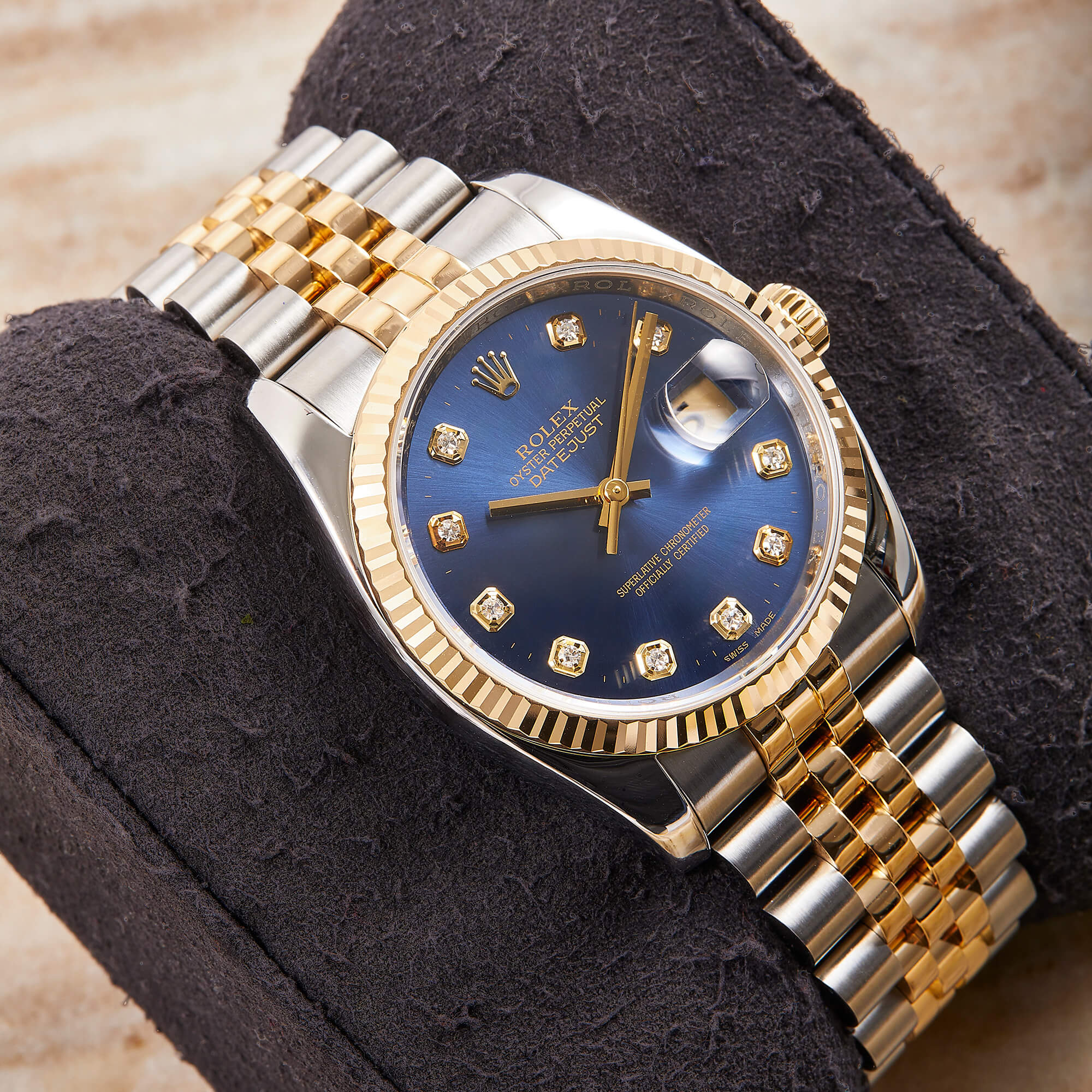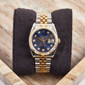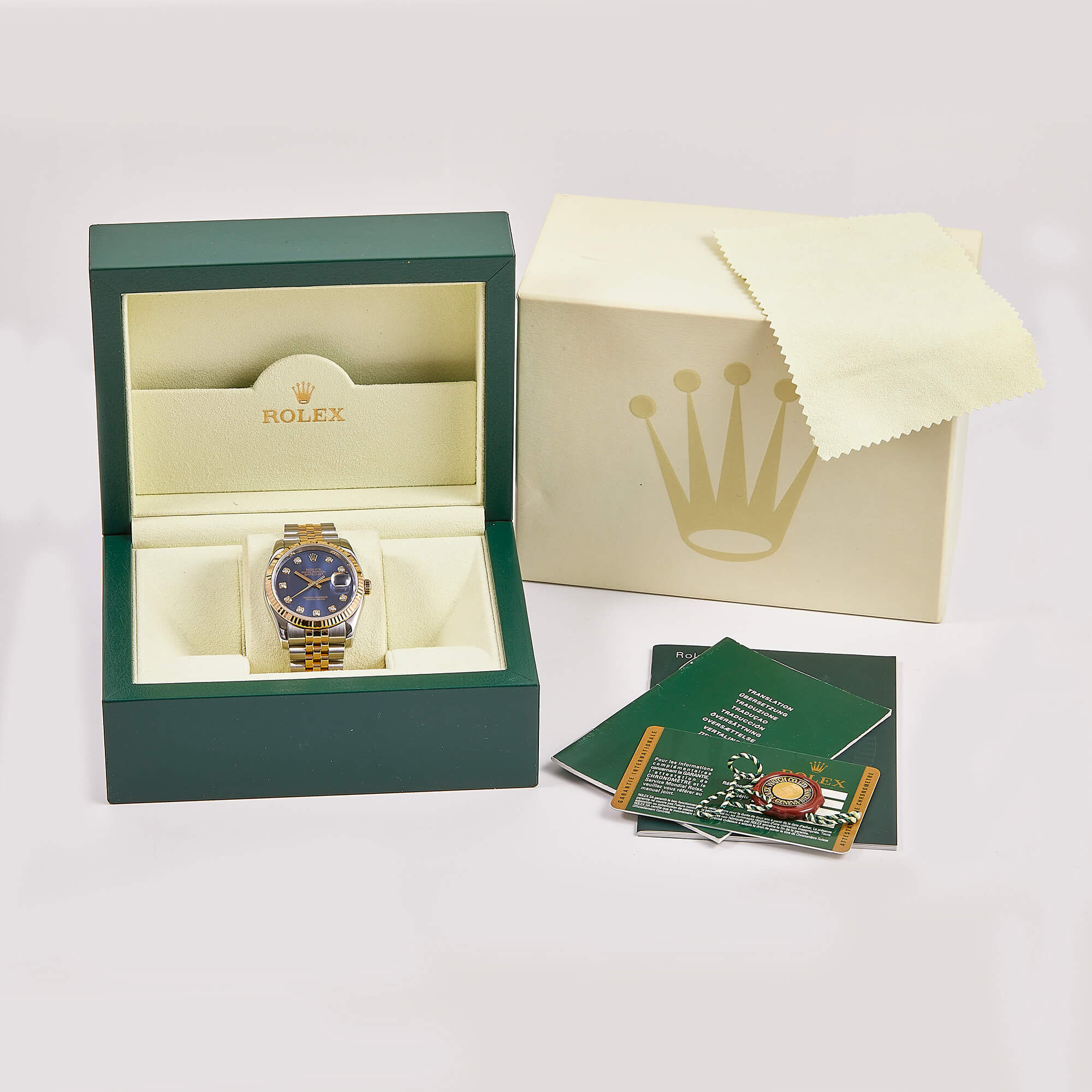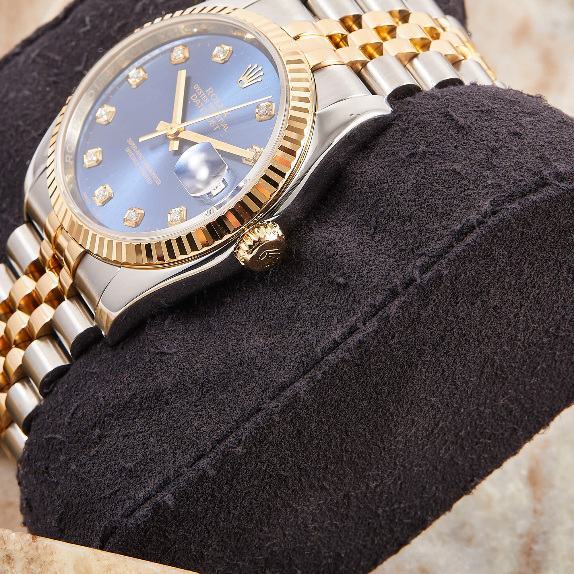 Die Rolex Datejust Referenz 116233 besticht durch ihr 36 mm großes Gehäuse aus Edelstahl und 18 Karat Gelbgold, kombiniert mit dem eleganten Superjubileeband inklusive verdeckter „Crownclasp“-Schließe. Das blaue Zifferblatt mit Diamantindizes verleiht der Uhr einen edlen und zugleich zurückhaltenden Look. Im Inneren arbeitet das bewährte automatische Kaliber 3135, bekannt für Präzision und Zuverlässigkeit. Komplettiert wird dieses Angebot durch originale Box und Papiere, die den Sammlerwert erhöhen und Authentizität garantieren. Ein zeitloses und stilvolles Modell für jeden Anlass.- Durchmesser