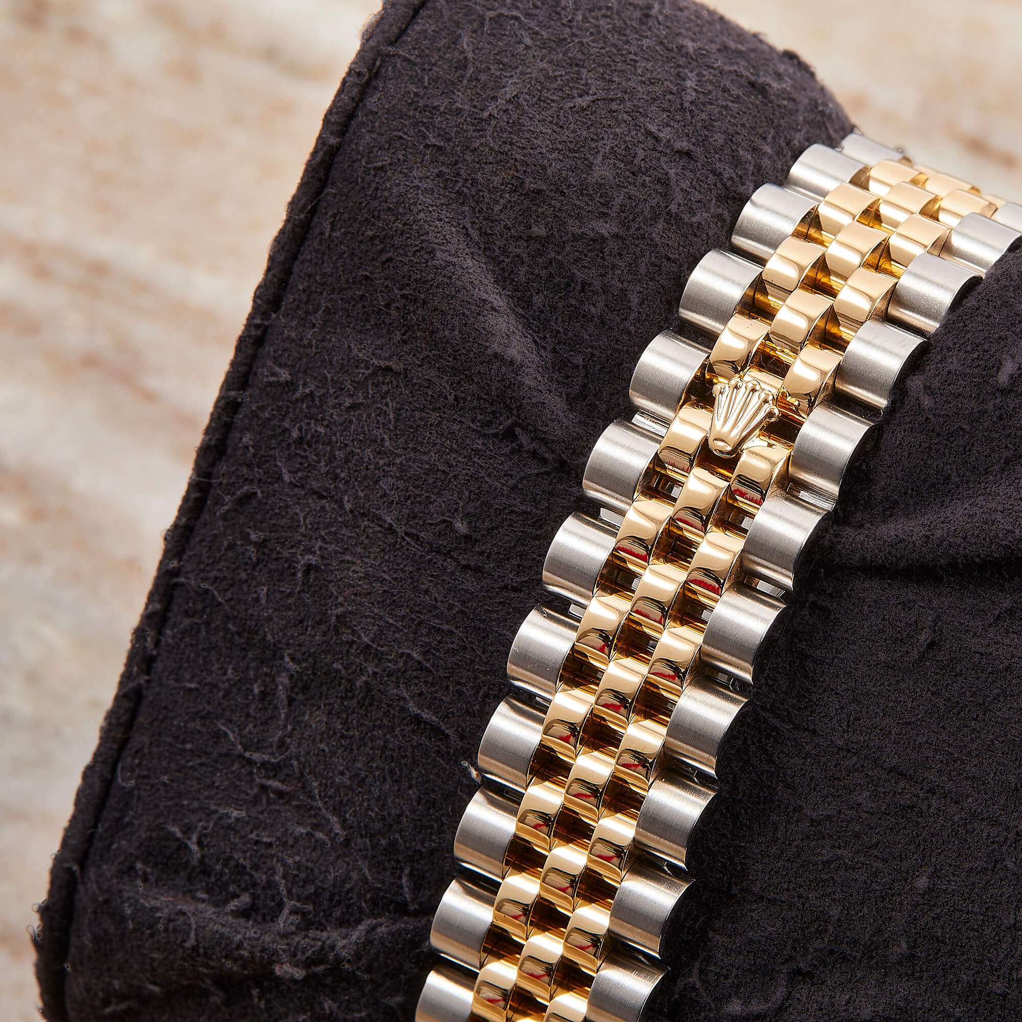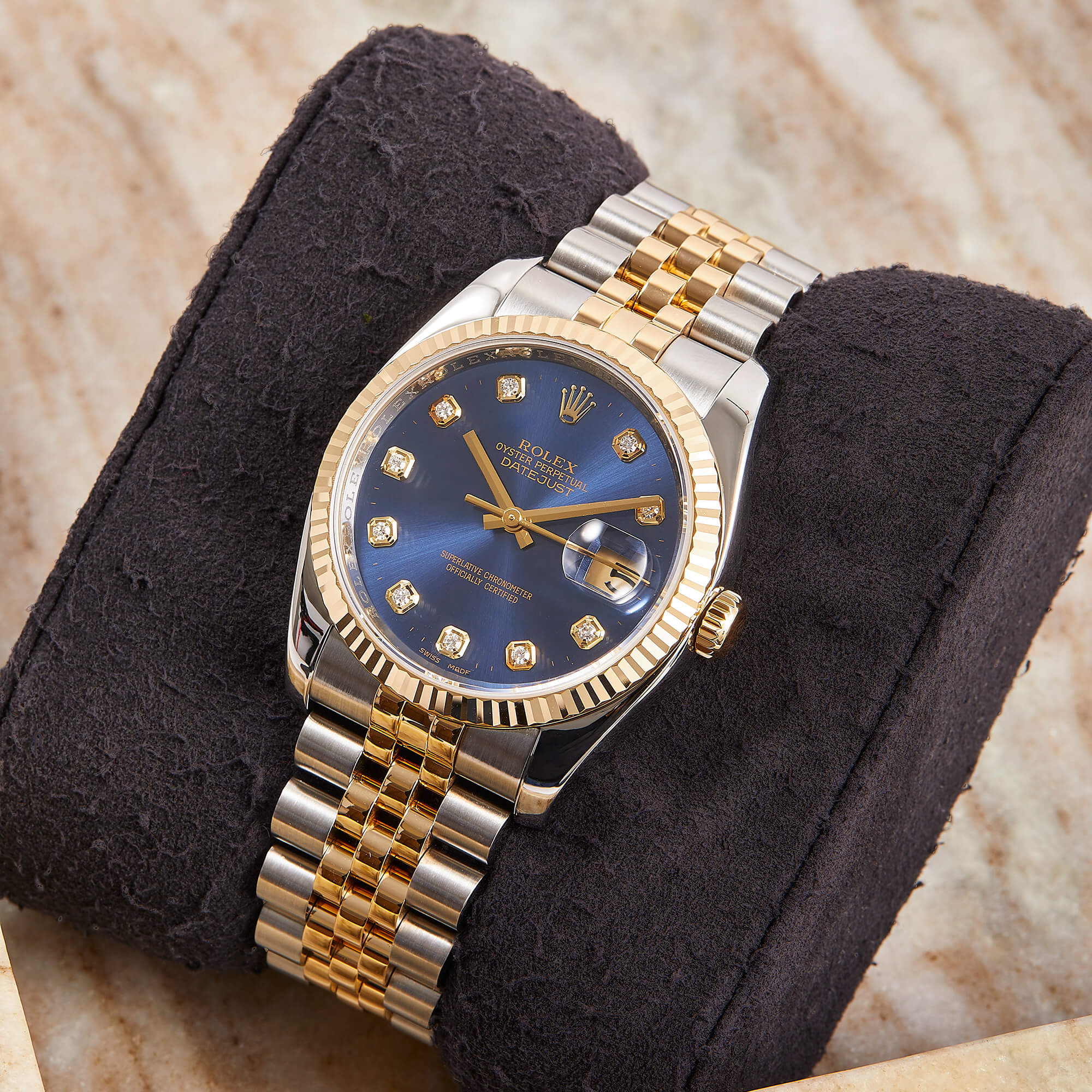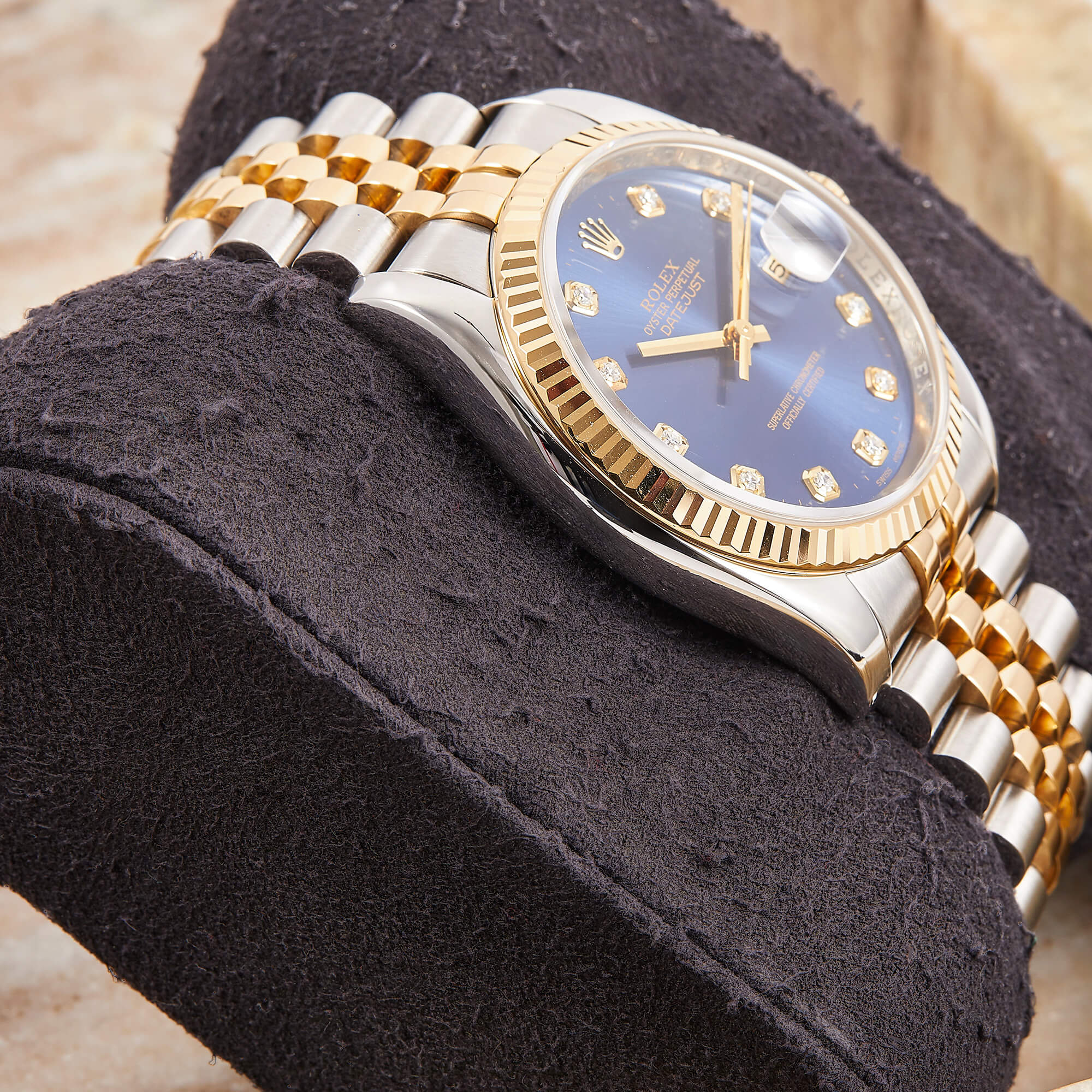 Die Rolex Datejust Referenz 116233 besticht durch ihr 36 mm großes Gehäuse aus Edelstahl und 18 Karat Gelbgold, kombiniert mit dem eleganten Superjubileeband inklusive verdeckter „Crownclasp“-Schließe. Das blaue Zifferblatt mit Diamantindizes verleiht der Uhr einen edlen und zugleich zurückhaltenden Look. Im Inneren arbeitet das bewährte automatische Kaliber 3135, bekannt für Präzision und Zuverlässigkeit. Komplettiert wird dieses Angebot durch originale Box und Papiere, die den Sammlerwert erhöhen und Authentizität garantieren. Ein zeitloses und stilvolles Modell für jeden Anlass.- Durchmesser