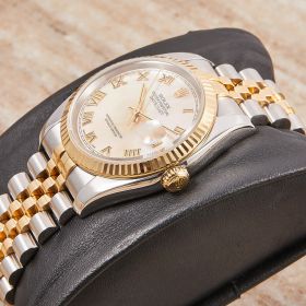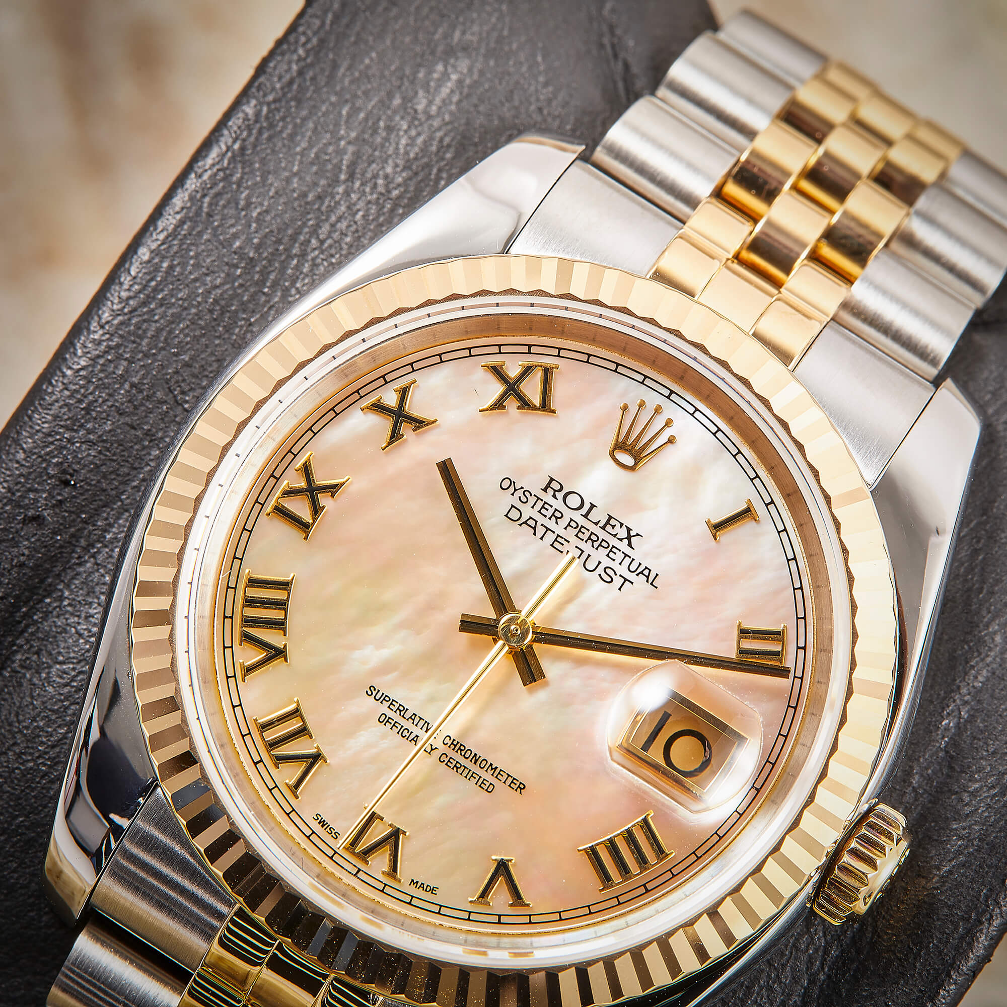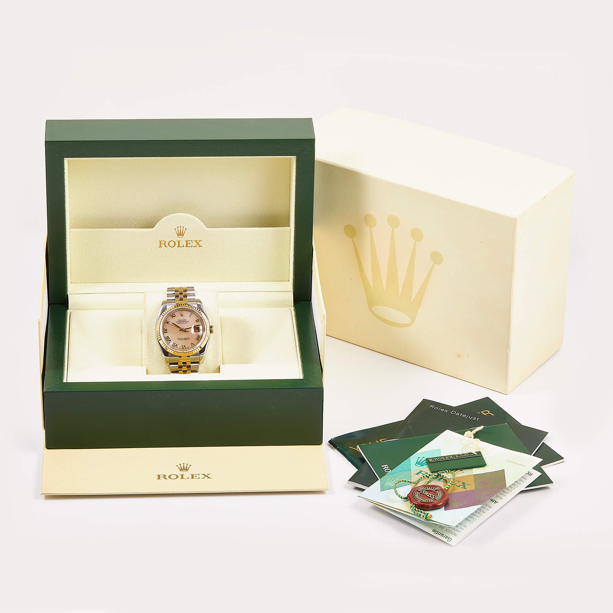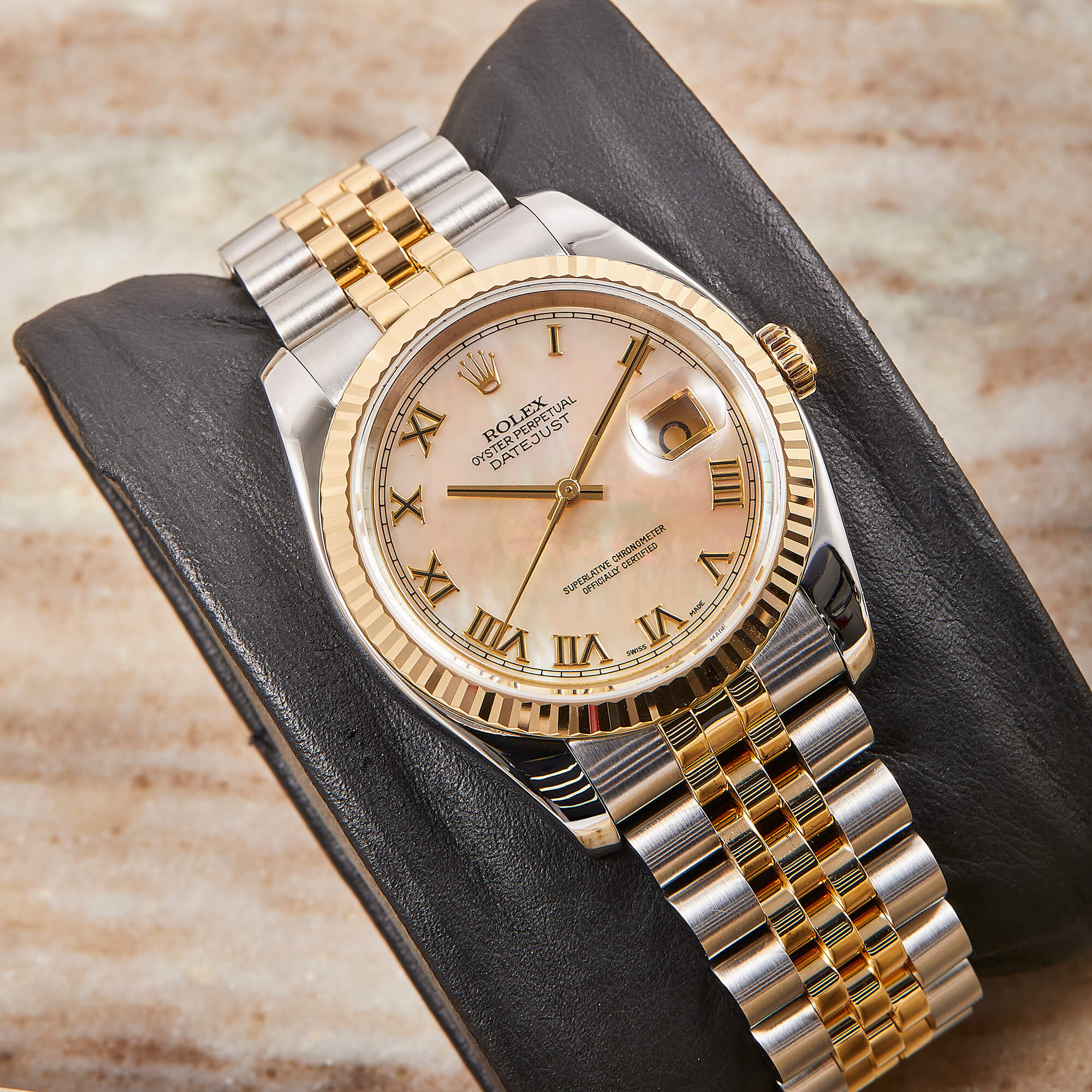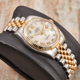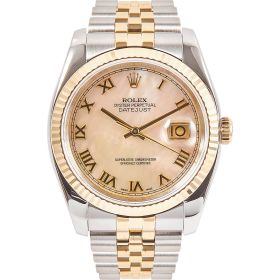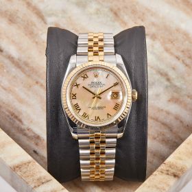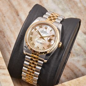 Die Rolex Datejust Referenz 116233 besticht durch ihr 36 mm großes Gehäuse aus Edelstahl und 18 Karat Gelbgold, kombiniert mit dem eleganten Superjubileeband inklusive verdeckter „Crownclasp“-Schließe. Das Perlmutt-Zifferblatt mit römischen Indizes und verleiht der Uhr einen edlen und zugleich zurückhaltenden Look. Im Inneren arbeitet das bewährte automatische Kaliber 3135, bekannt für Präzision und Zuverlässigkeit. Komplettiert wird dieses Angebot durch originale Box und Papiere, die den Sammlerwert erhöhen und Authentizität garantieren. Ein zeitloses und stilvolles Modell für jeden Anlass.- Durchmesser