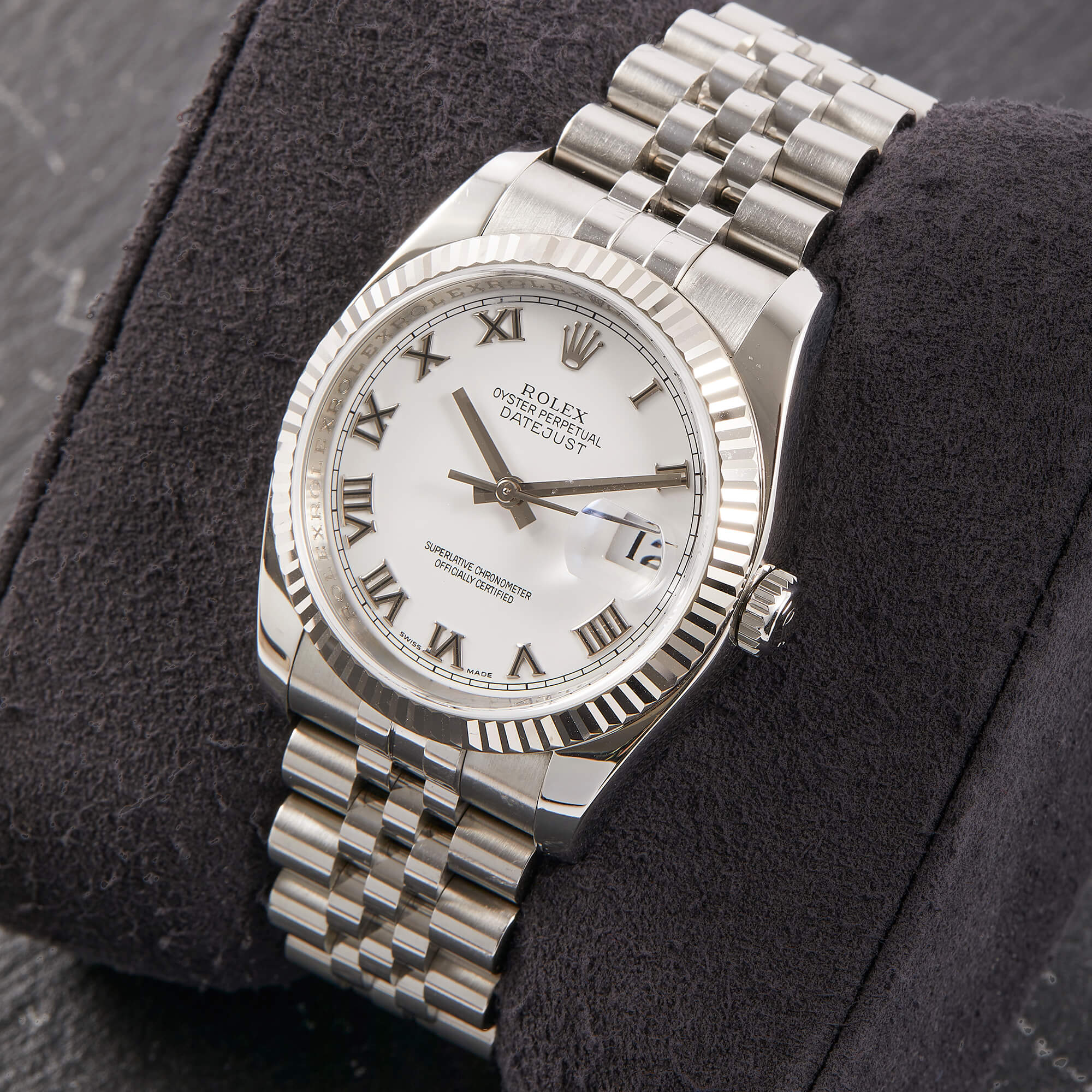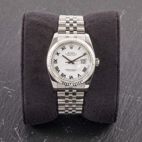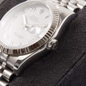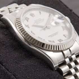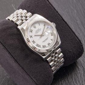 Die Rolex Datejust Referenz 116234 besticht durch ihr 36 mm großes Gehäuse aus Edelstahl mit Weißgold-Lünette, kombiniert mit dem eleganten Superjubileeband inklusive verdeckter „Crownclasp“-Schließe. Das weiße Zifferblatt mit römischen Indizes verleiht der Uhr einen edlen und zugleich zurückhaltenden Look. Im Inneren arbeitet das bewährte automatische Kaliber 3135, bekannt für Präzision und Zuverlässigkeit. Komplettiert wird dieses Angebot durch originale Papiere, die den Sammlerwert erhöhen und Authentizität garantieren. Ein zeitloses und stilvolles Modell für jeden Anlass.- Durchmesser