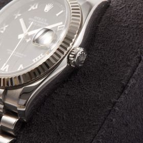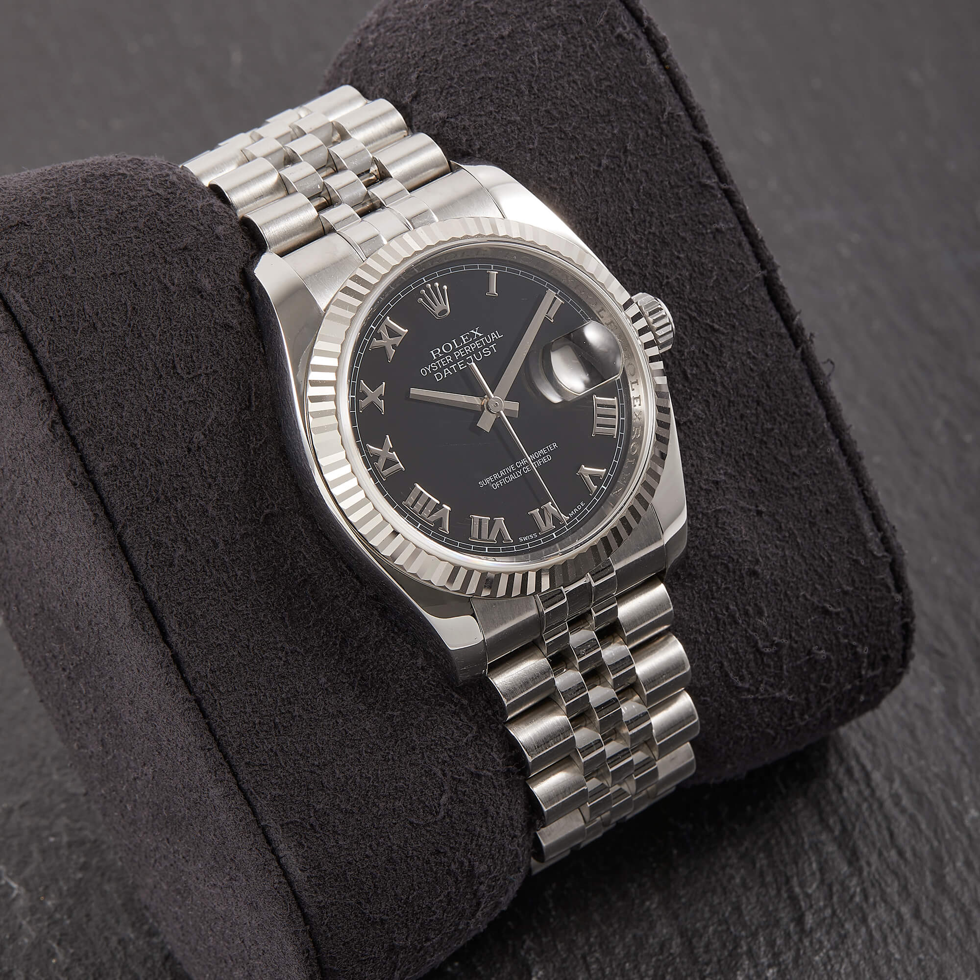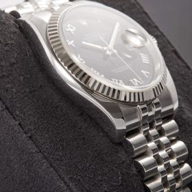 Die Rolex Datejust Referenz 116234 besticht durch ihr 36 mm großes Gehäuse aus Edelstahl mit Weißgold-Lünette, kombiniert mit dem eleganten Superjubileeband inklusive verdeckter „Crownclasp“-Schließe. Das schwarze Zifferblatt mit römischen Indizes verleiht der Uhr einen edlen und zugleich zurückhaltenden Look. Im Inneren arbeitet das bewährte automatische Kaliber 3135, bekannt für Präzision und Zuverlässigkeit. Komplettiert wird dieses Angebot durch originale Papiere, die den Sammlerwert erhöhen und Authentizität garantieren. Ein zeitloses und stilvolles Modell für jeden Anlass.- Durchmesser
