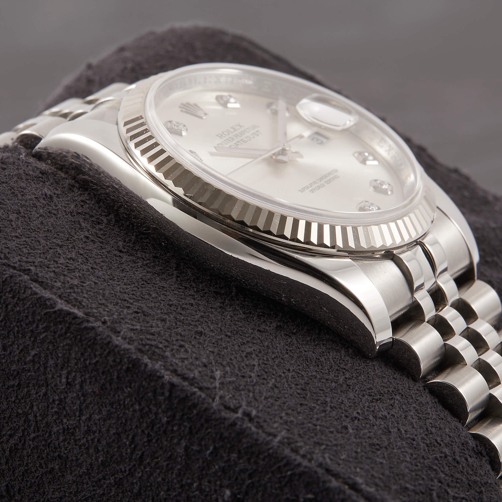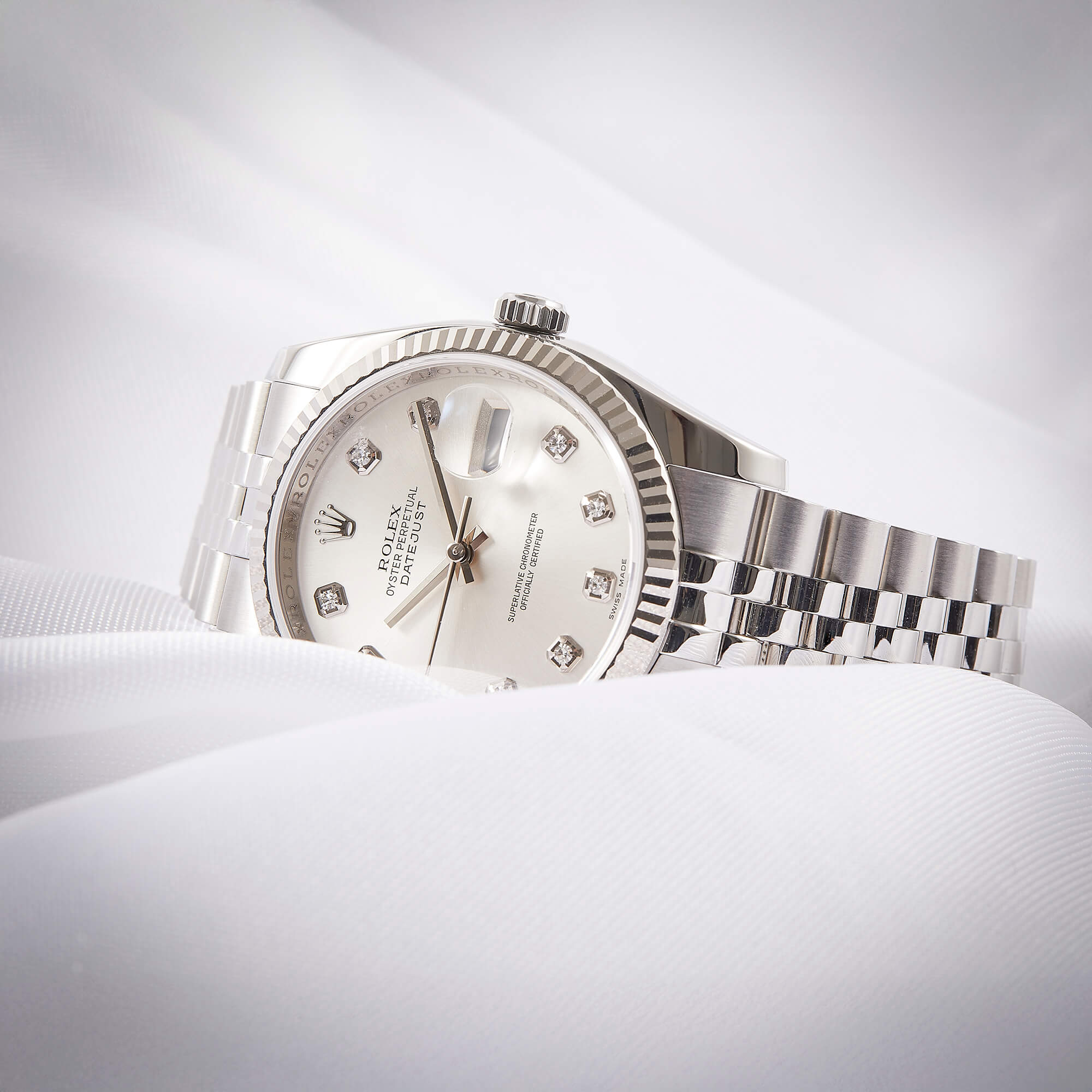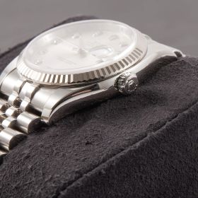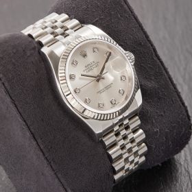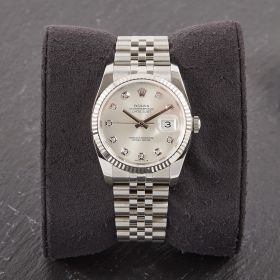 Die Rolex Datejust Referenz 116234 besticht durch ihr 36 mm großes Gehäuse aus Edelstahl mit Weißgold-Lünette, kombiniert mit dem eleganten Superjubileeband inklusive verdeckter „Crownclasp“-Schließe. Das silberne Zifferblatt mit funkelnden Diamantindizes verleiht der Uhr einen edlen und zugleich zurückhaltenden Look. Im Inneren arbeitet das bewährte automatische Kaliber 3135, bekannt für Präzision und Zuverlässigkeit. Komplettiert wird dieses Angebot durch originale Papiere, die den Sammlerwert erhöhen und Authentizität garantieren. Ein zeitloses und stilvolles Modell für jeden Anlass.- Durchmesser