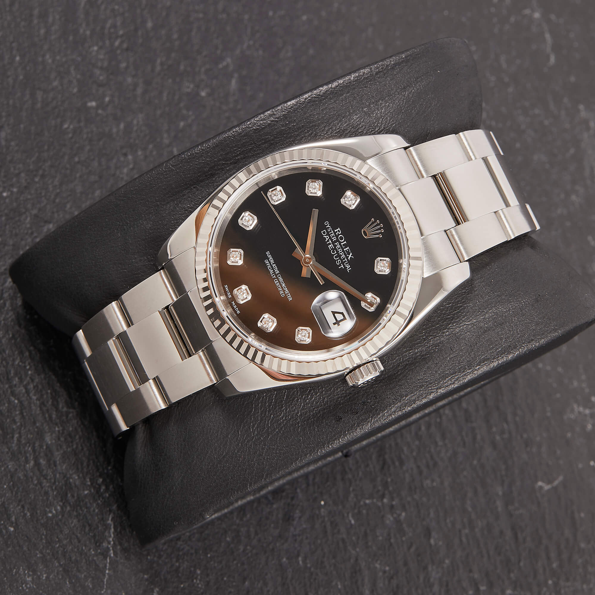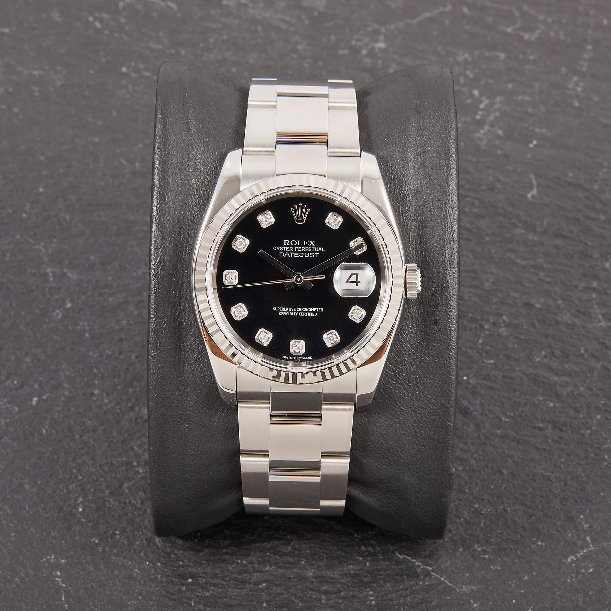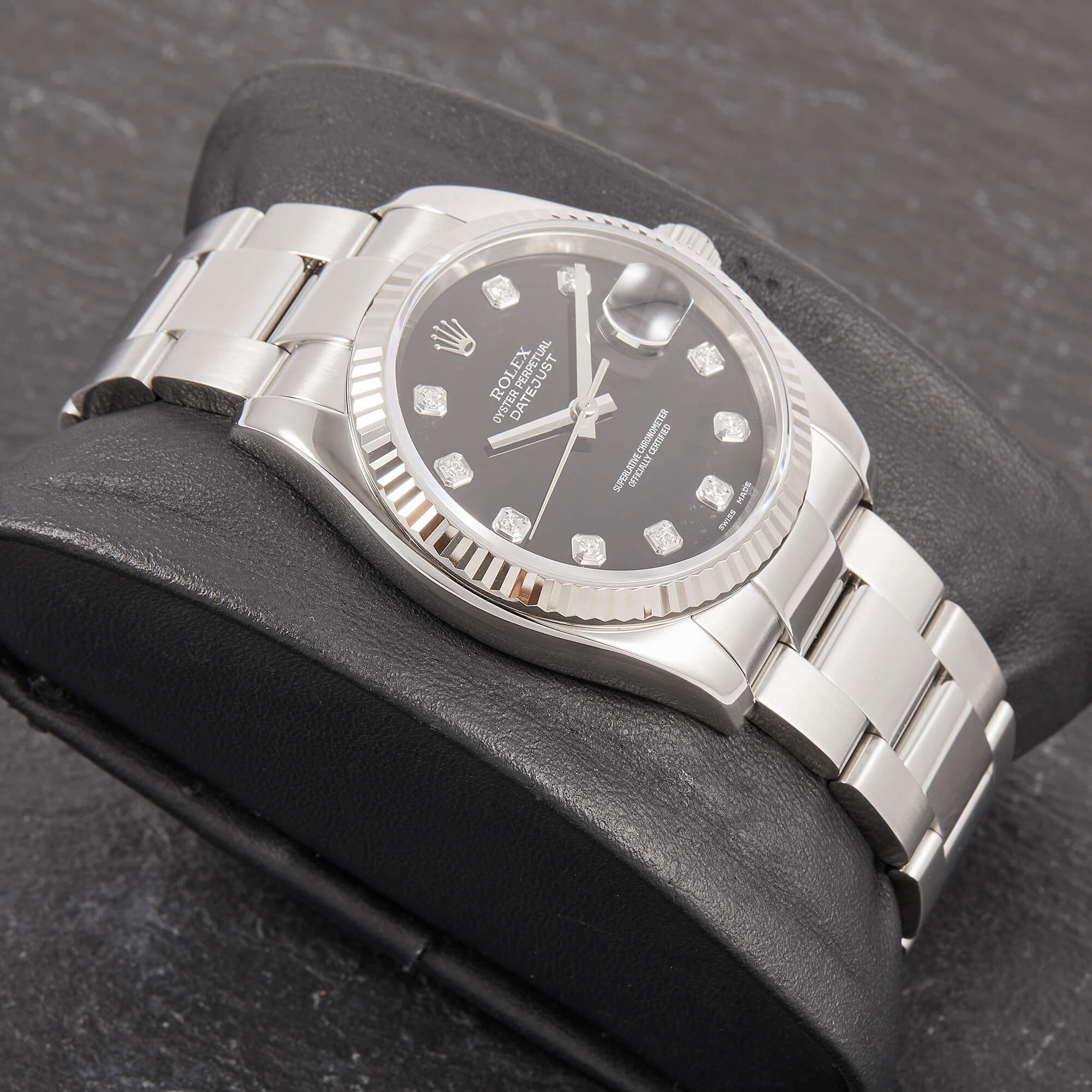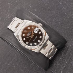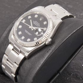 Die Rolex Datejust Referenz 116234 besticht durch ihr 36 mm großes Gehäuse aus Edelstahl und kombiniert mit dem eleganten Oysterband. Das schwarze Zifferblatt mit funkelnden Diamantindizes verleiht der Uhr einen edlen und zugleich zurückhaltenden Look. Im Inneren arbeitet das bewährte automatische Kaliber 3135, bekannt für Präzision und Zuverlässigkeit.- Durchmesser