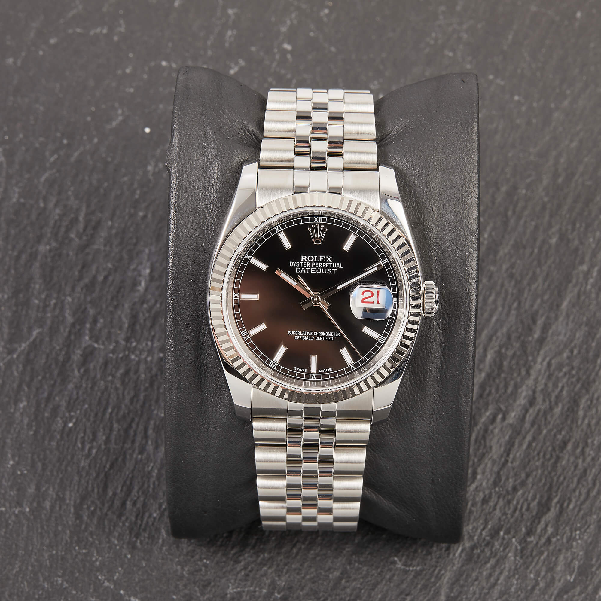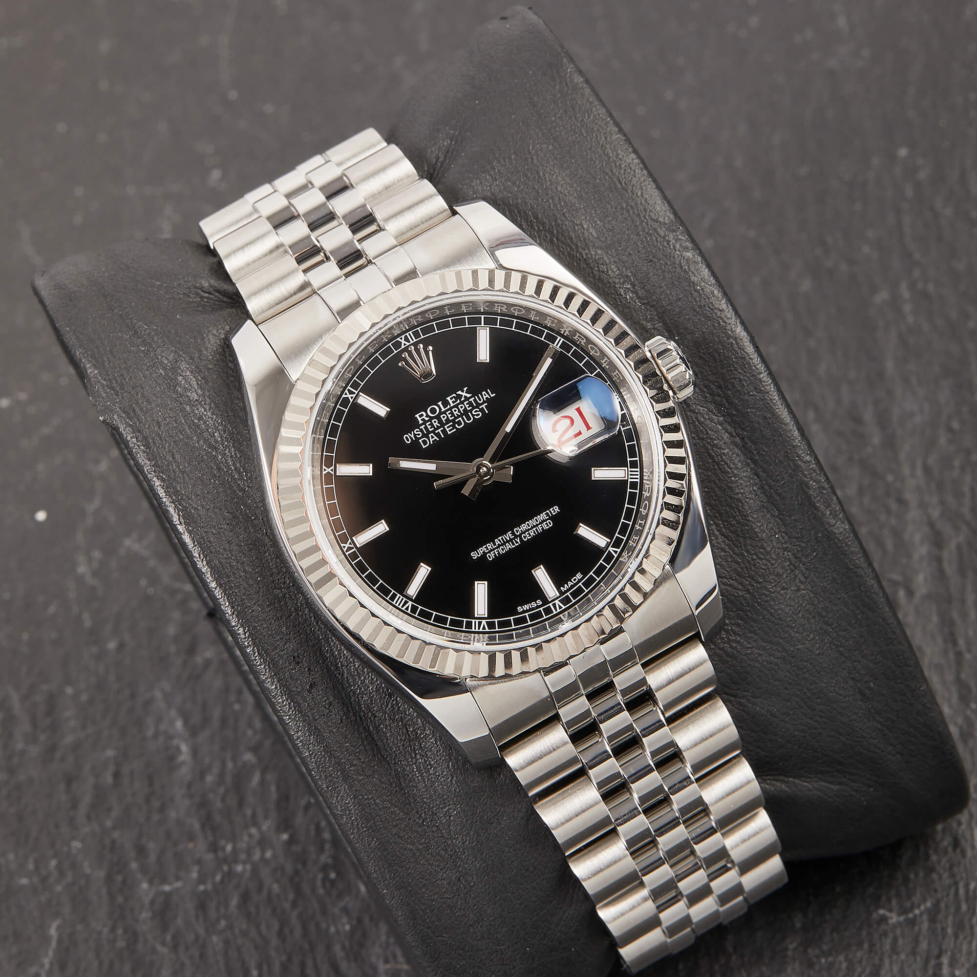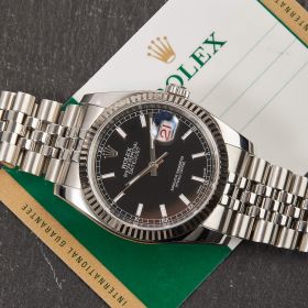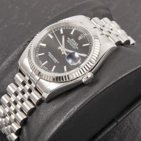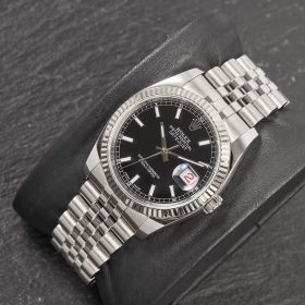 Die Rolex Datejust Referenz 116234 besticht durch ihr 36 mm großes Gehäuse aus Edelstahl mit Weißgold-Lünette, kombiniert mit dem eleganten Superjubileeband inklusive verdeckter „Crownclasp“-Schließe. Das schwarze Zifferblatt mit Strichindizes verleiht der Uhr einen edlen und zugleich zurückhaltenden Look. Im Inneren arbeitet das bewährte automatische Kaliber 3135, bekannt für Präzision und Zuverlässigkeit. Komplettiert wird dieses Angebot durch originale Papiere, die den Sammlerwert erhöhen und Authentizität garantieren. Ein zeitloses und stilvolles Modell für jeden Anlass.- Durchmesser