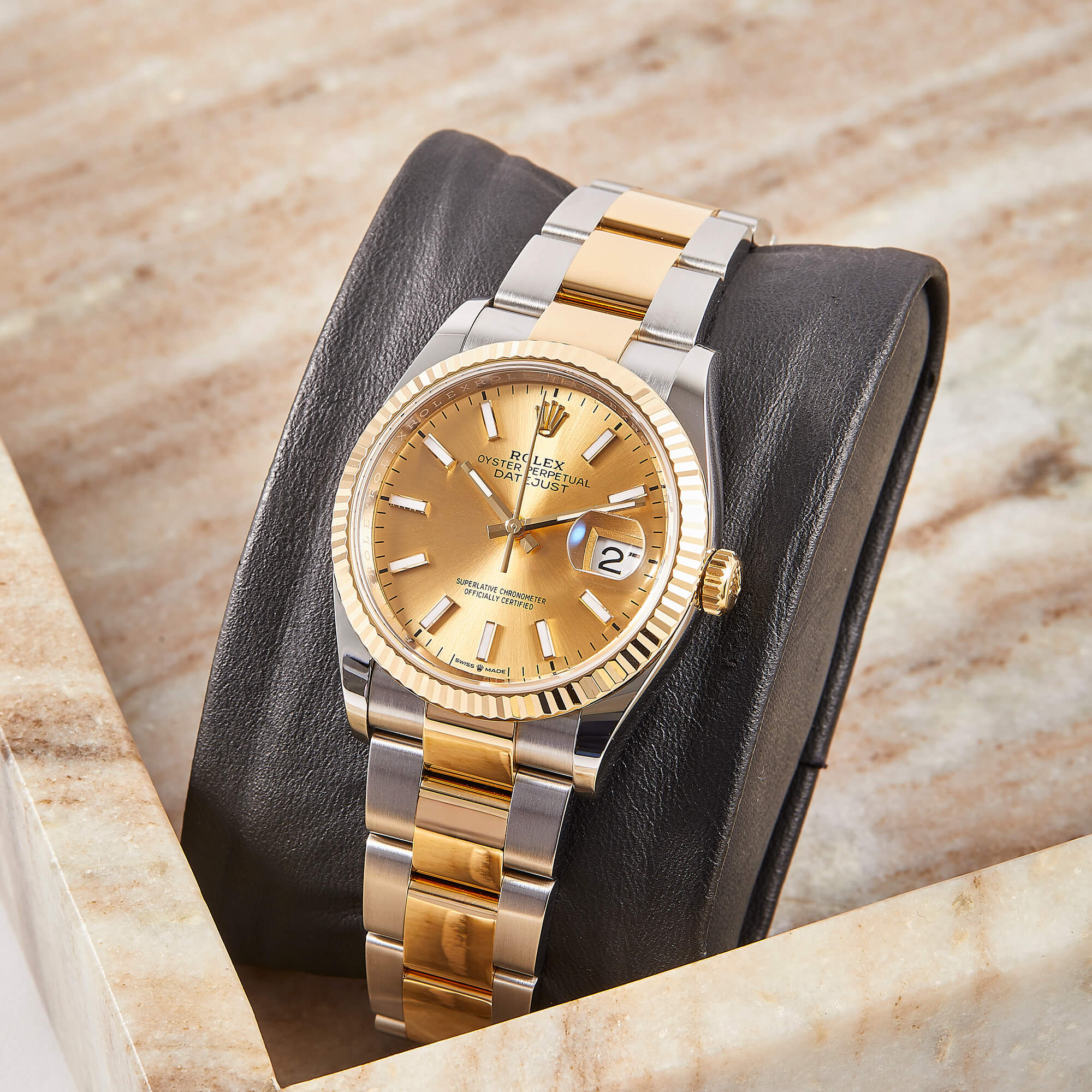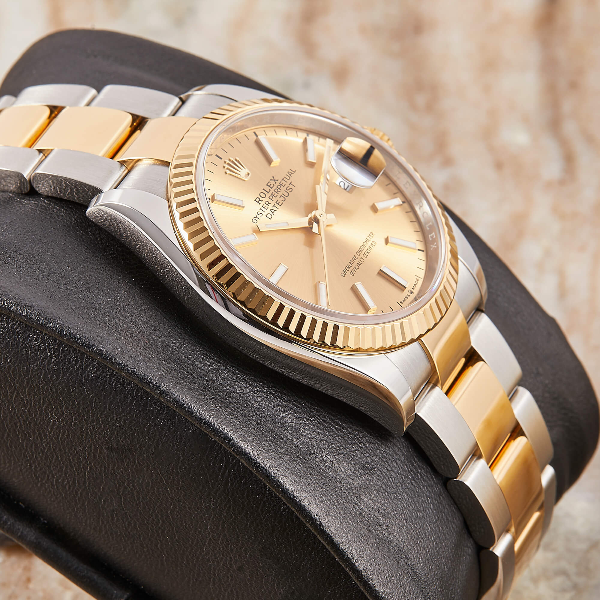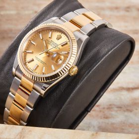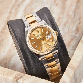 Die Rolex Datejust 36 Ref. 126233 mit champagnerfarbenen Zifferblatt und Strichindizes vereint klassische Eleganz mit der unverwechselbaren Qualität von Rolex. Das Oysterband aus Edelstahl mit 18 Karat Gelbgold verleiht der Uhr eine perfekte Balance zwischen Robustheit und Luxus. Im Fullset geliefert, umfasst die Uhr sämtliche Originaldokumente und -verpackung. Mit einem frischen Service nach Herstellervorgabe wurde die Funktionalität der Uhr überprüft und optimiert, sodass sie in perfektem Zustand ist.- Durchmesser