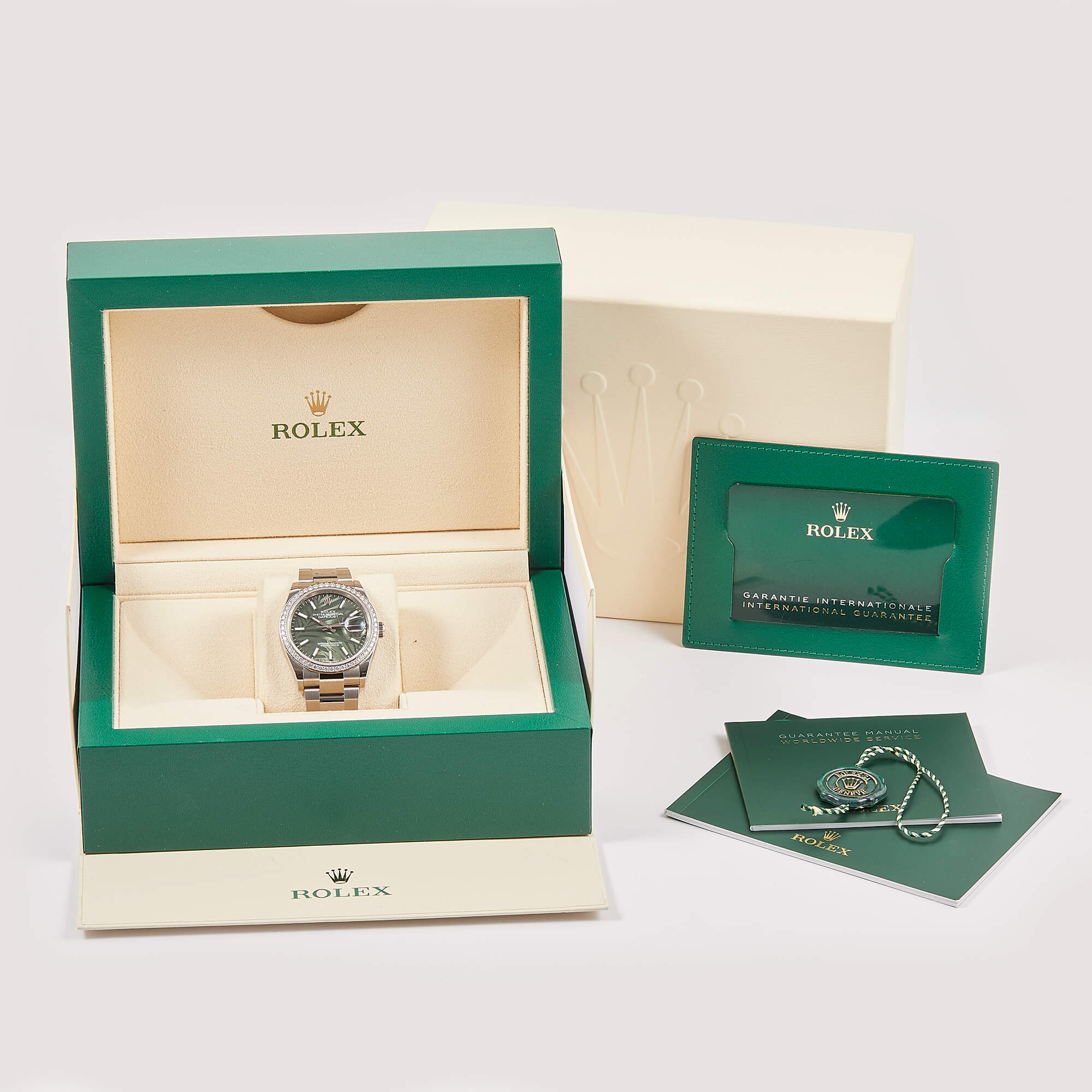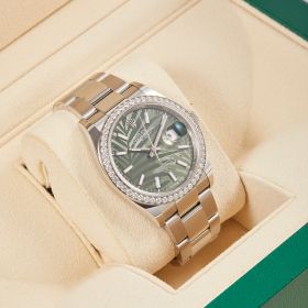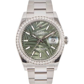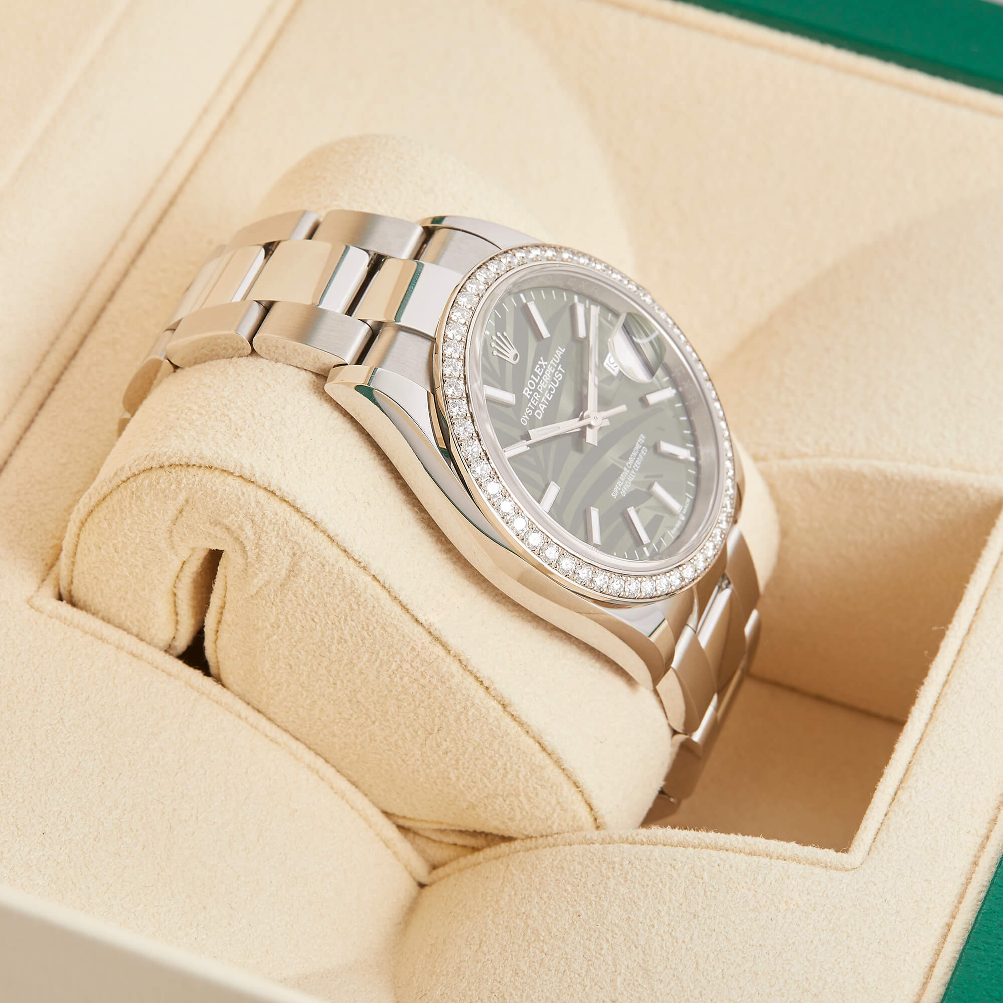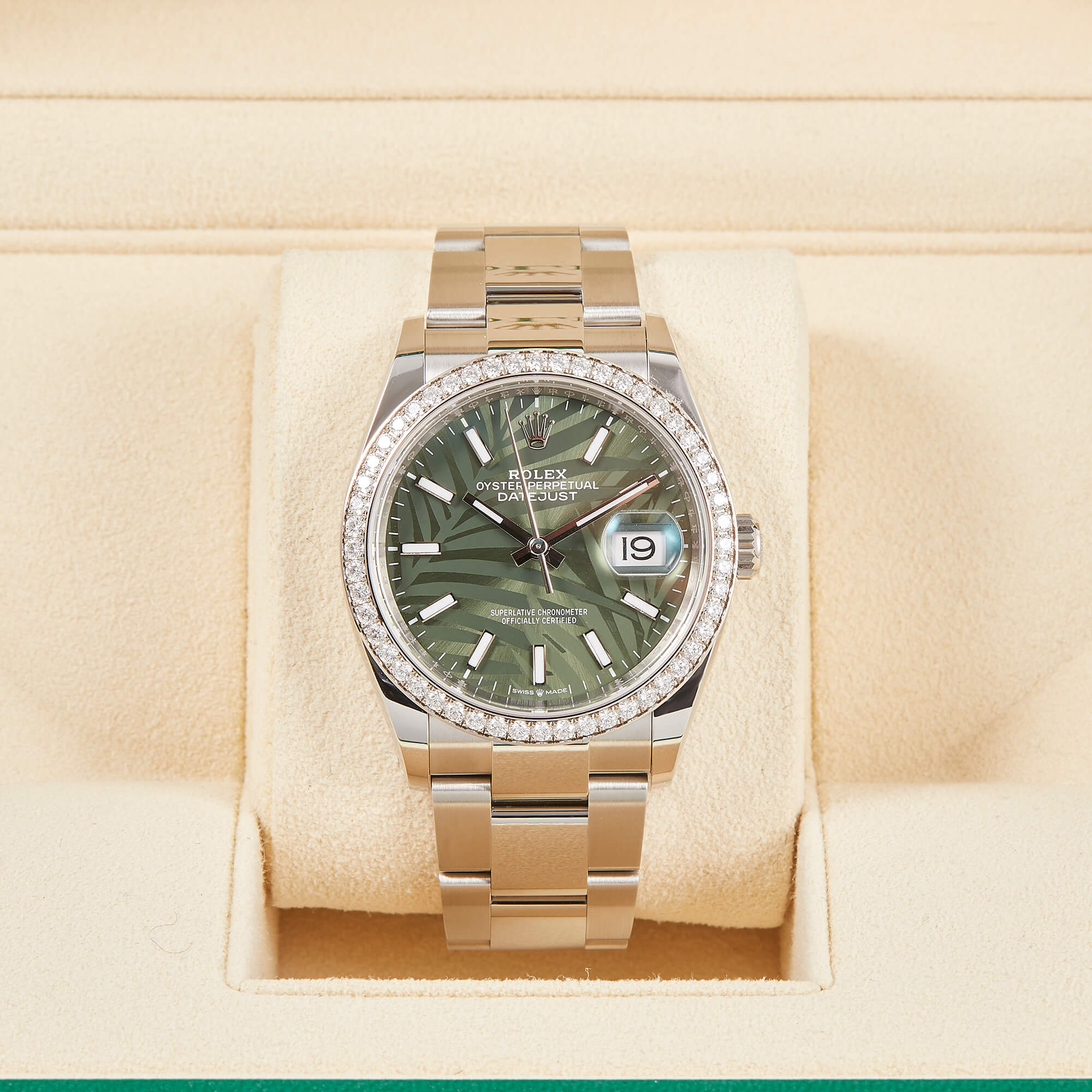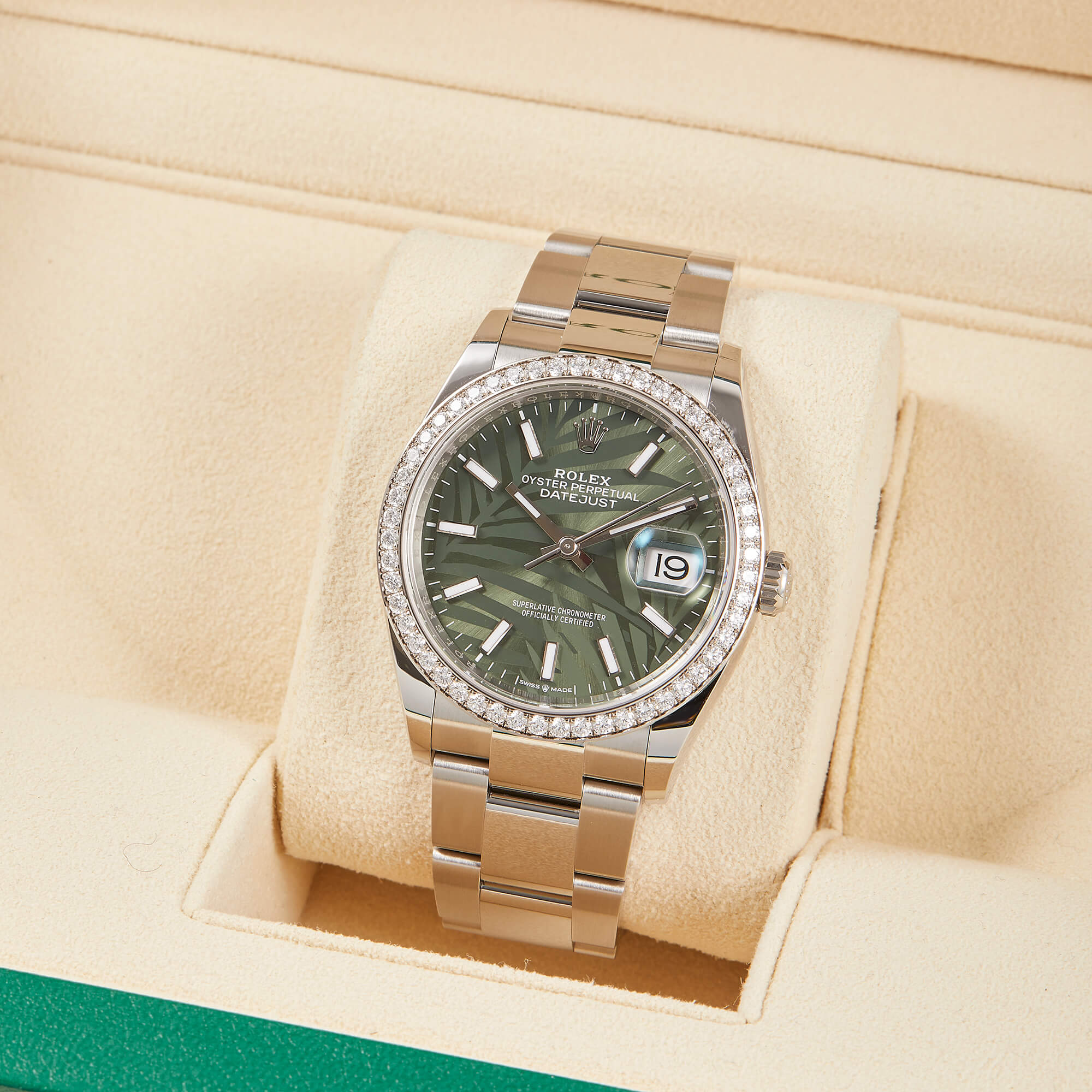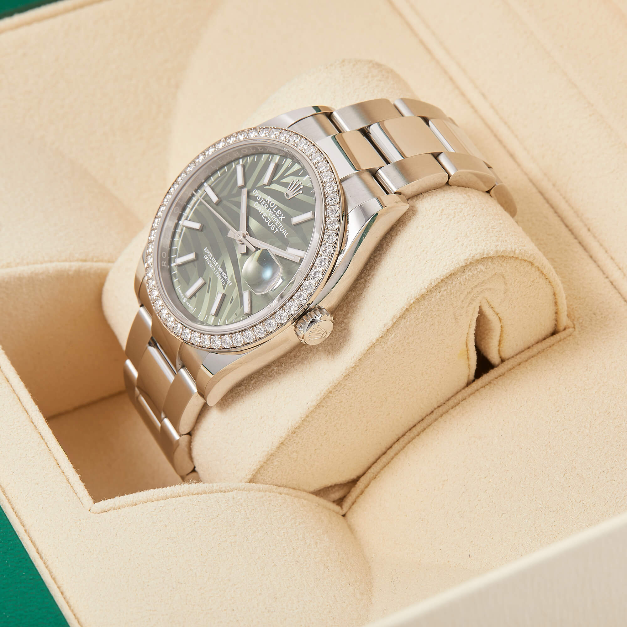Die Rolex Datejust 36 Referenz 126284RBR begeistert mit ihrem grünen Palmezifferblatt und der funkelnden Diamantlünette, die ihr einen luxuriösen, ausdrucksstarken Auftritt verleiht. Die Uhr wird inklusive Box und Papieren geliefert und vereint markante Eleganz mit zuverlässiger Automatik – ein besonderes Highlight in zeitlosem Design.- Durchmesser