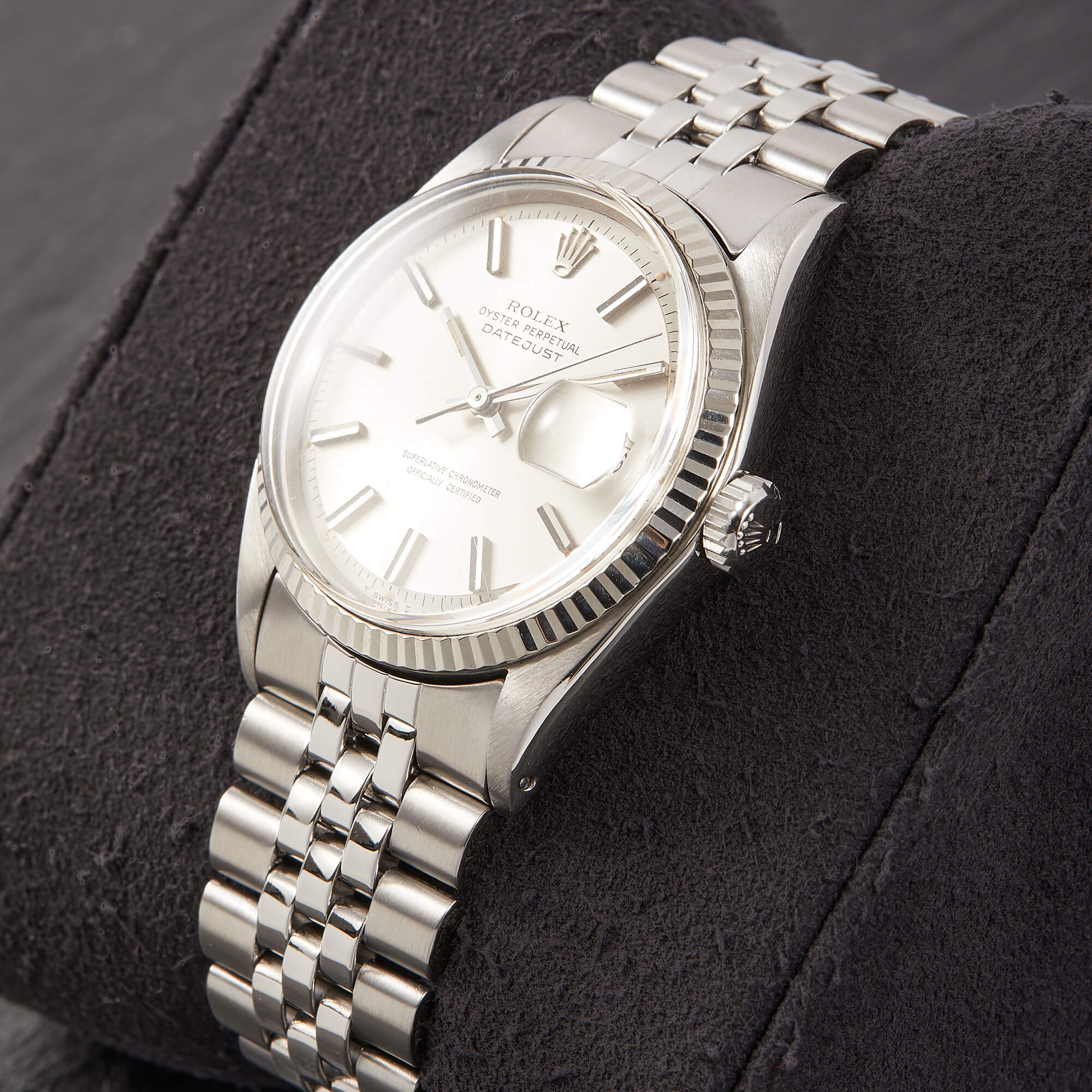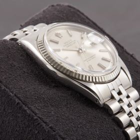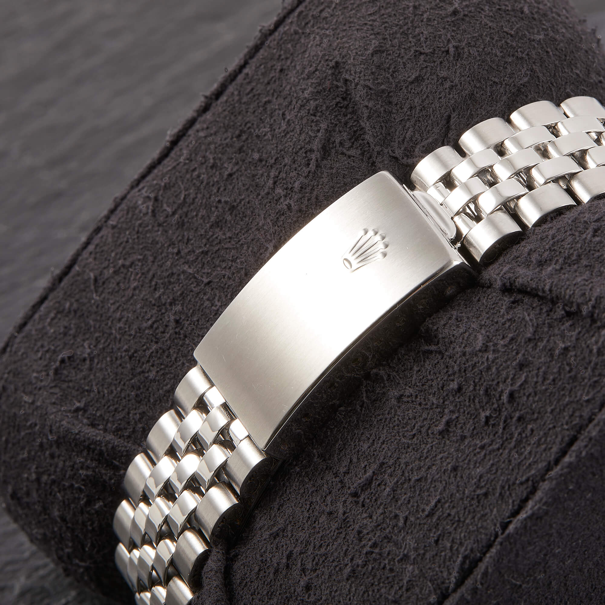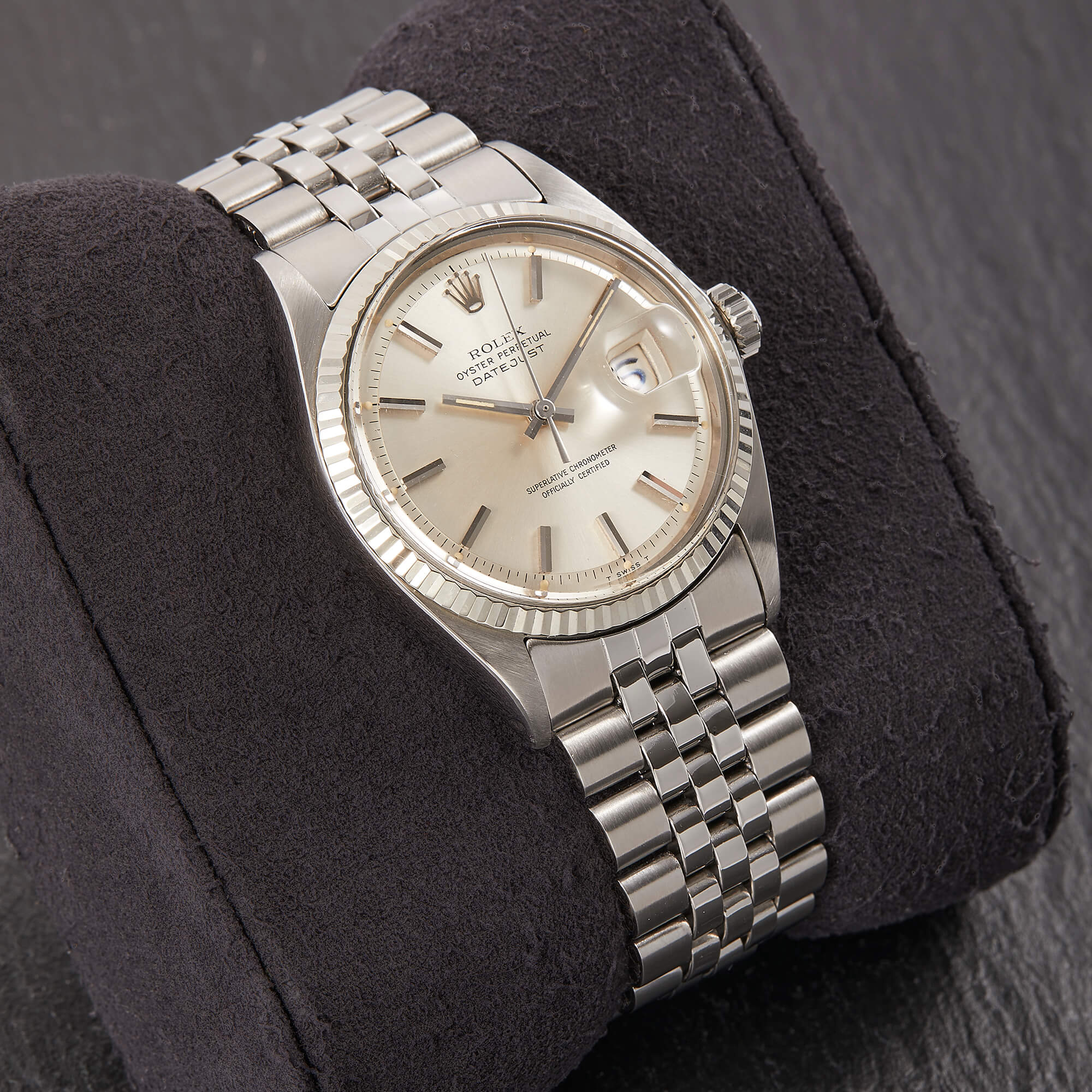 Die Rolex Datejust 1601 ist eine der ikonischsten Vintage-Referenzen der Marke. Dieses Exemplar präsentiert sich in gutem Zustand mit einem silbernen Zifferblatt in seltener Step-Dial-Optik – erkennbar an der leicht abgesenkten Minuterie, die dem Blatt Tiefe und Eleganz verleiht. Das originale Jubilee-Faltband unterstreicht den authentischen Charakter der Uhr und sorgt für hohen Tragekomfort. Mit ihrer klassischen 36 mm Gehäusegröße, dem geriffelten Weißgold-Lünettenrand und dem automatischen Kaliber 1570 bleibt die 1601 ein zeitloser Begleiter – dezent, stilvoll und sammelwürdig.- Durchmesser