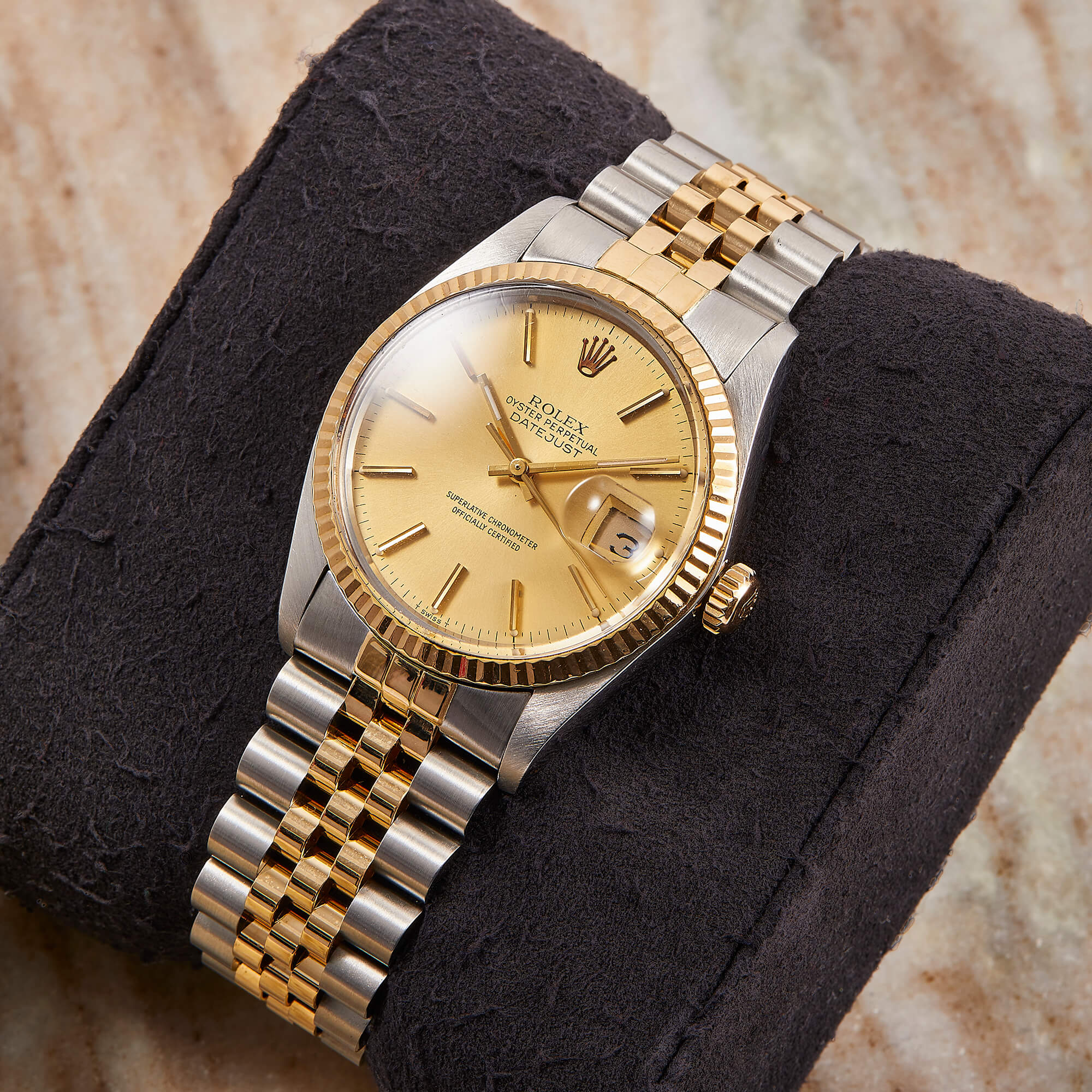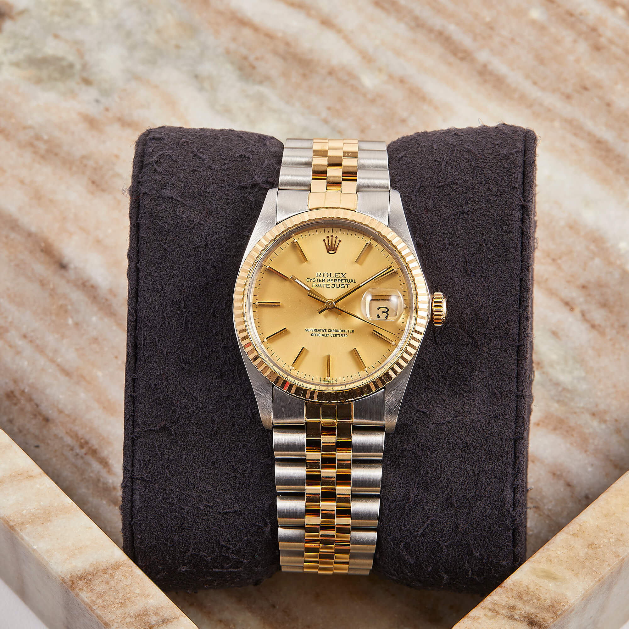 Zeitlose Rolex Datejust Referenz 16013 in Stahl-Gelbgold mit champagnerfarbenem Zifferblatt, welche sich in einem schönen Zustand befindet. Ein eleganter Klassiker mit Charakter.- Durchmesser