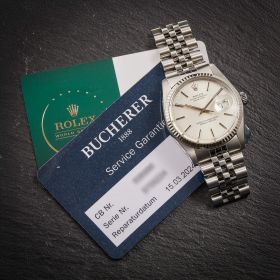 Diese elegante Datejust 16014 überzeugt mit einem schönen silbernem Zifferblatt und originalem Jubilee-Band. Die Uhr befindet sich in sehr schönem Zustand.- Durchmesser