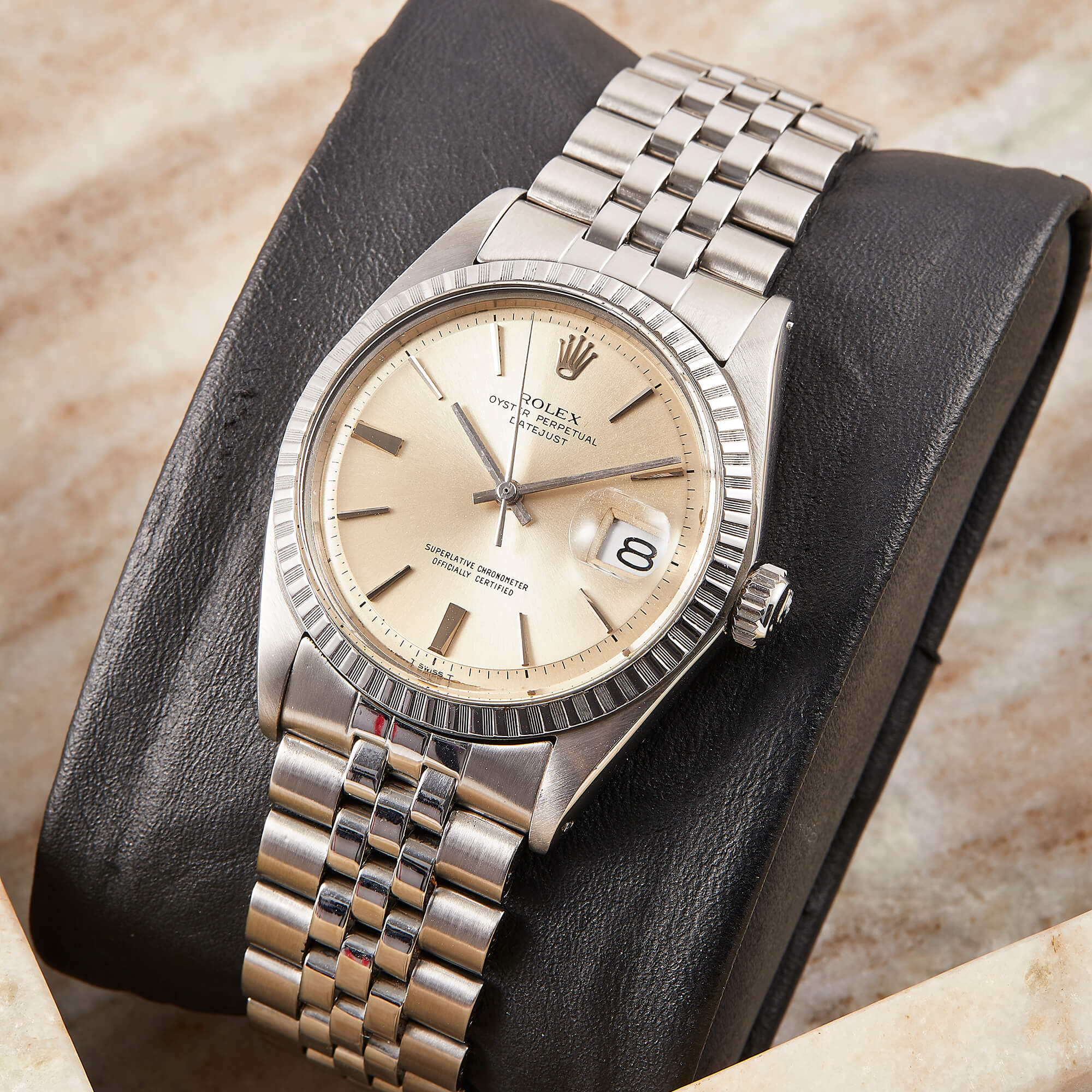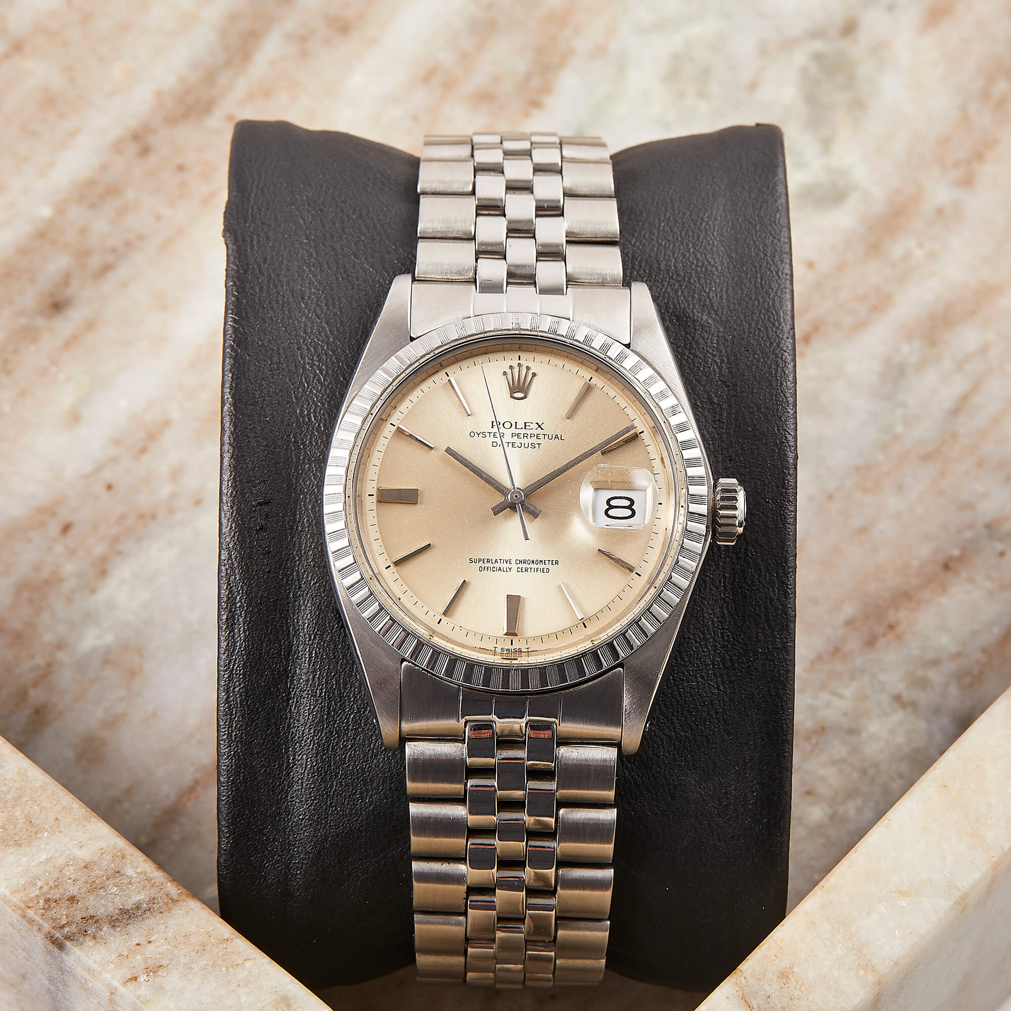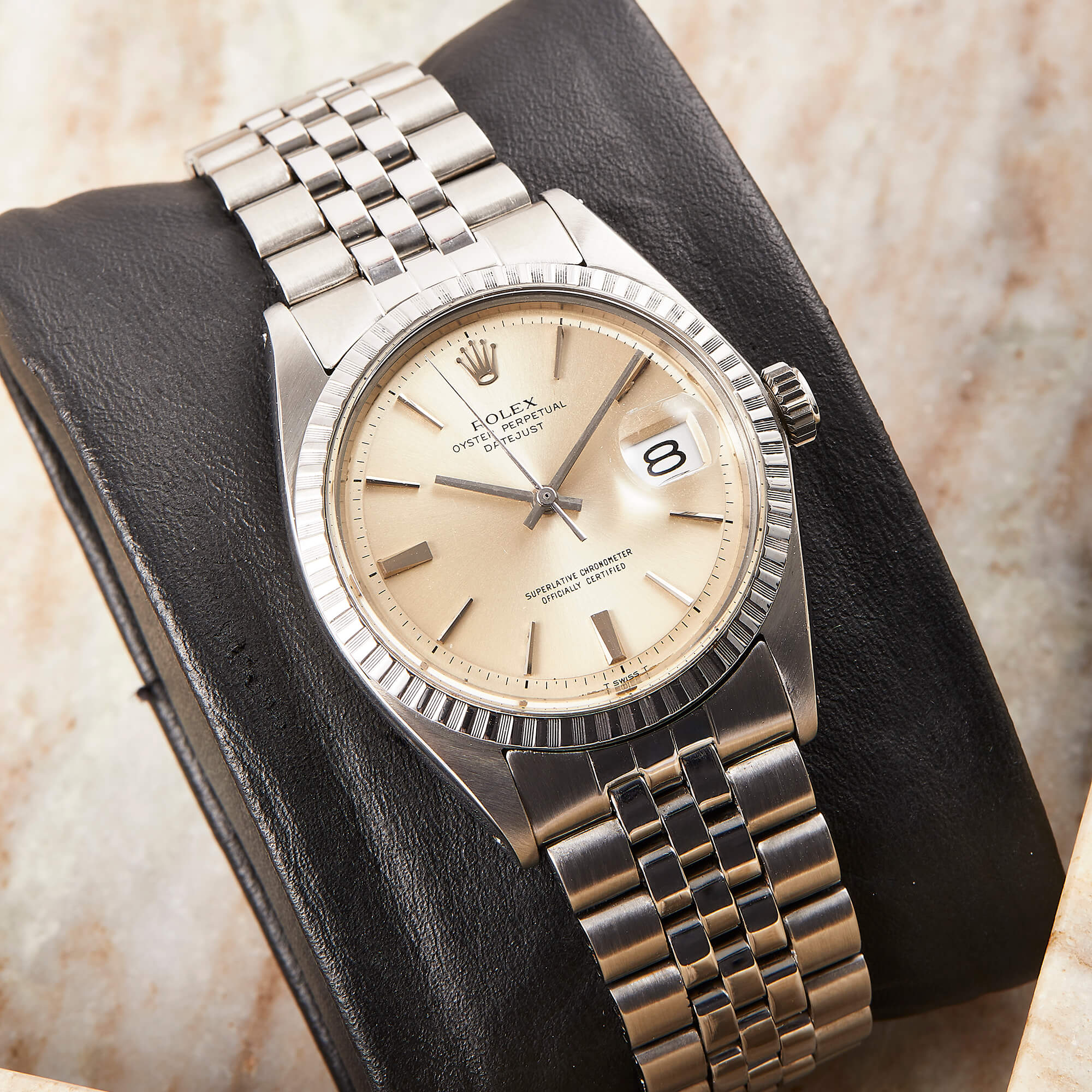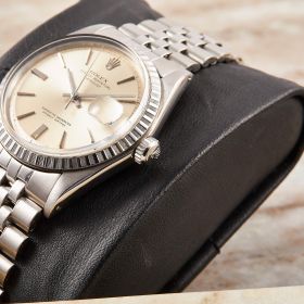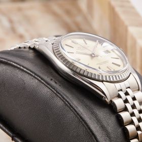 Die Rolex Datejust 36 Referenz 1603 ist ein klassisches Modell, ausgestattet mit einem eleganten Jubileeband und einer geriffelten Stahllünette. Das Zifferblatt weißt eine schöne Patina auf. Sie kommt mit den originalen Papieren - ein zeitloses Stück für wahre Rolex-Liebhaber.- Durchmesser