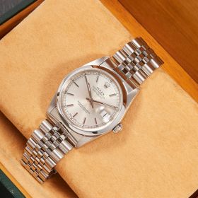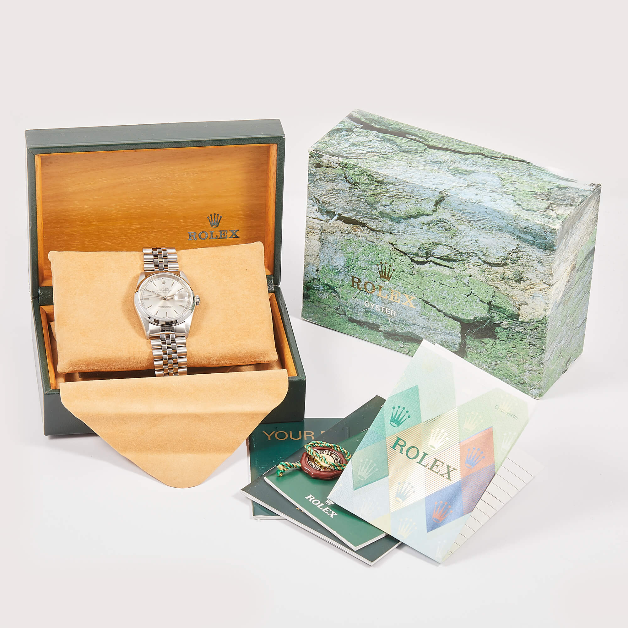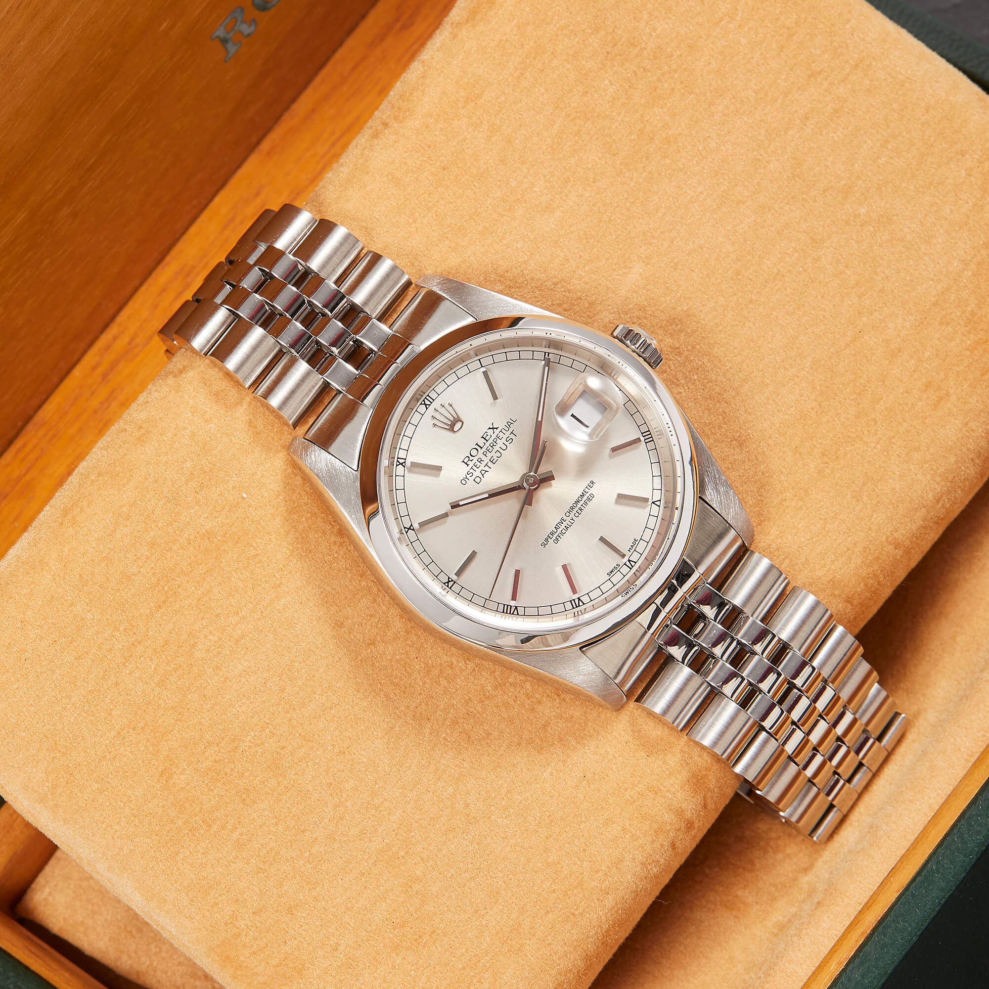 Die Rolex Datejust Referenz 16200 überzeugt mit einem klassischen 36 mm Edelstahlgehäuse und dem sportlichen Jubileeband. Das silberfarbene Zifferblatt ist mit eleganten Strichindizes ausgestattet und verleiht der Uhr eine edle Ausstrahlung. Im Inneren sorgt das bewährte Automatikwerk Kaliber 3135 für präzise und zuverlässige Leistung. Originale Garantiepapiere liegen bei und unterstreichen die Authentizität dieses zeitlosen Modells.- Durchmesser