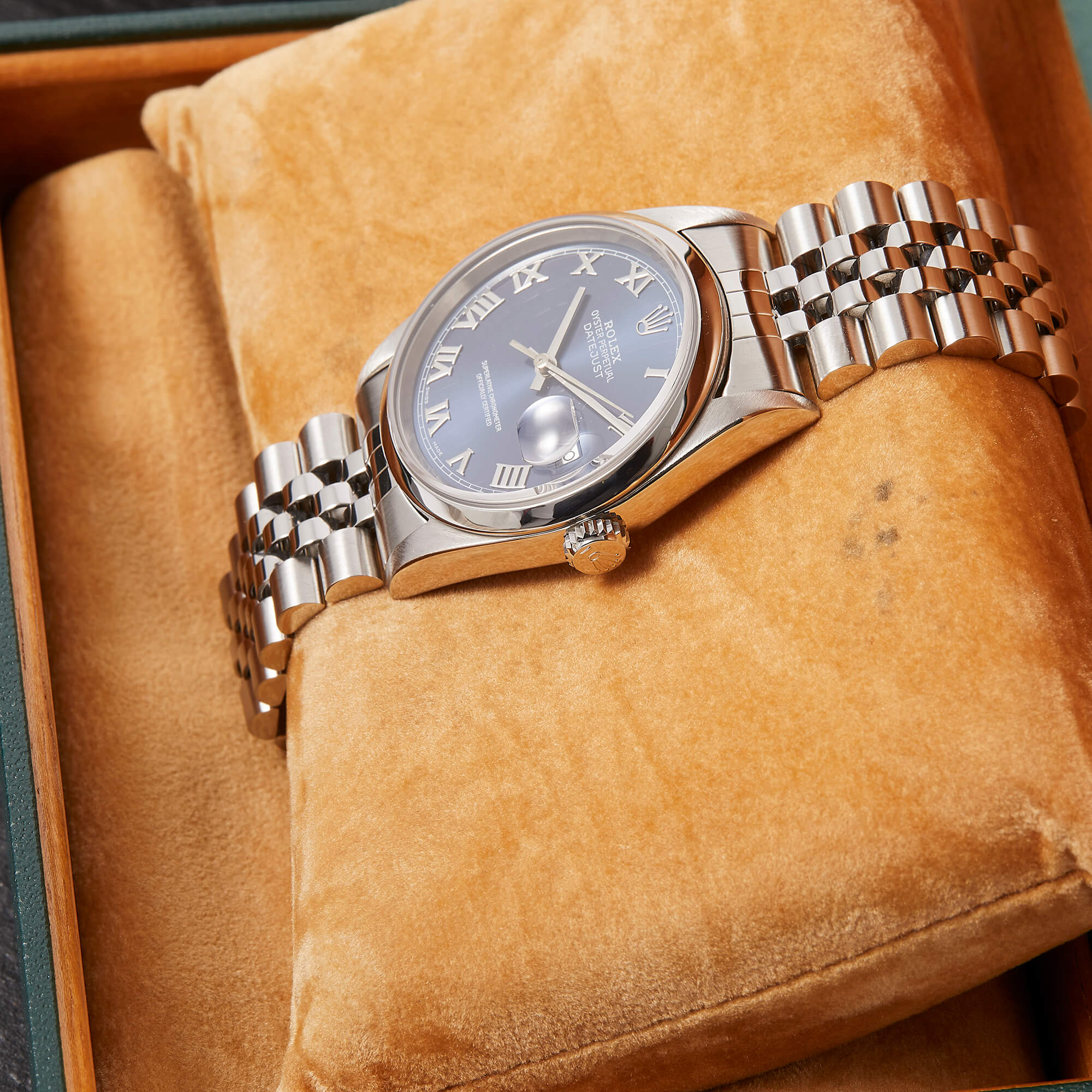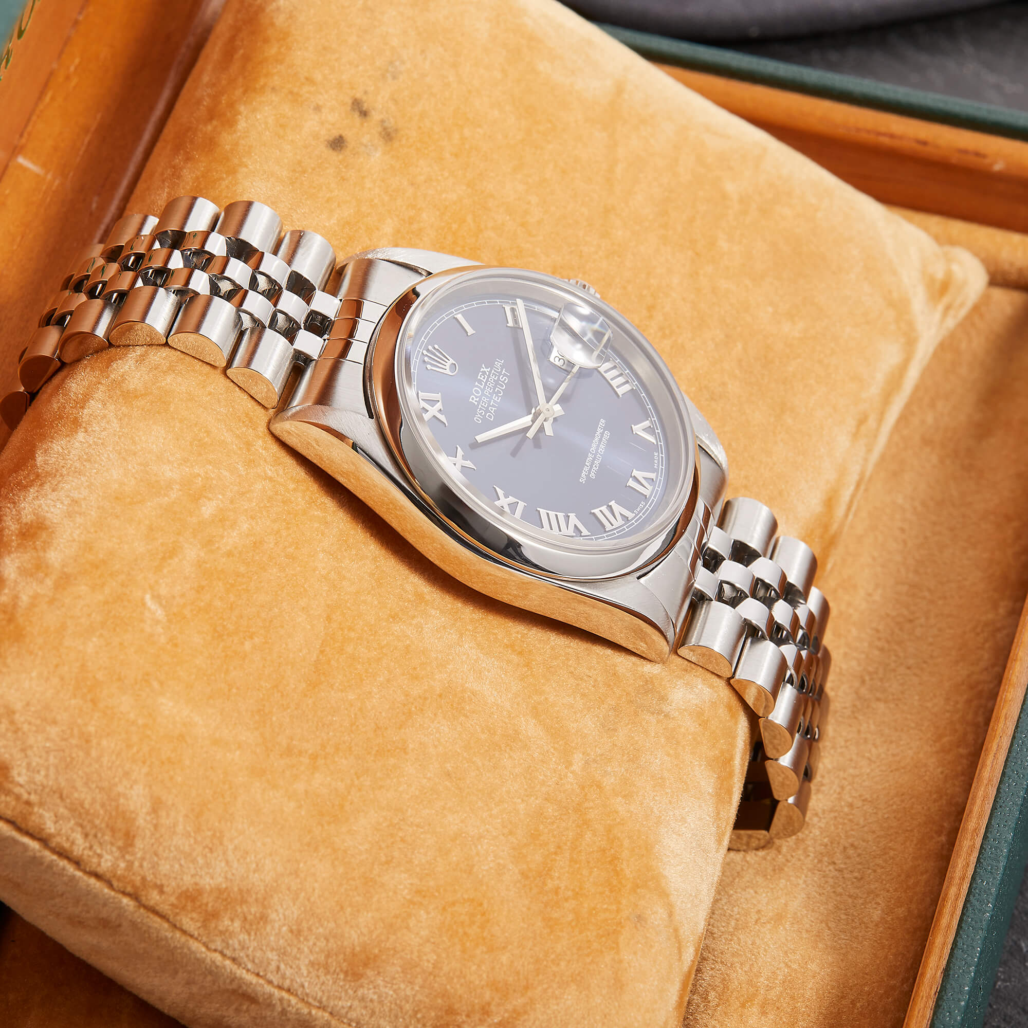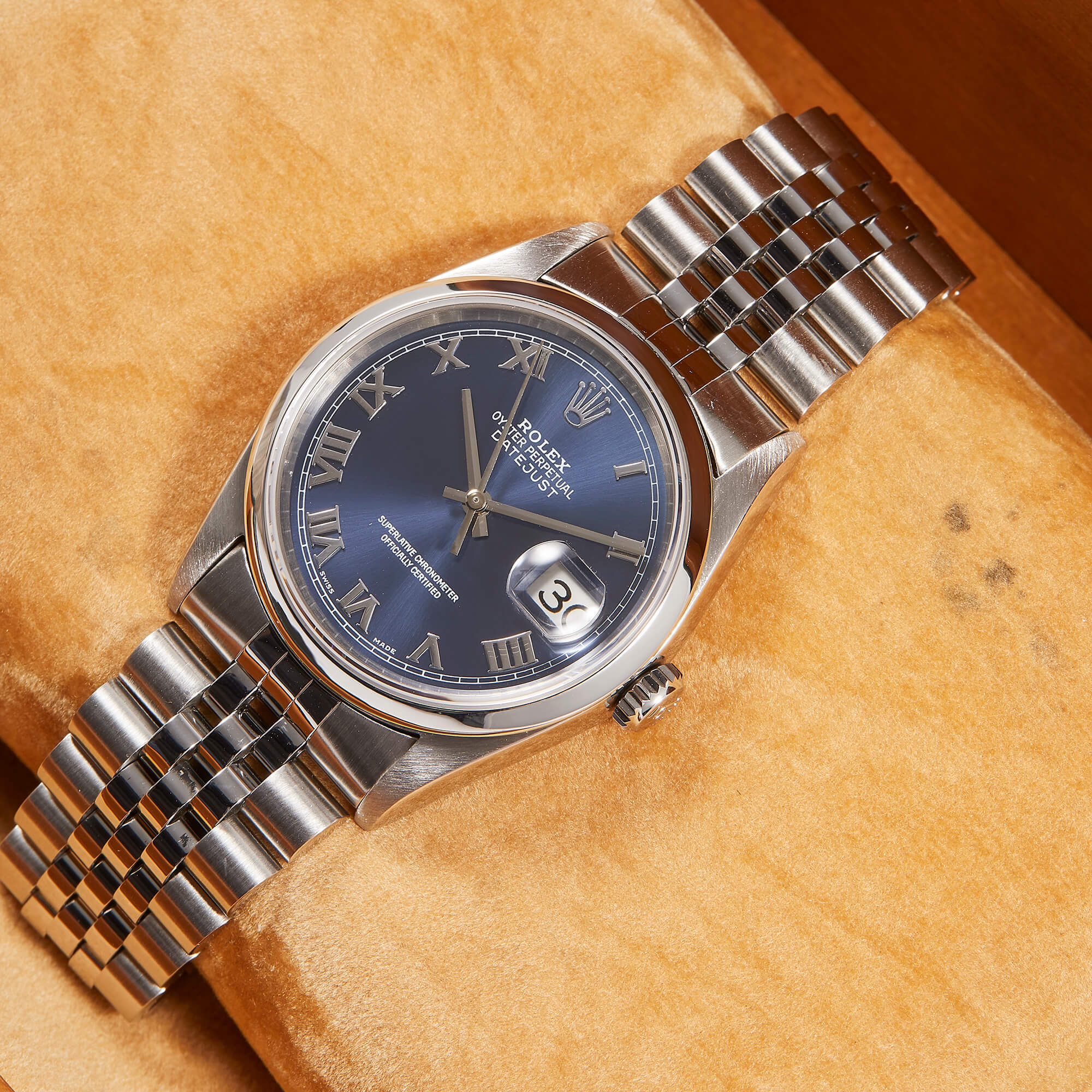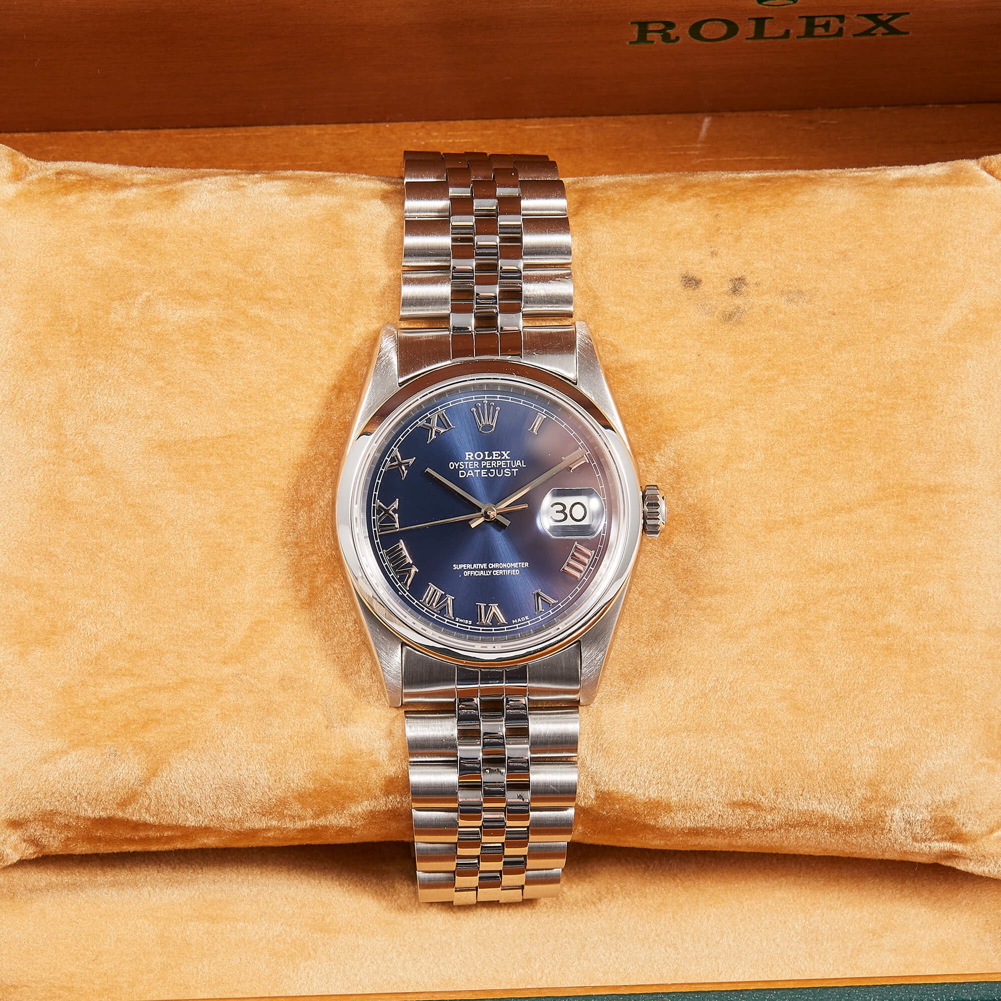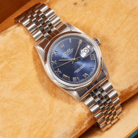 Die Rolex Datejust Referenz 16200 überzeugt mit einem klassischen 36 mm Edelstahlgehäuse und dem sportlichen Jubileeband. Das blaue Zifferblatt ist mit eleganten römischen Indizes ausgestattet und verleiht der Uhr eine edle Ausstrahlung. Im Inneren sorgt das bewährte Automatikwerk Kaliber 3135 für präzise und zuverlässige Leistung. Originale Garantiepapiere liegen bei und unterstreichen die Authentizität dieses zeitlosen Modells.- Durchmesser