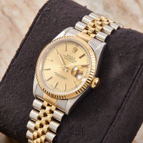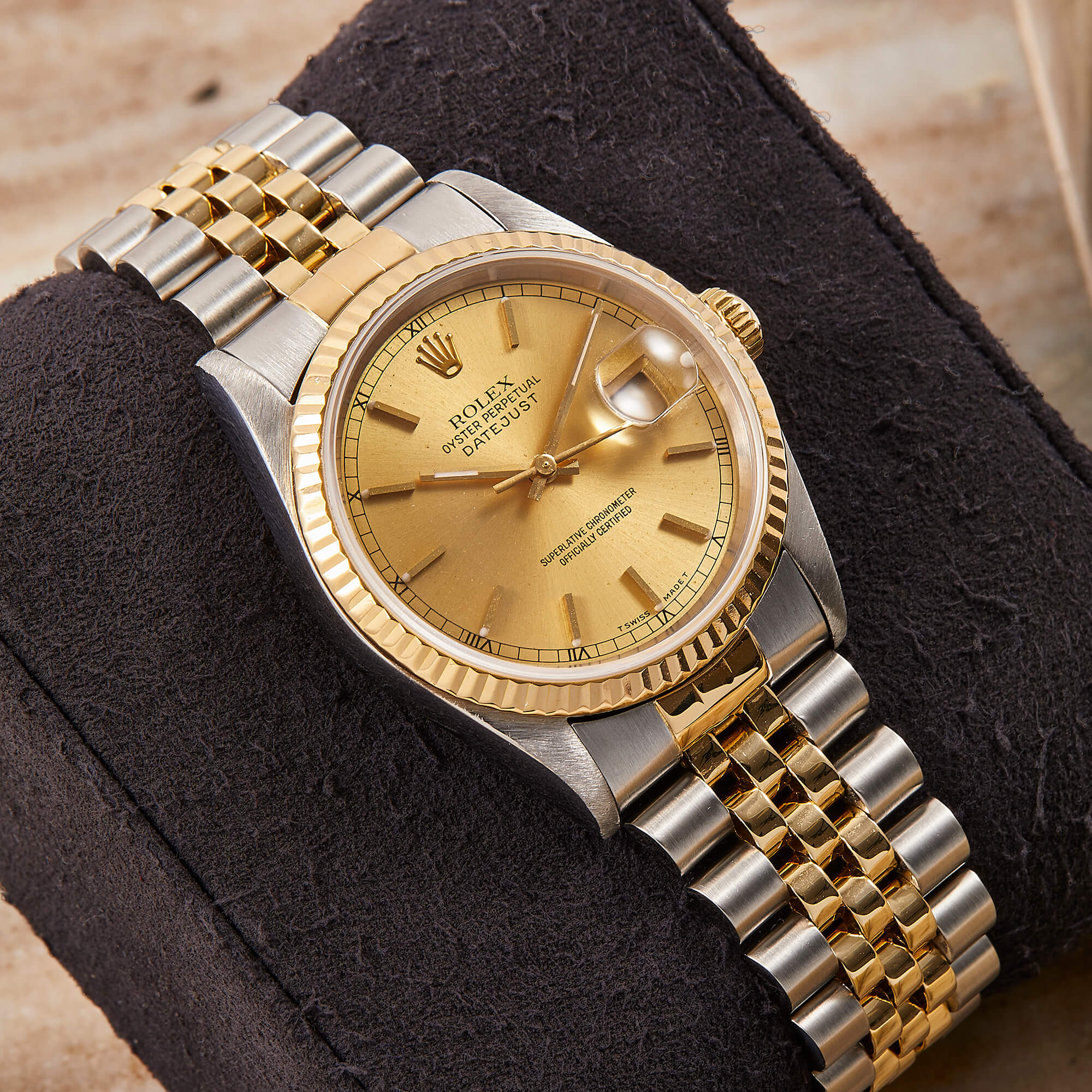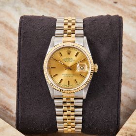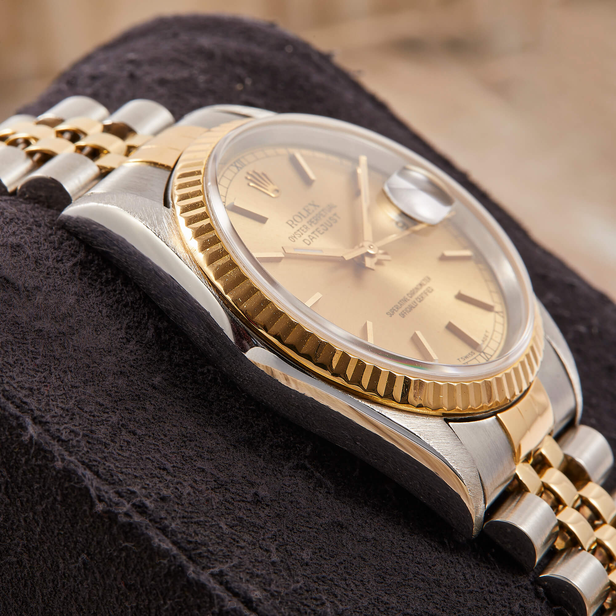 Zeitlose Rolex Datejust Referenz 16233 in Stahl-Gelbgold mit champagnerfarbenem Zifferblatt, welche sich in einem schönen Zustand befindet. Ein eleganter Klassiker mit Charakter. Inkl. originalen Garantieunterlagen.- Durchmesser