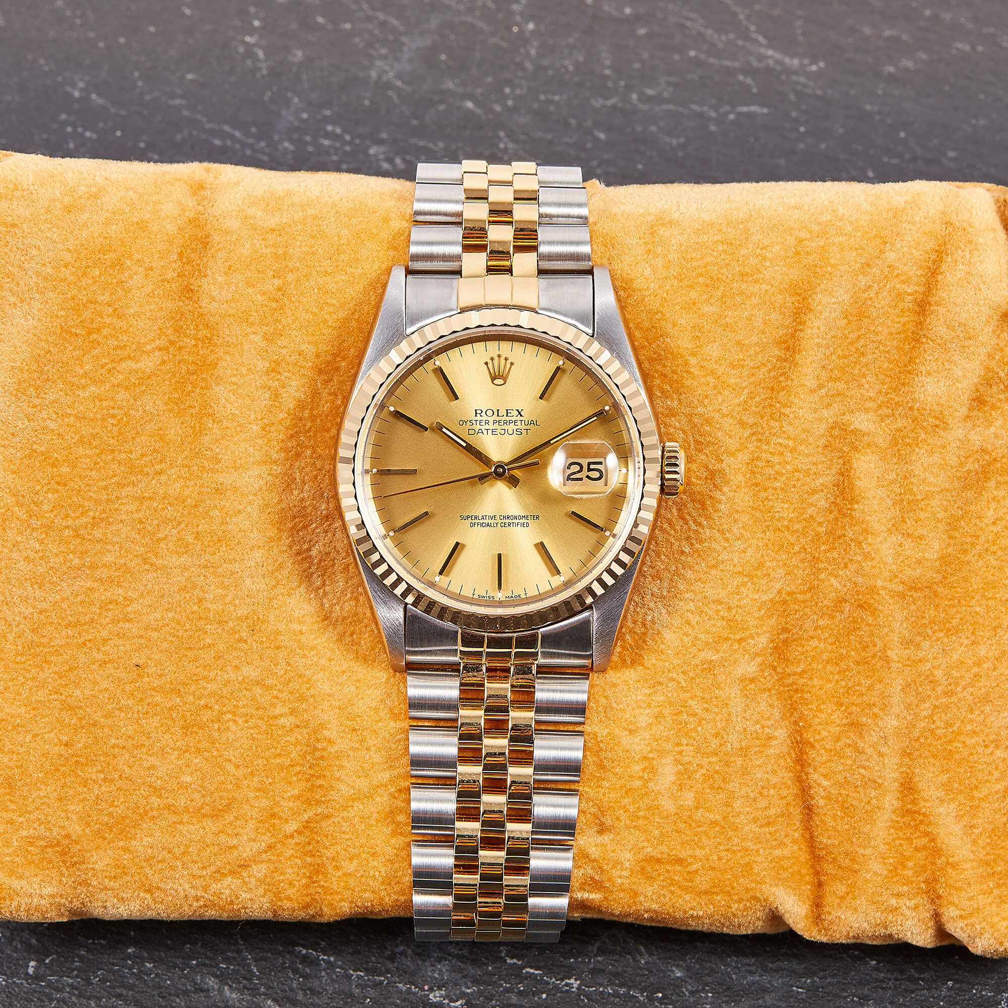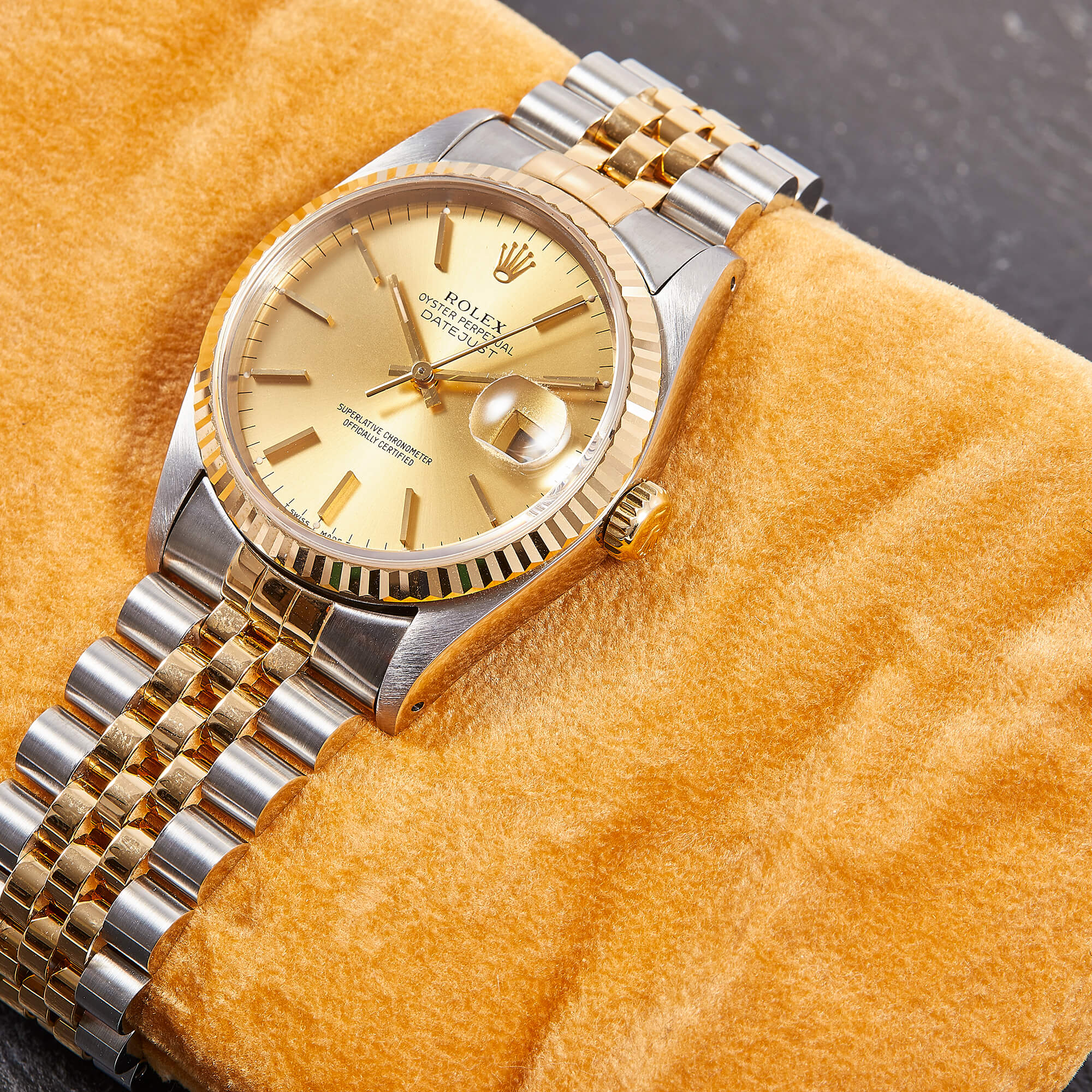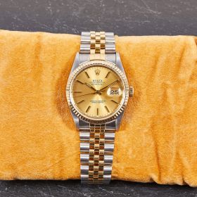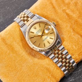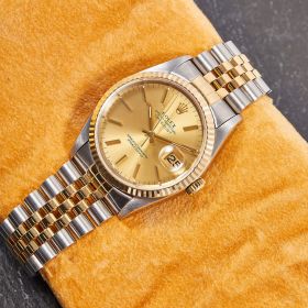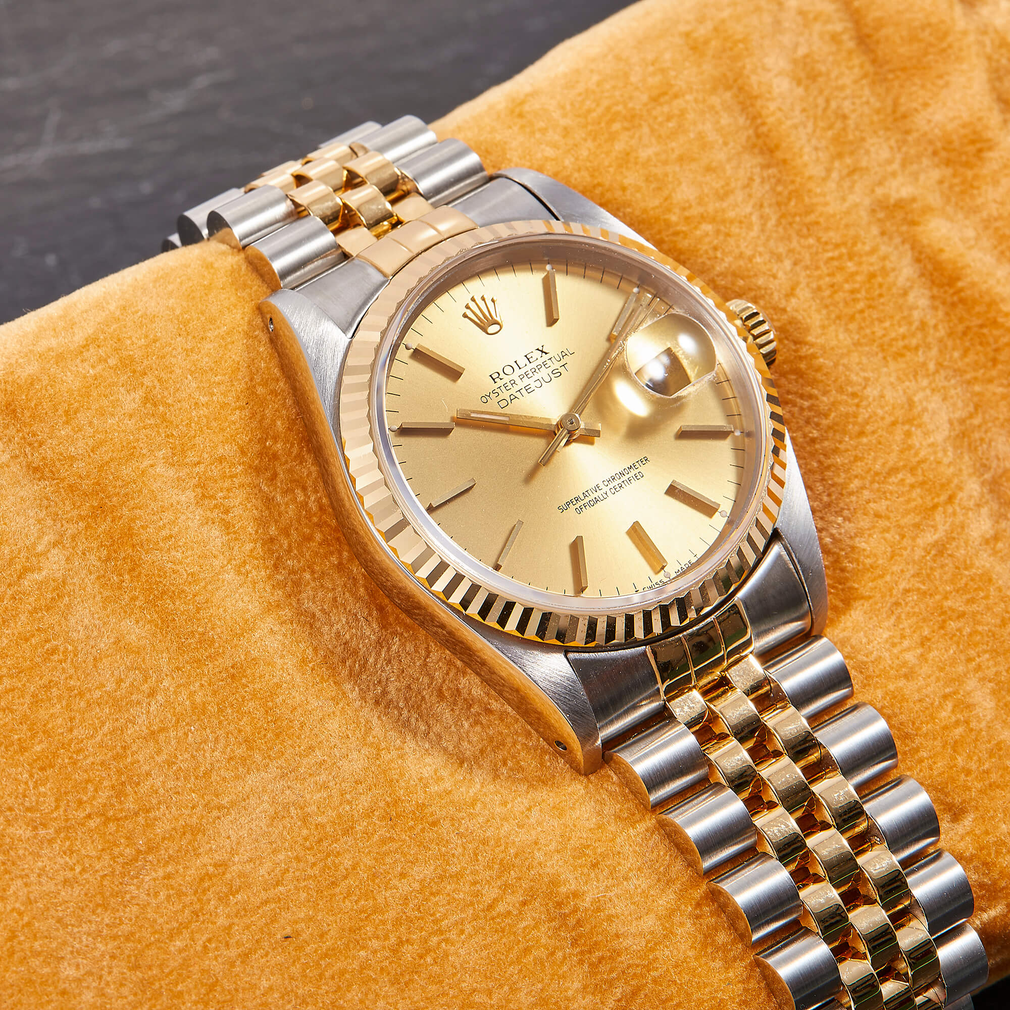 Zeitlose Rolex Datejust Referenz 16233 in Stahl-Gelbgold mit champagnerfarbenem Zifferblatt, welche sich in einem schönen Zustand befindet. Ein eleganter Klassiker mit Charakter.- Durchmesser