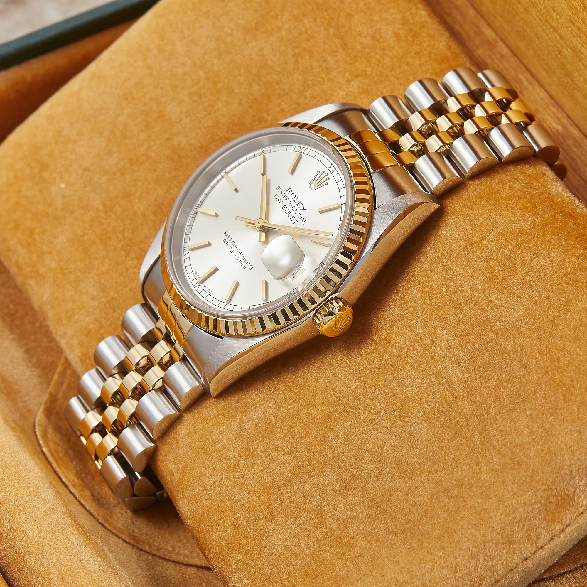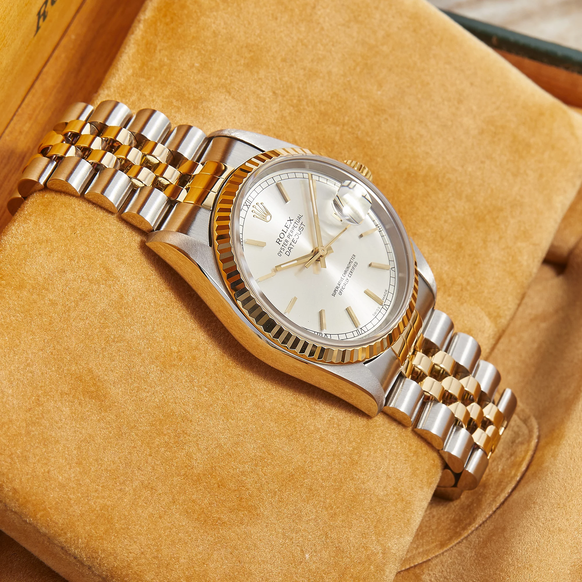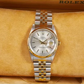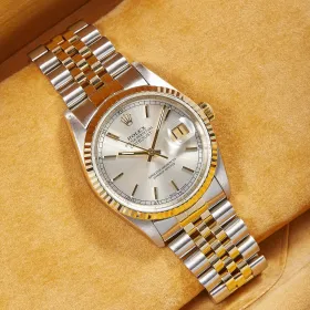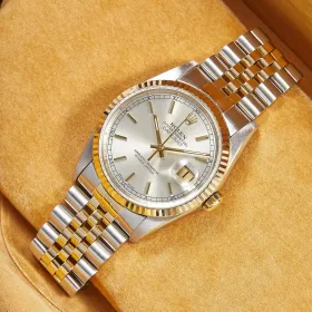 Zeitlose Rolex Datejust Referenz 16233 in Stahl-Gelbgold mit silbernem Zifferblatt inkl. Strichindizes, welche sich in einem schönen Zustand befindet. Ein eleganter Klassiker mit Charakter.- Durchmesser