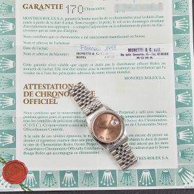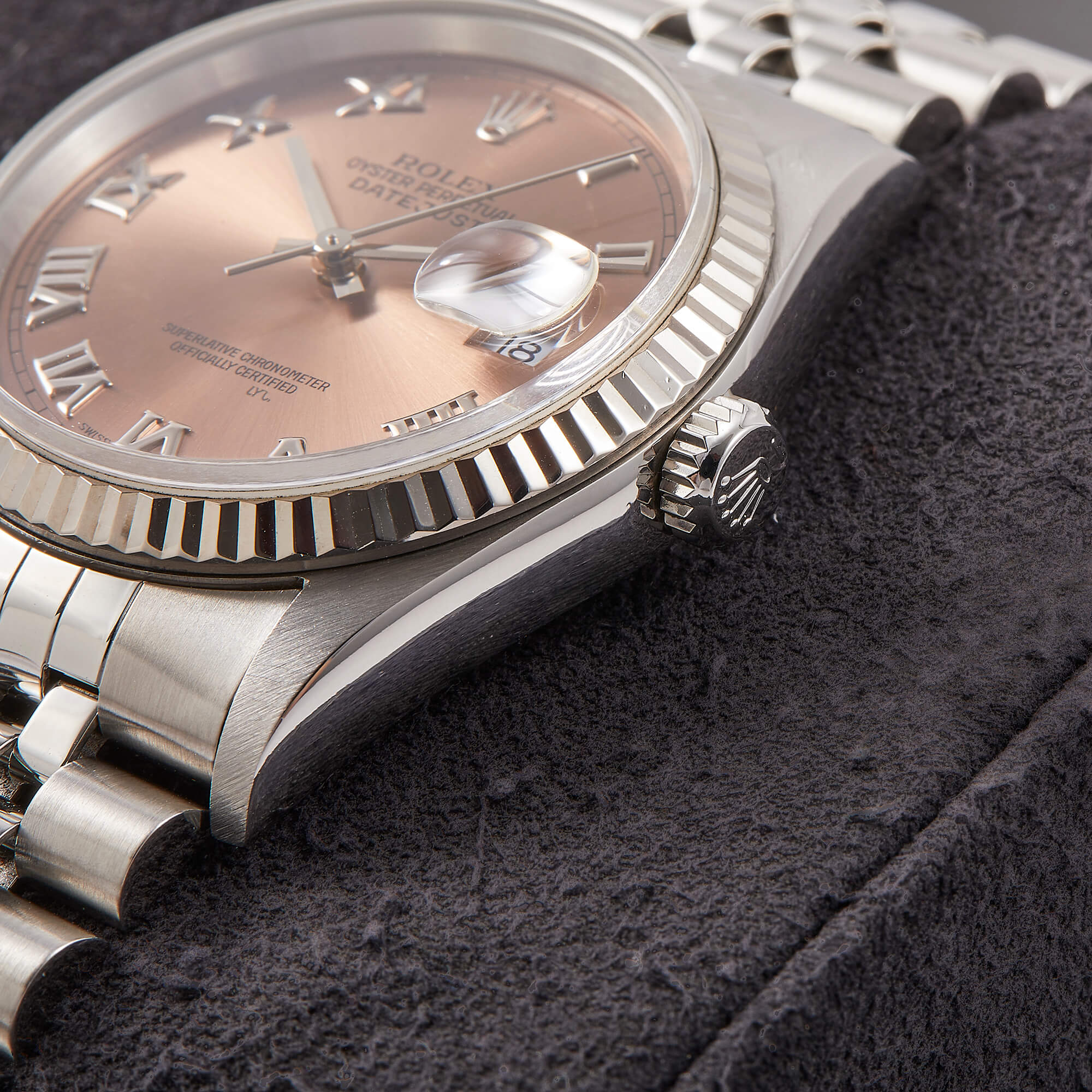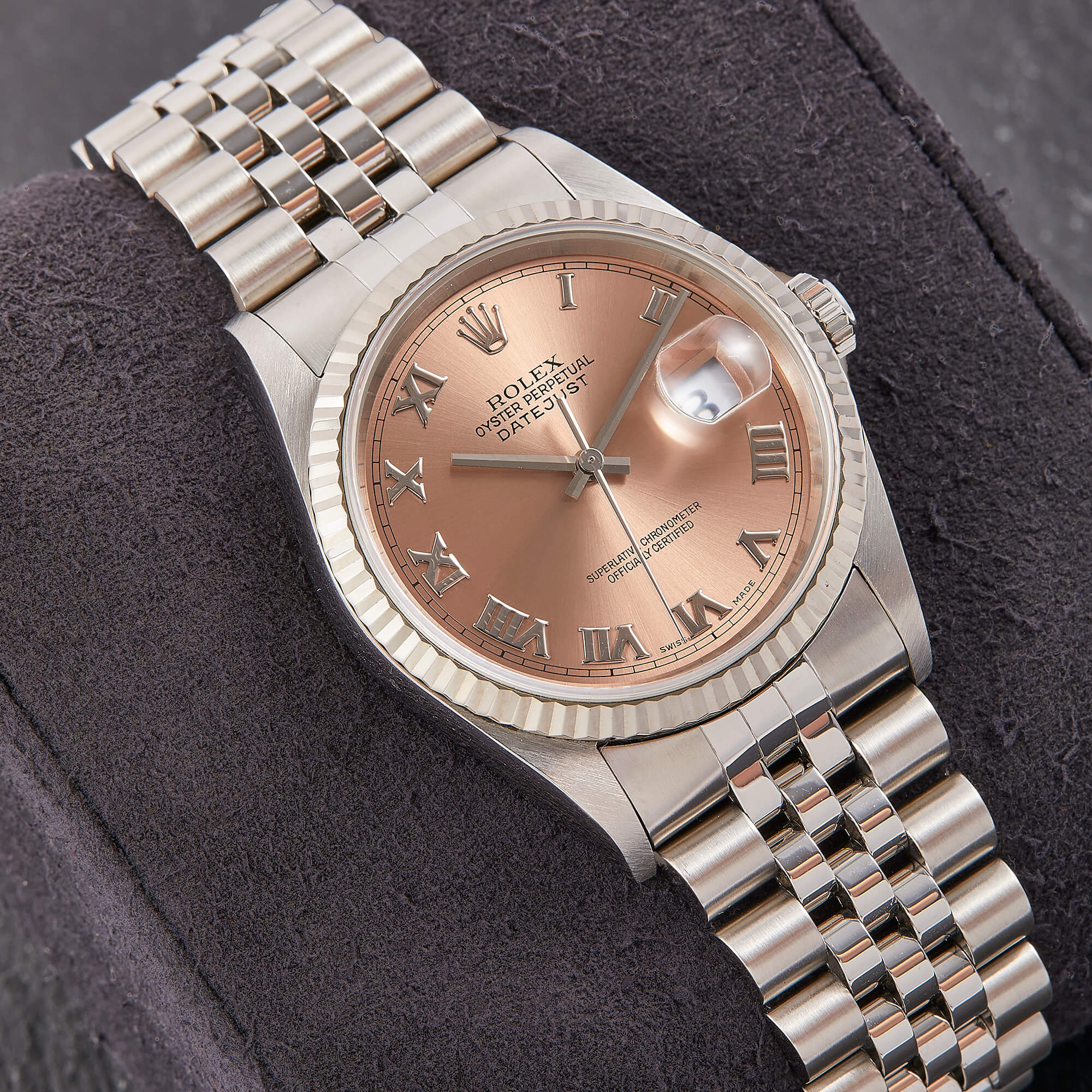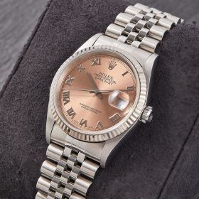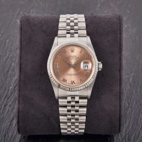 Diese elegante Datejust 16234 überzeugt mit einem schönen rosafarbenem Zifferblatt mit römischen Indizes und originalem Jubilee-Band. Die Uhr befindet sich in sehr schönem Zustand und kommt inklusive der originalen Papiere – ein klassisches Modell mit besonderem Charme.- Durchmesser