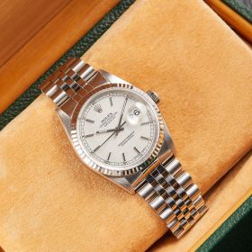 Zeitlose Rolex Datejust Referenz 16234 in Stahl mit silbernem Leinen-Zifferblatt inkl. Strichindizes, welche sich in einem schönen Zustand befindet. Ein eleganter Klassiker mit Charakter. Die Uhr wird im Fullset geliefert.- Durchmesser
