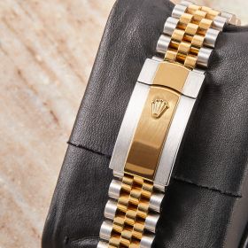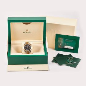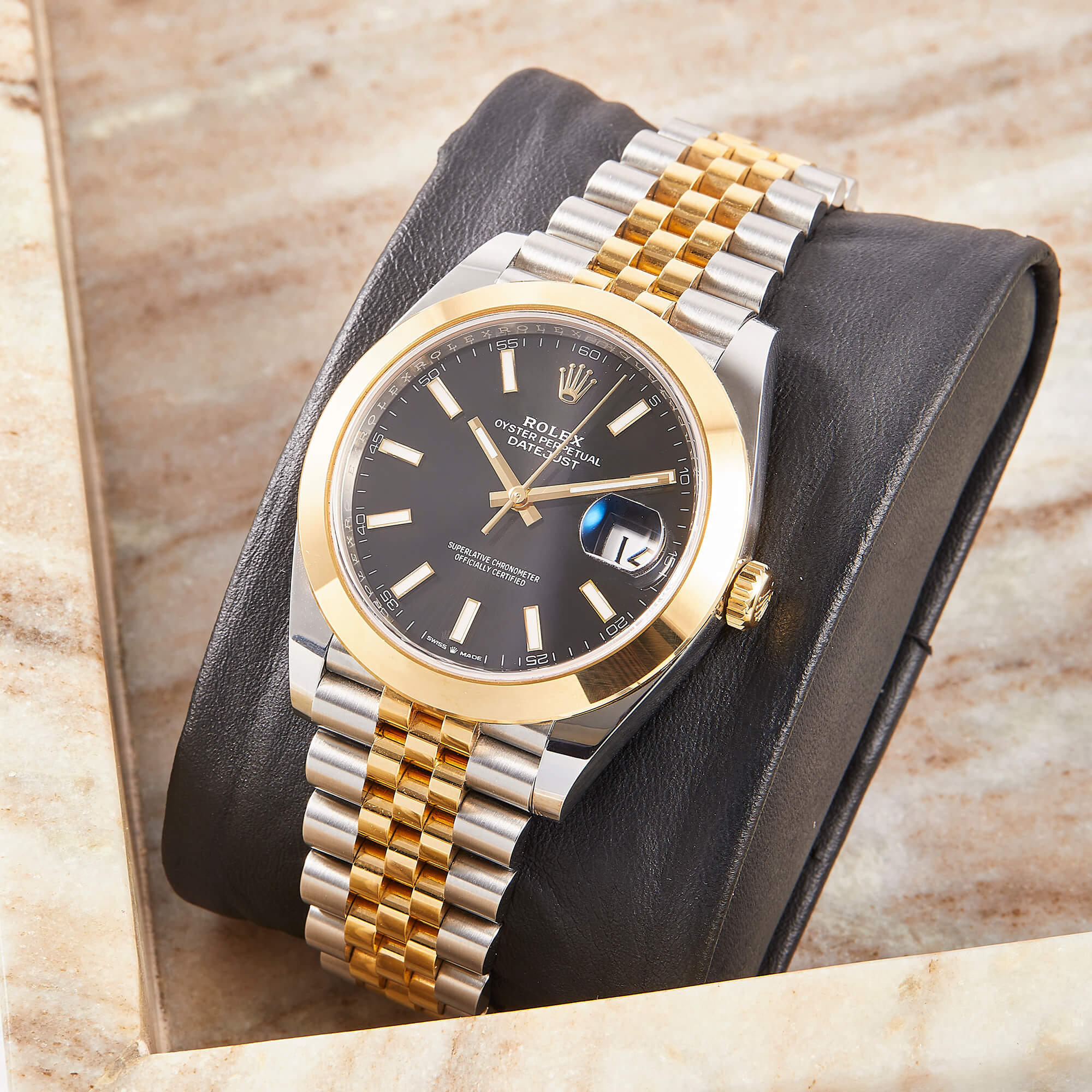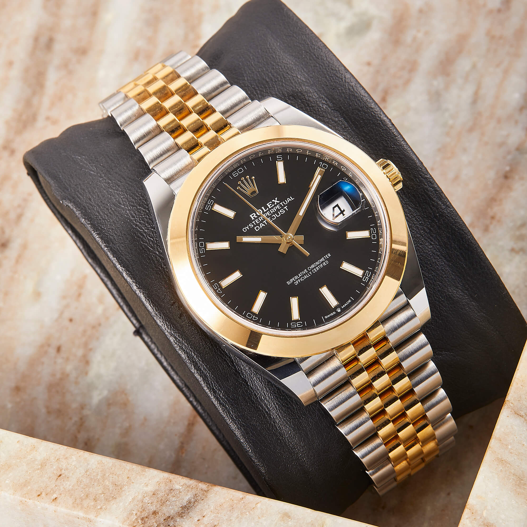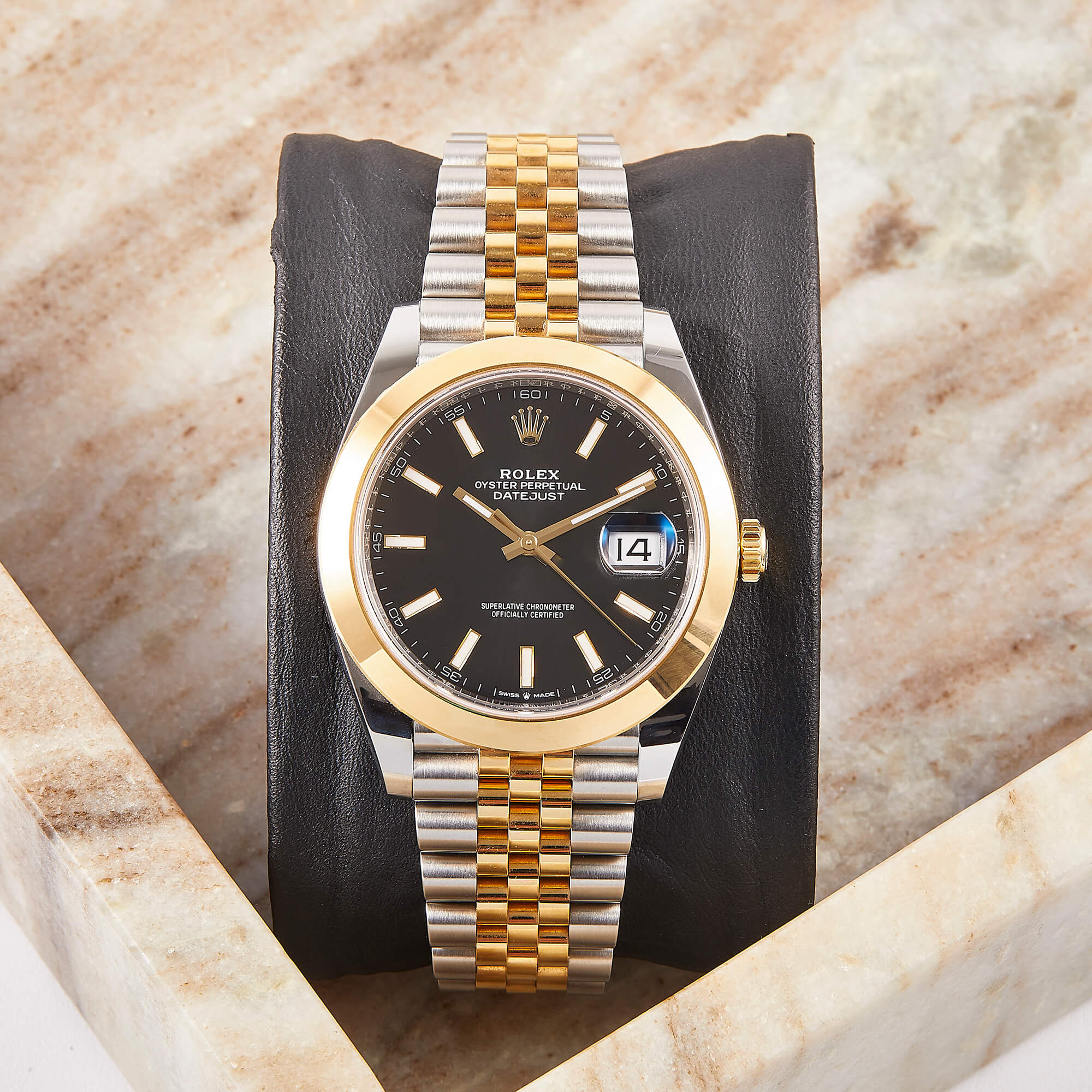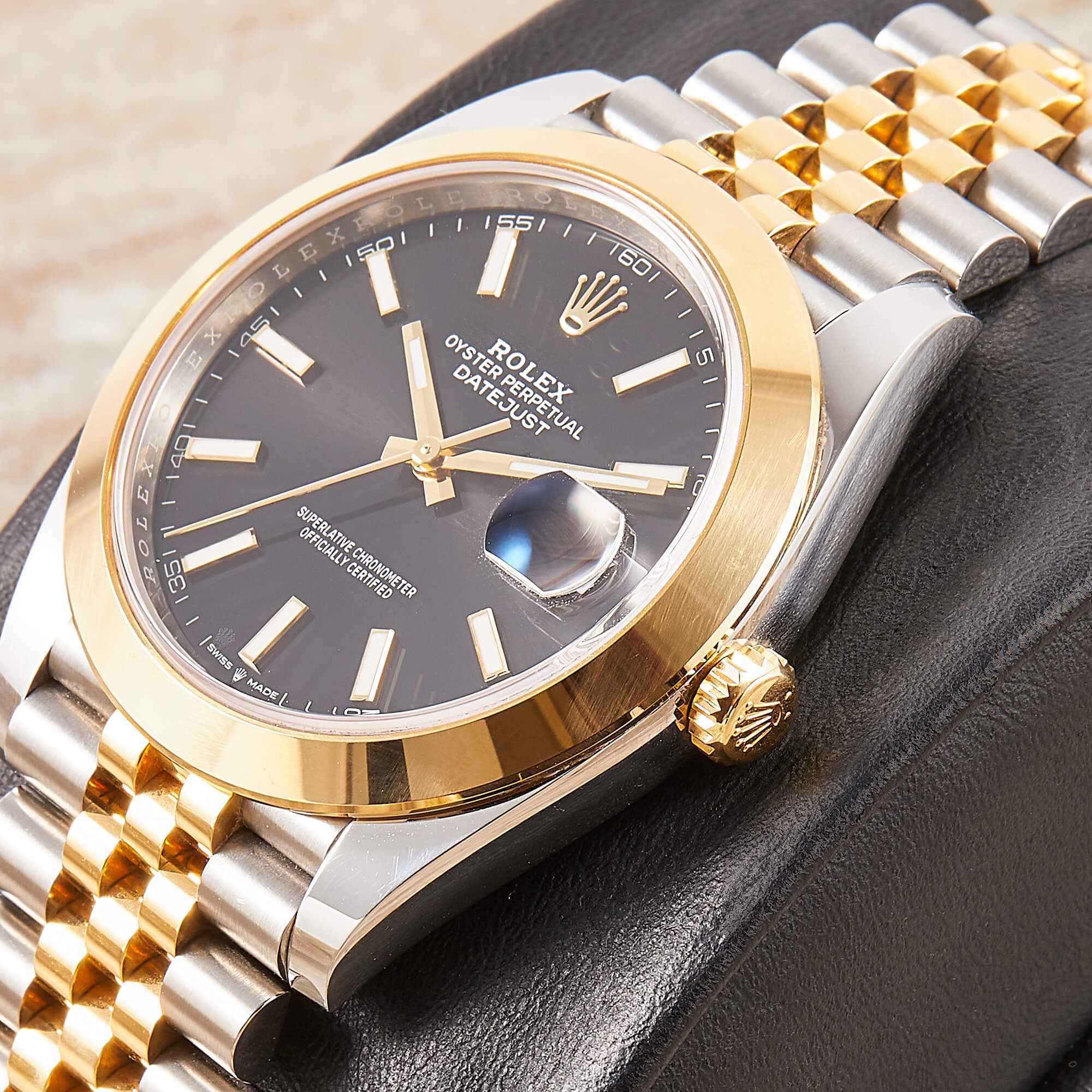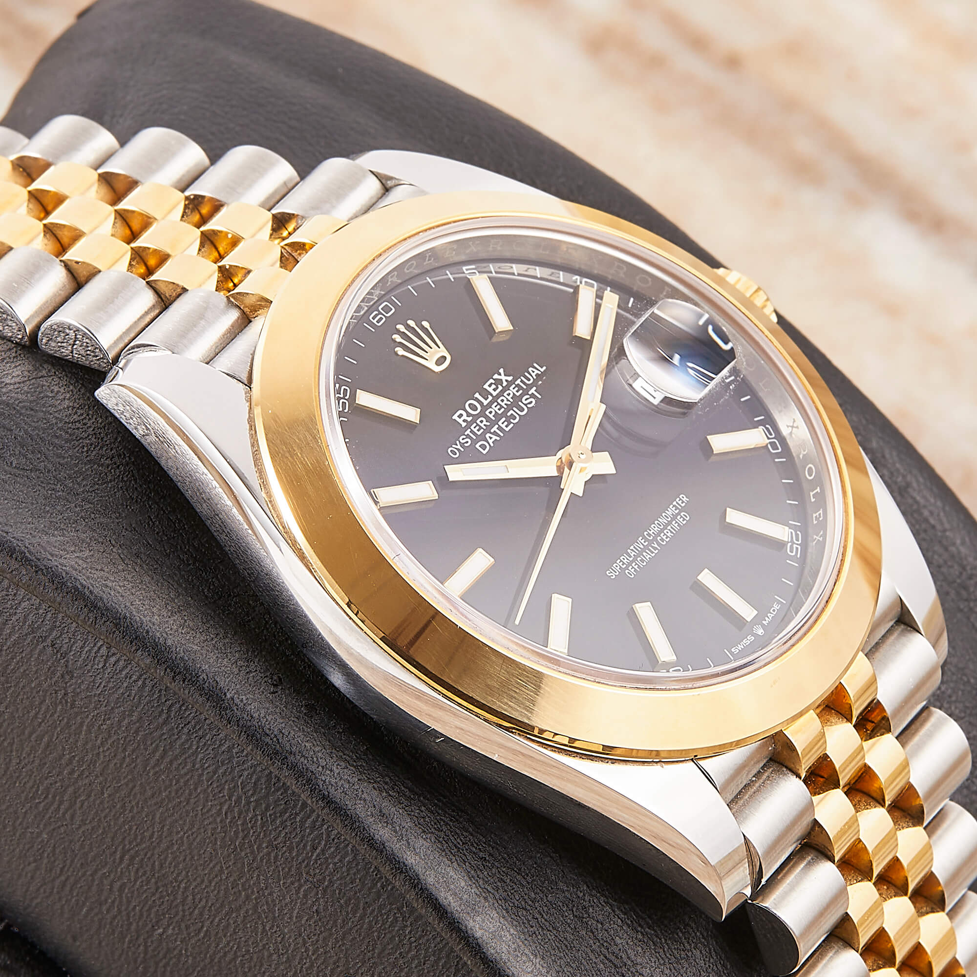 Rolex Datejust 41, Referenz 126303, mit Gelbgoldlünette, beliebtem Jubileeband und dem klassischen schwarzen Zifferblatt. Die Uhr wird im Fullset angeboten und vereint klassische Eleganz mit zeitloser Rolex-Ästhetik – ein besonders attraktives Modell für Sammler und Liebhaber.- Durchmesser