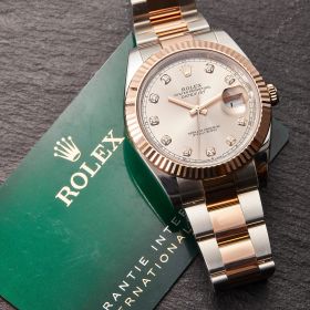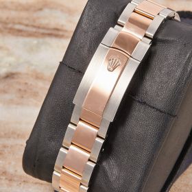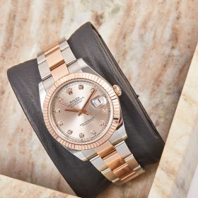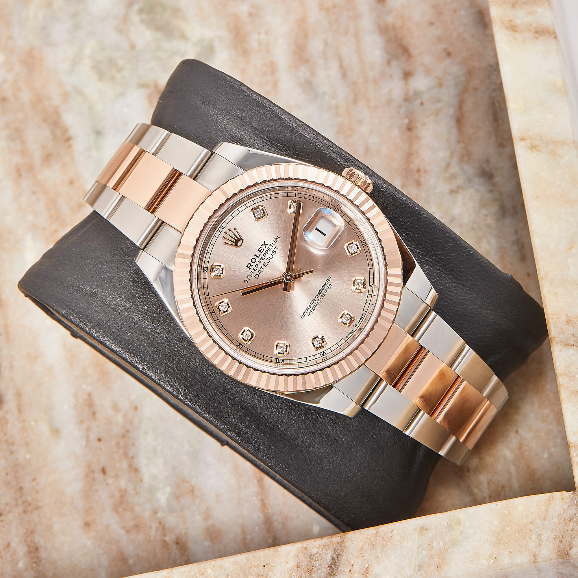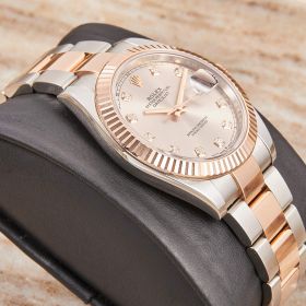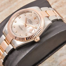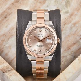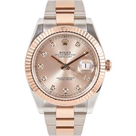 Die Rolex Datejust 41, Referenz 126331, vereint klassische Eleganz mit moderner Raffinesse. Das Gehäuse aus Edelstahl, kombiniert mit dem stilvollen Jubilee-Armband und der edlen Roségoldlünette, sorgt für einen luxuriösen Auftritt. Das rosafarbene Zifferblatt mit Diamanzindizes verleiht der Uhr eine zeitlose Ästhetik.- Durchmesser