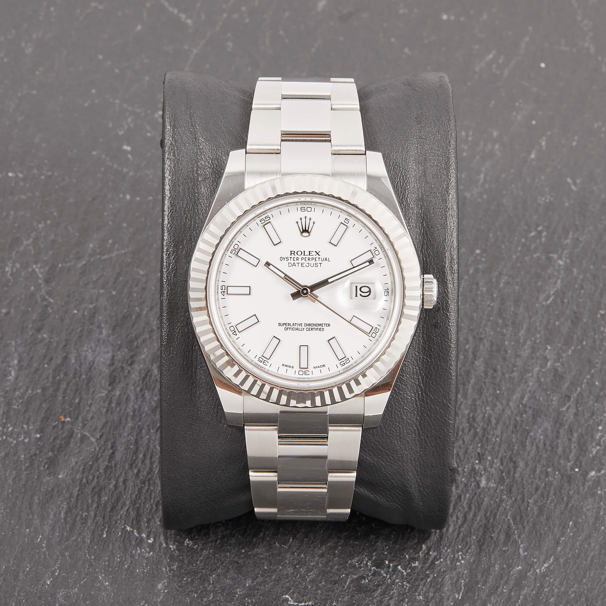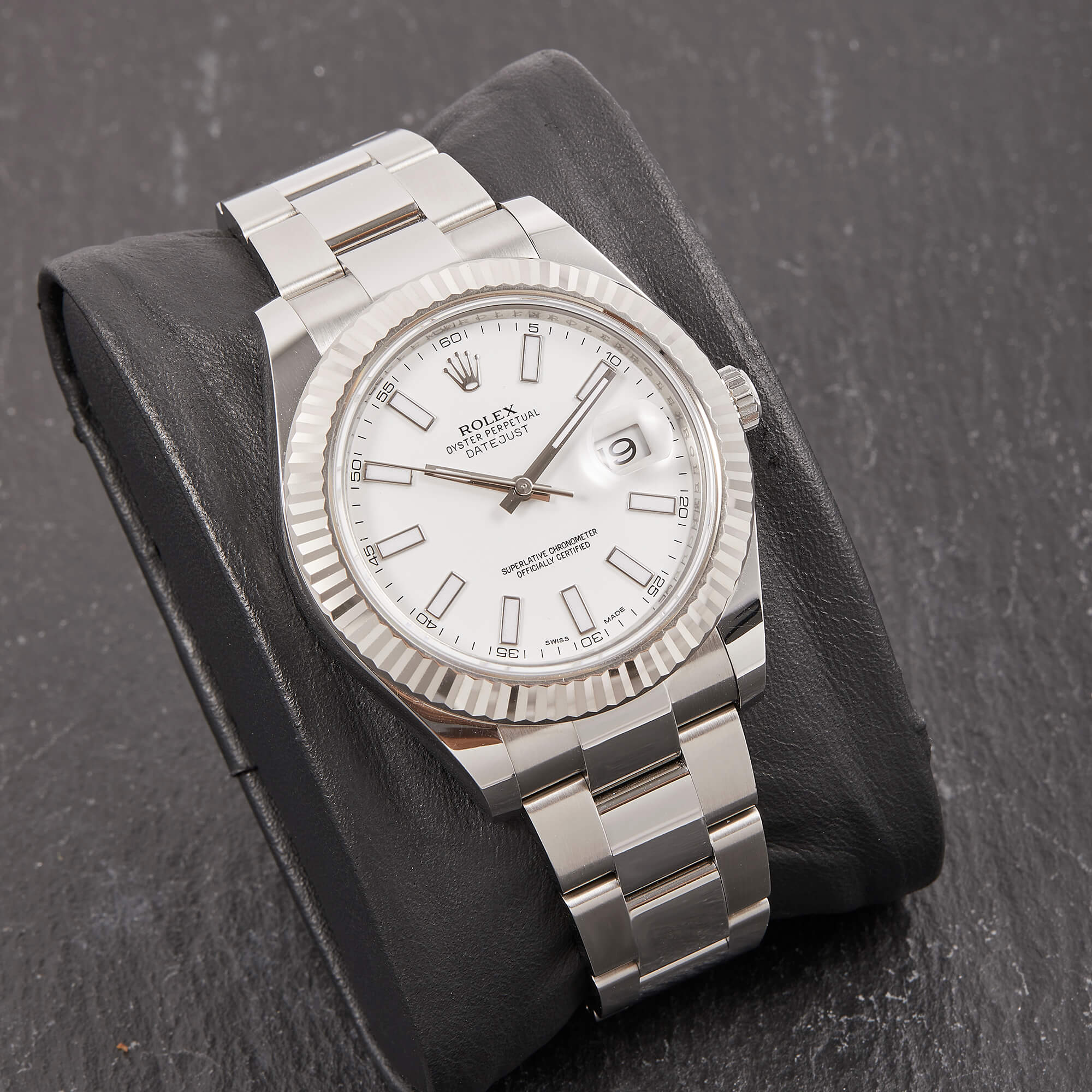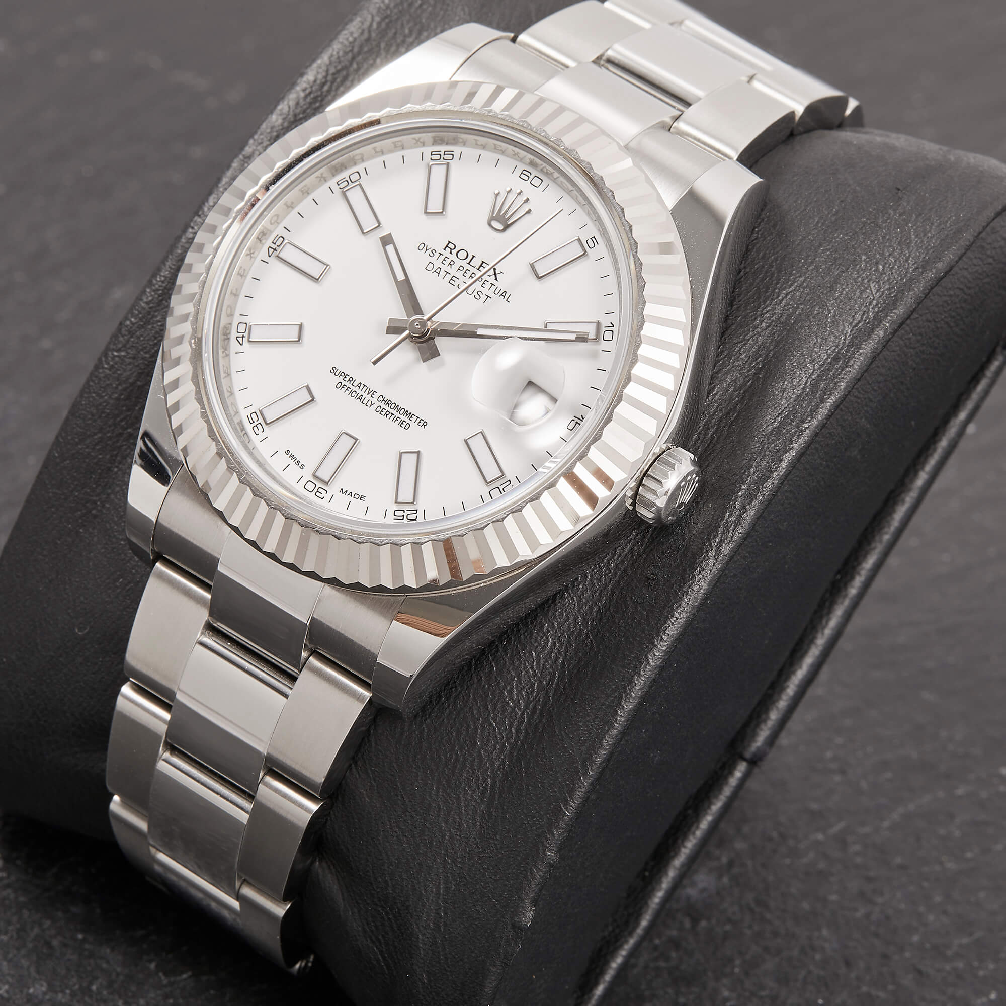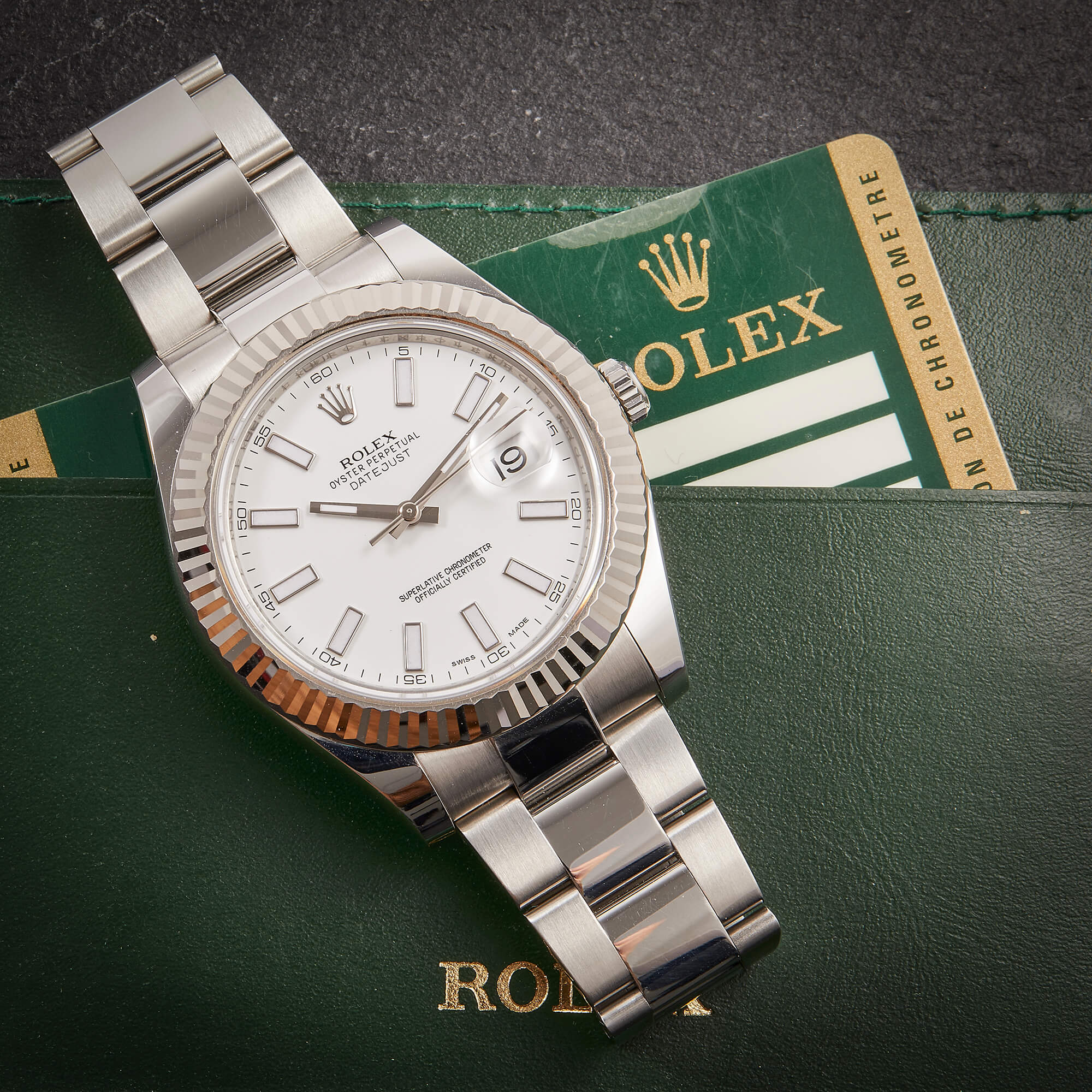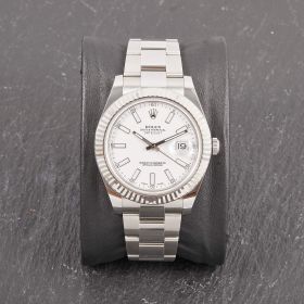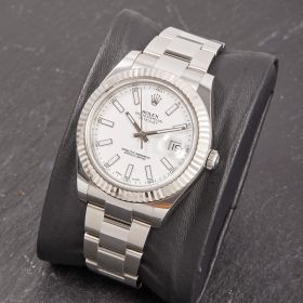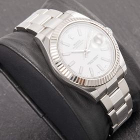 Rolex Datejust II mit 41mm Gehäusedurchmesser, geriffelter Weißgoldlünette und Oysterarmband. Sie verfügt über das klassische weiße Zifferblatt und die originale Garantiekarte.- Durchmesser
