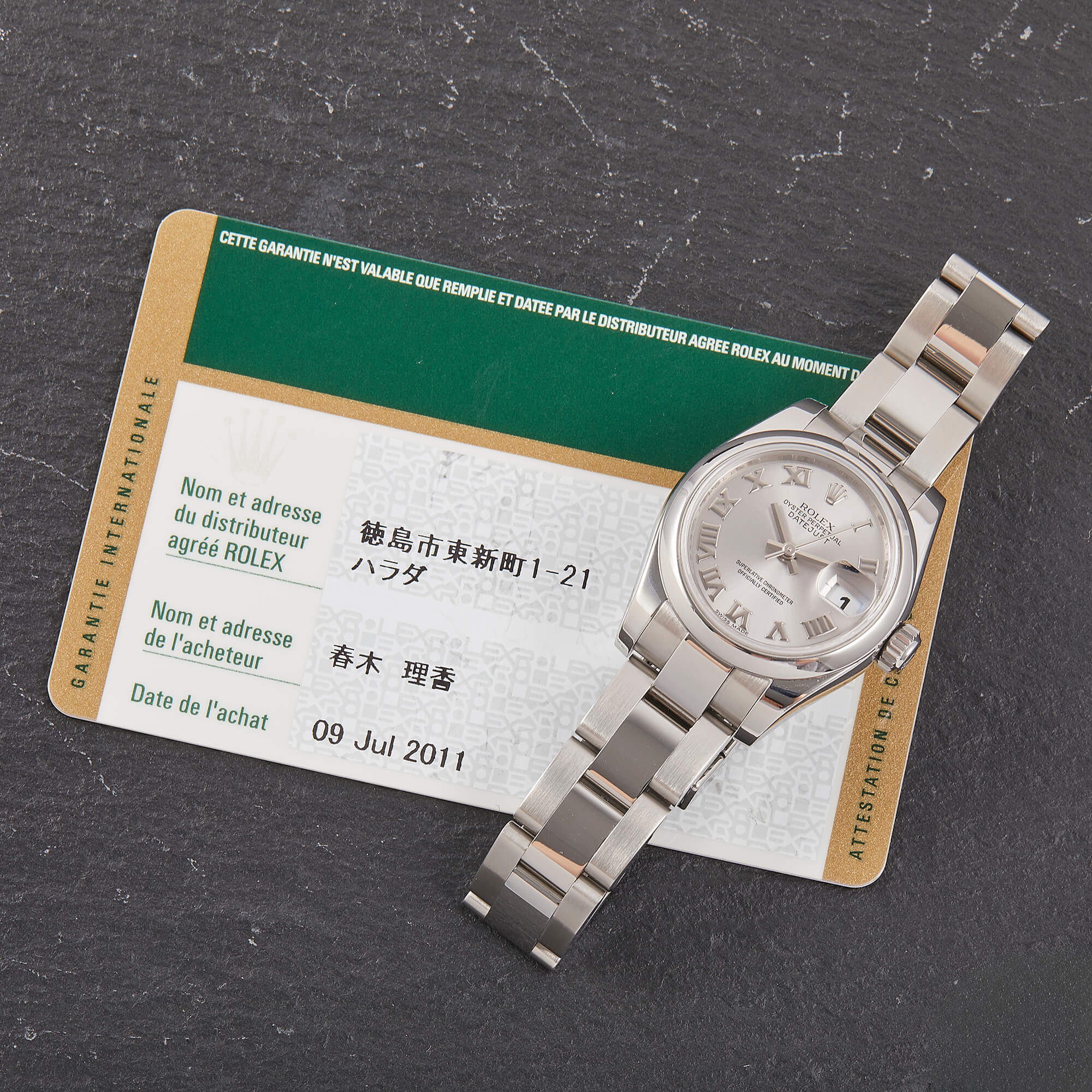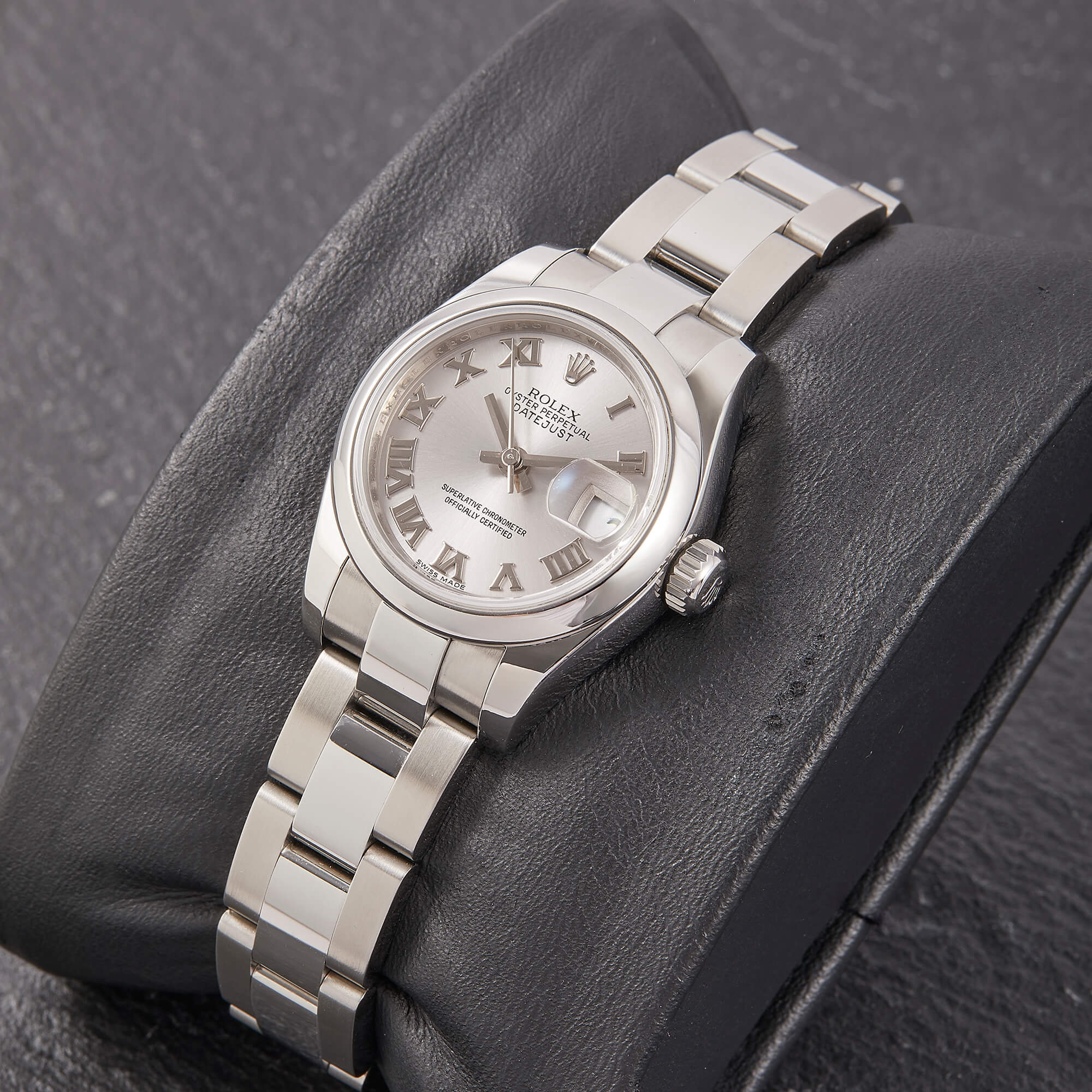 Die Rolex Datejust Lady 26mm Referenz 179160 vereint klassisches Design mit edelster Verarbeitung. Sie kommt mit einem eleganten grauen Zifferblatt und römischen Indizes, was ihr einen besonders stilvollen Charakter verleiht. Das Modell verfügt über eine glatte Lünette und ein robustes Oysterband, das für Tragekomfort und Langlebigkeit sorgt. Die originale Garantiekarte ist ebenfalls vorhanden.- Durchmesser