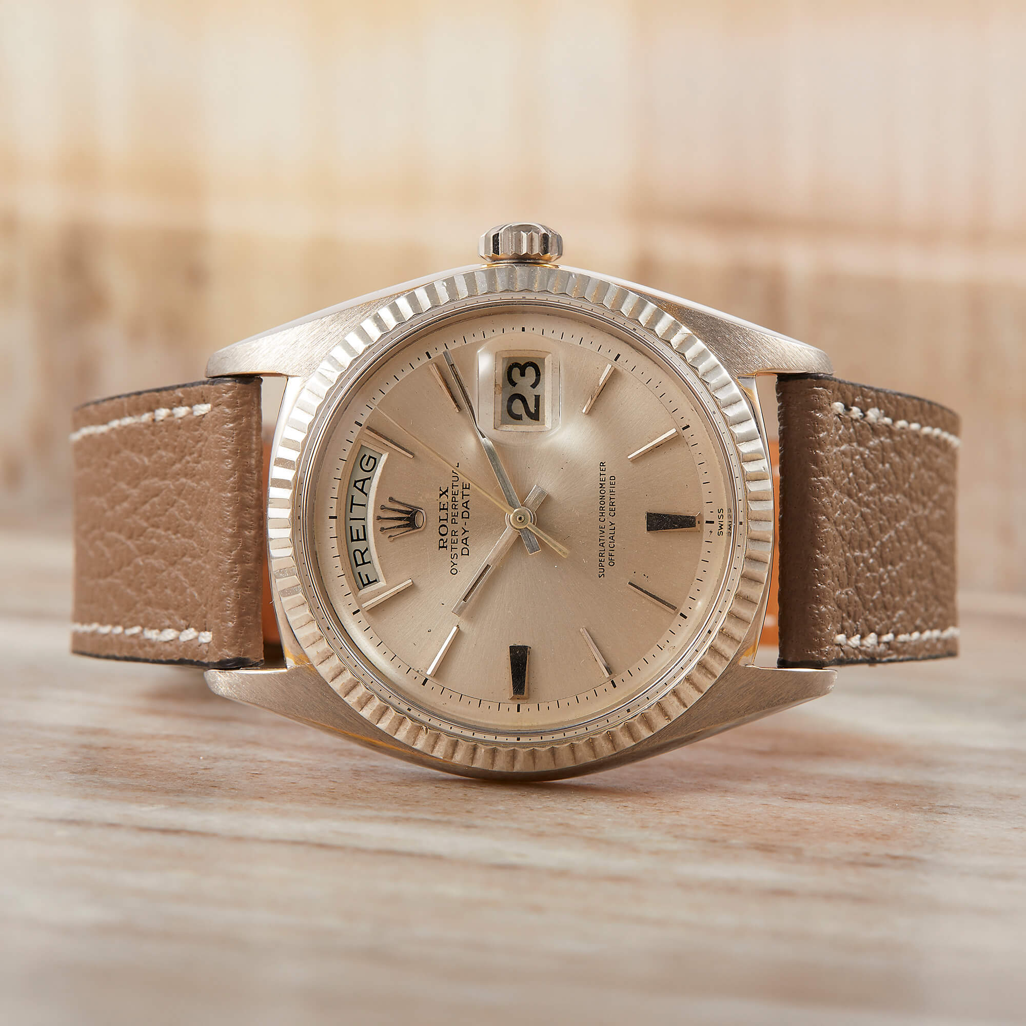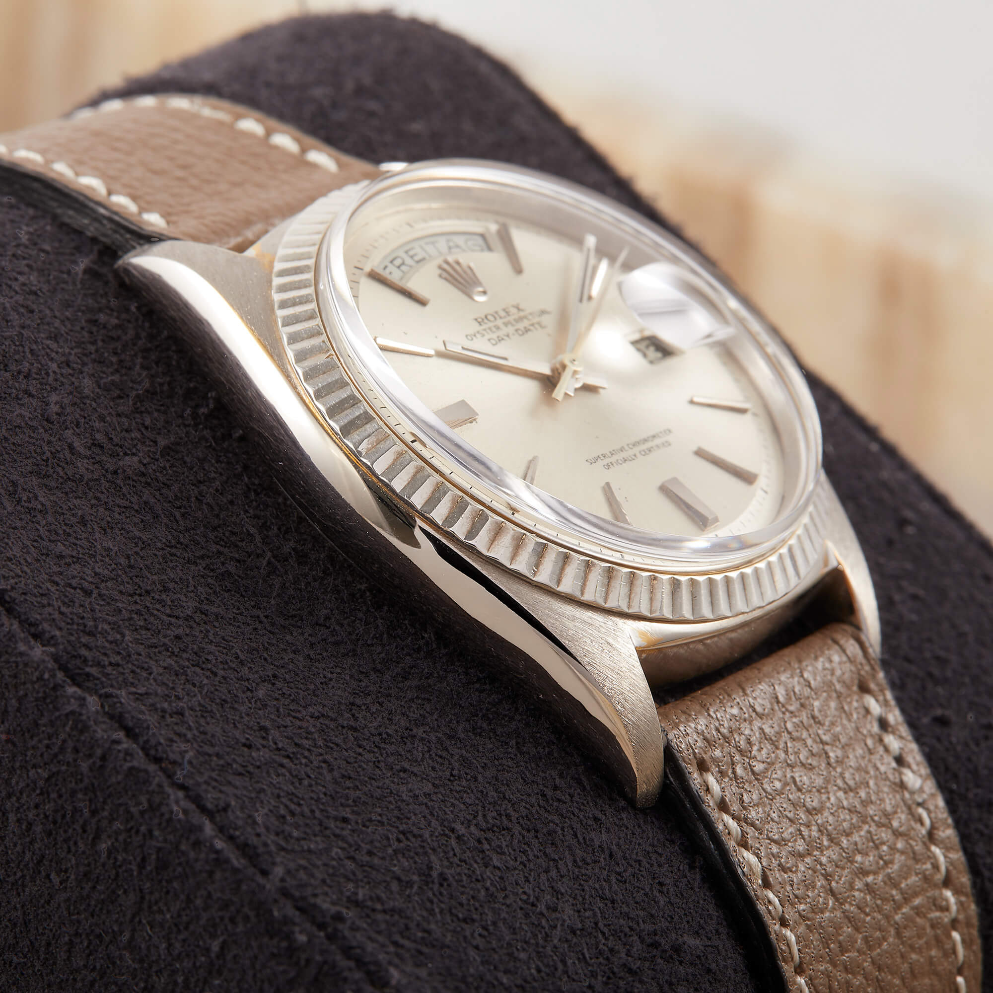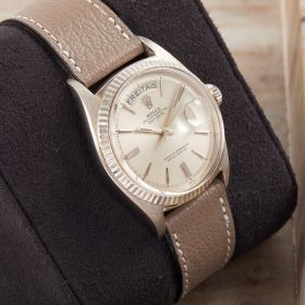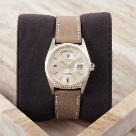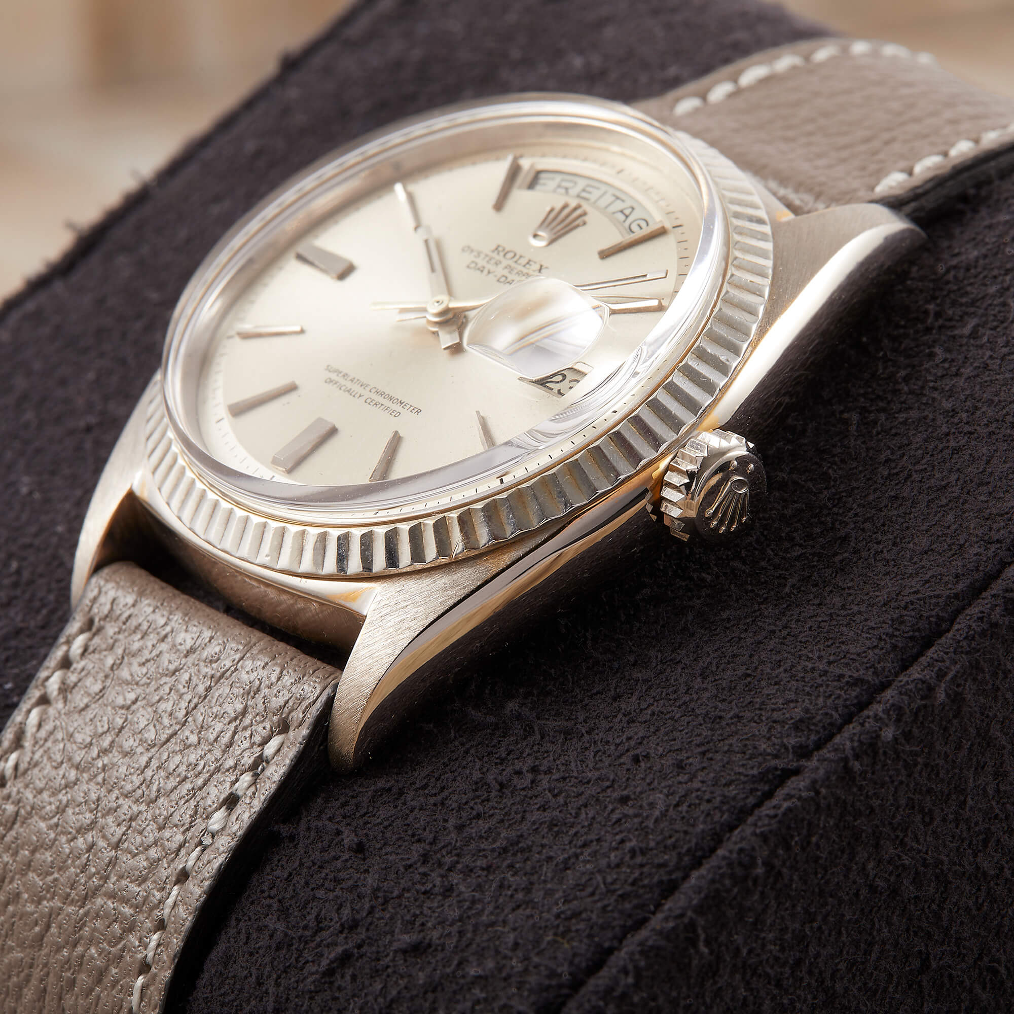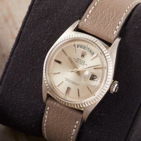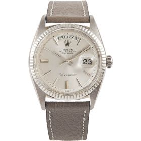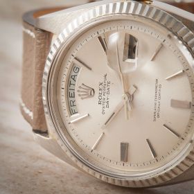 Klassische Day-Date Referenz 1803/9 im Weißgoldgehäuse, frisch revisioniert und in sehr gutem Zustand. Ausgestattet mit seltenem silbernen Stepdial und markanten großen Indizes bei 6 und 9 Uhr. Getragen am hochwertigen Lederband mit Rolex-Schließe – eine elegante Vintage-Uhr mit Charakter.- Durchmesser