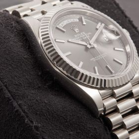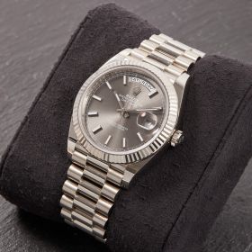 Rolex Day-Date 40, Referenz 228239, in Weißgold mit rhodiumfarbenem Zifferblatt. Die Uhr wird im Fullset angeboten und vereint klassische Eleganz mit der zeitlosen Ausstrahlung der Day-Date-Reihe.- Durchmesser