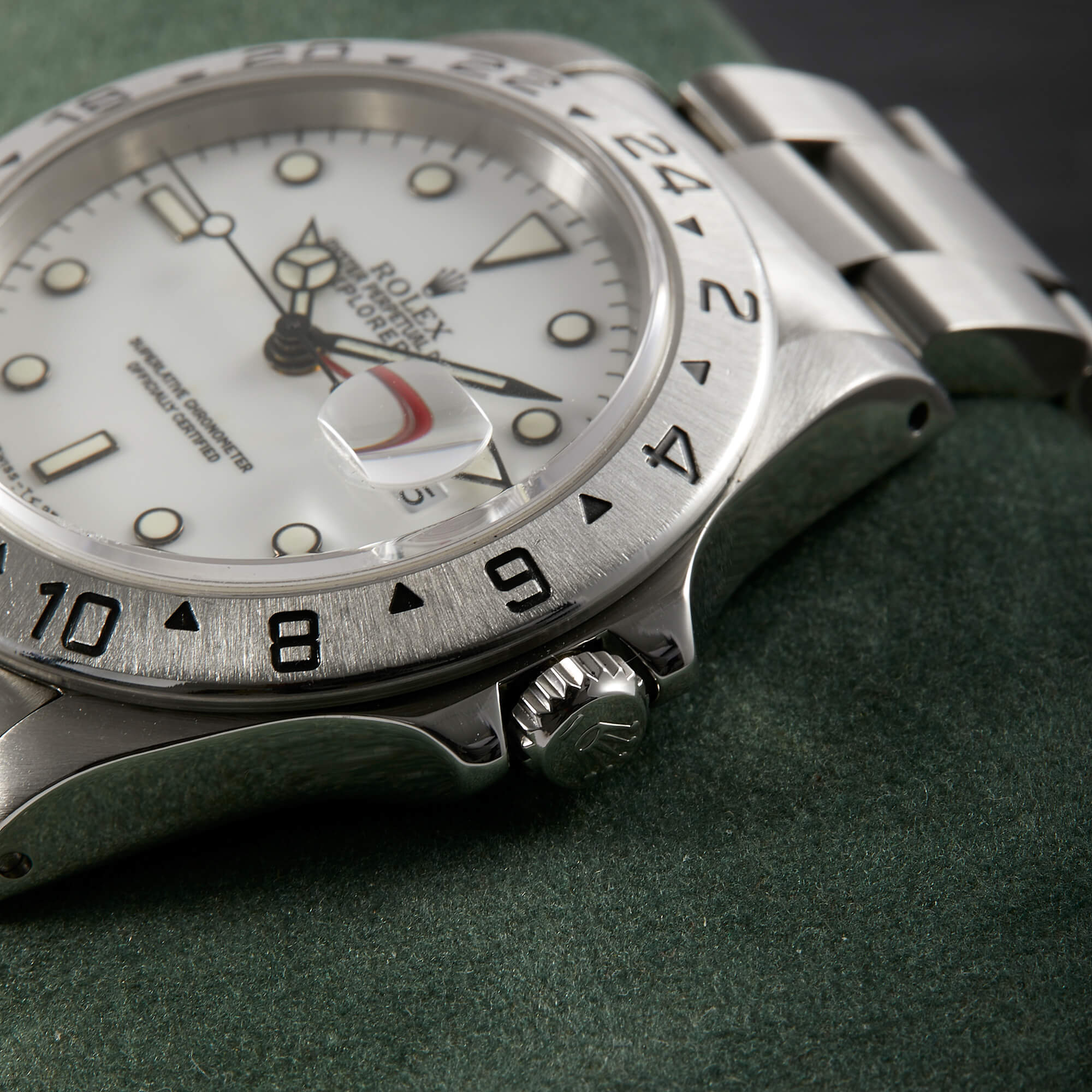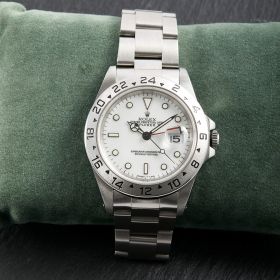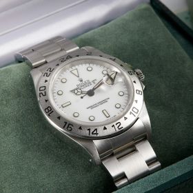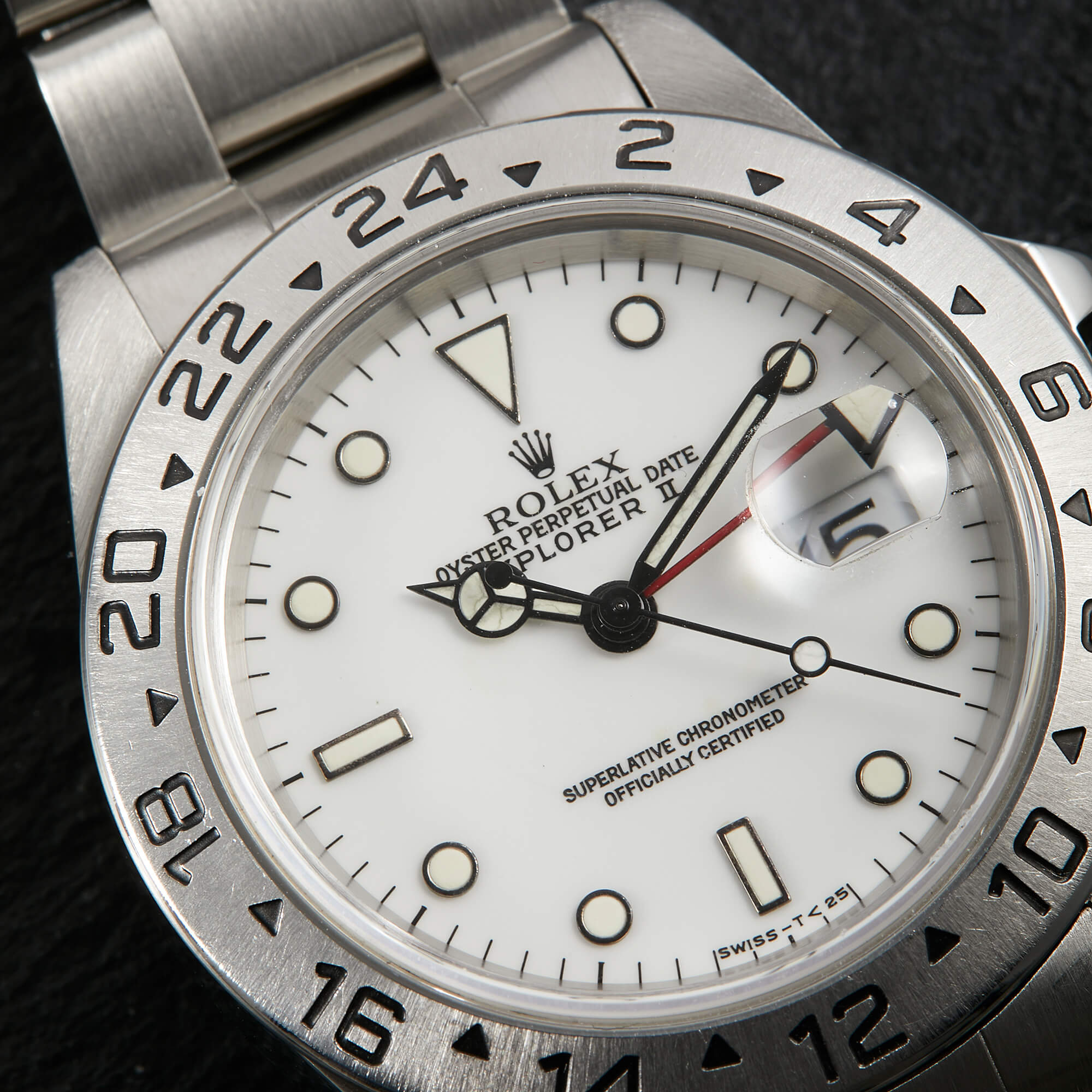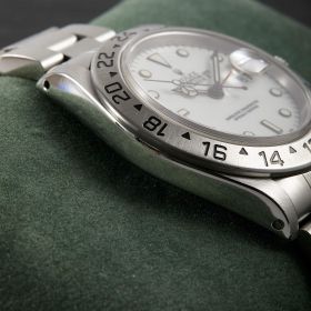 Die Rolex Explorer II mit der Referenz 16570 und weißem Zifferblatt ist ein wahres Sammlerstück. Besonders auffällig ist die wunderschöne beigefarbene Patina, die sich auf den Indizes und Zeigern gebildet hat, was dieser Uhr einen einzigartigen Charakter verleiht. Liebevoll auch "Chicchi di Mais" genannt, präsentiert sich diese ikonische Uhr im absoluten Fullset und bietet nicht nur höchste Präzision, sondern auch einen Hauch von Geschichte und Charme.