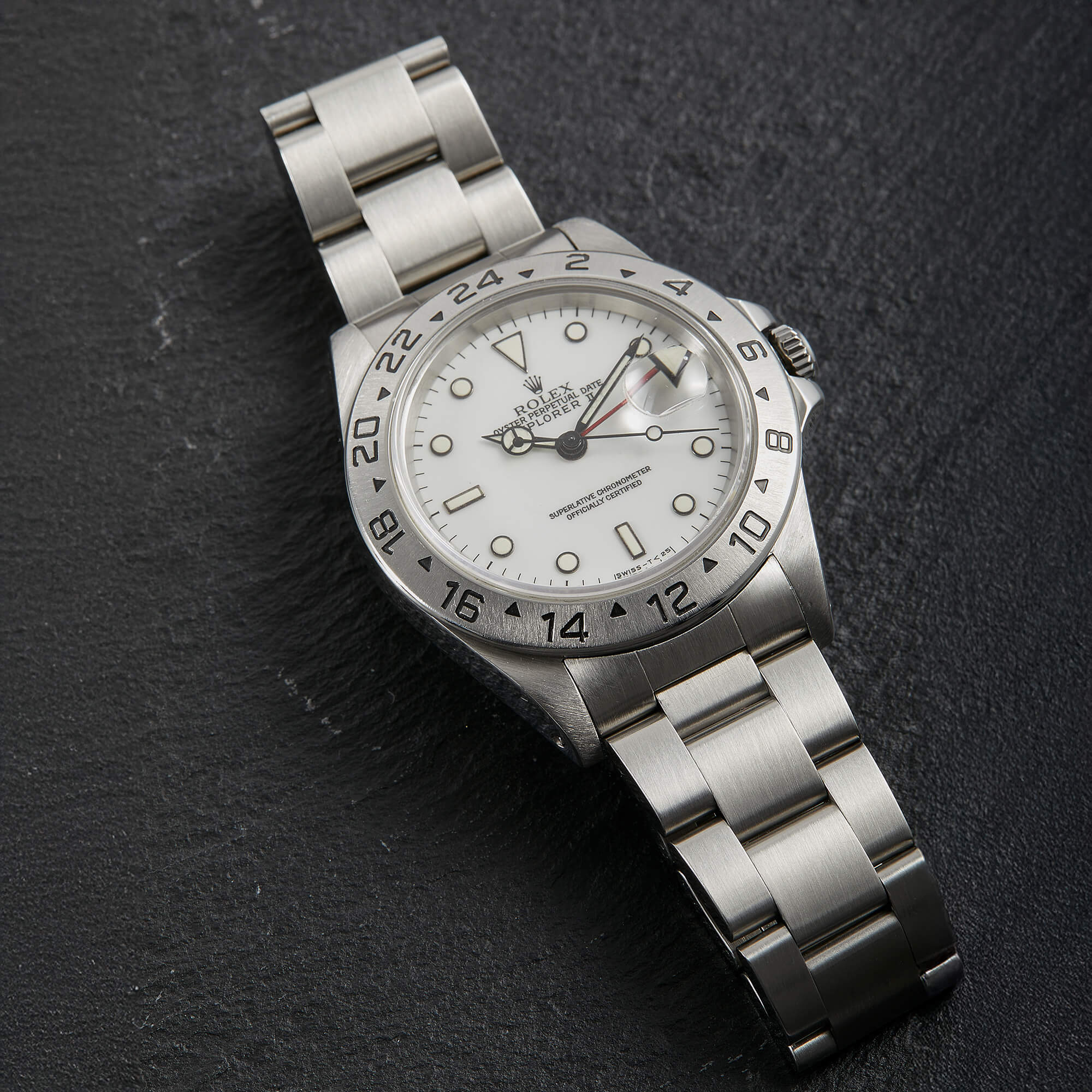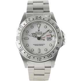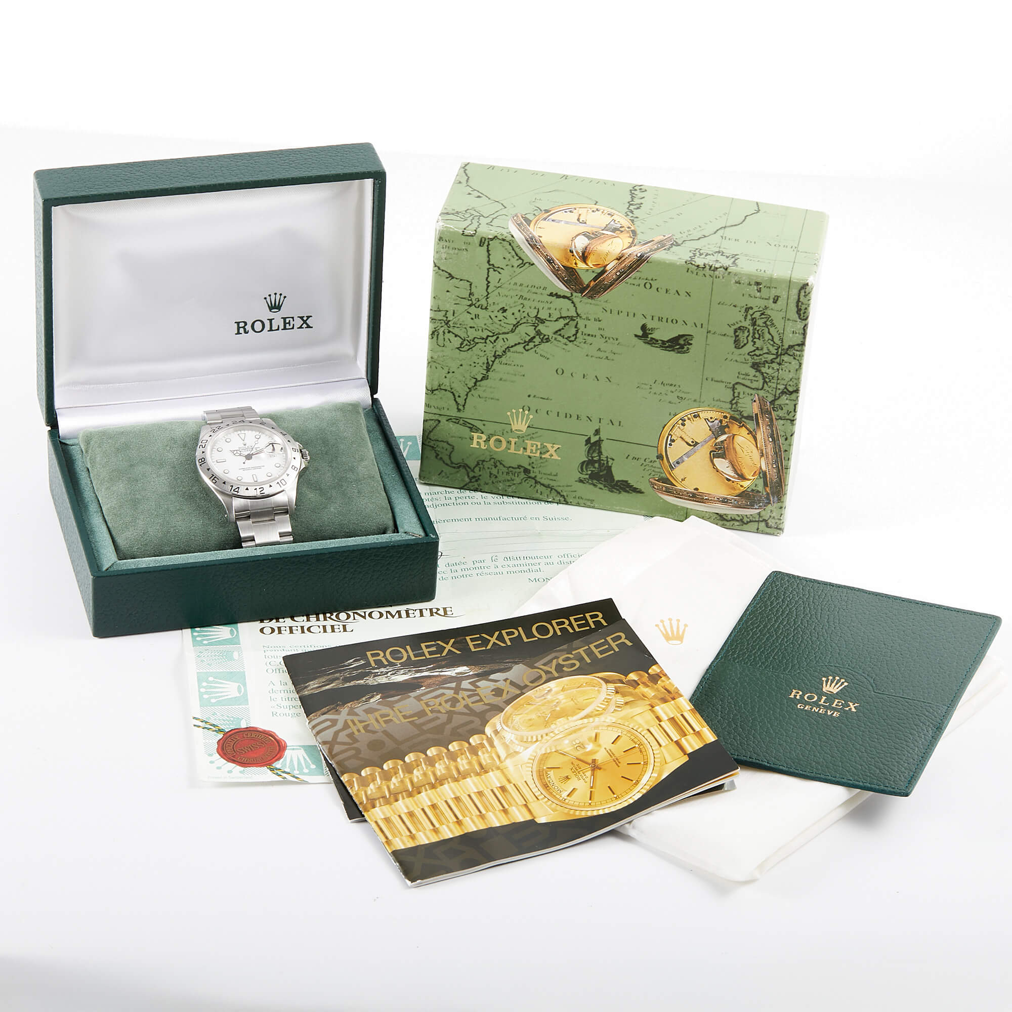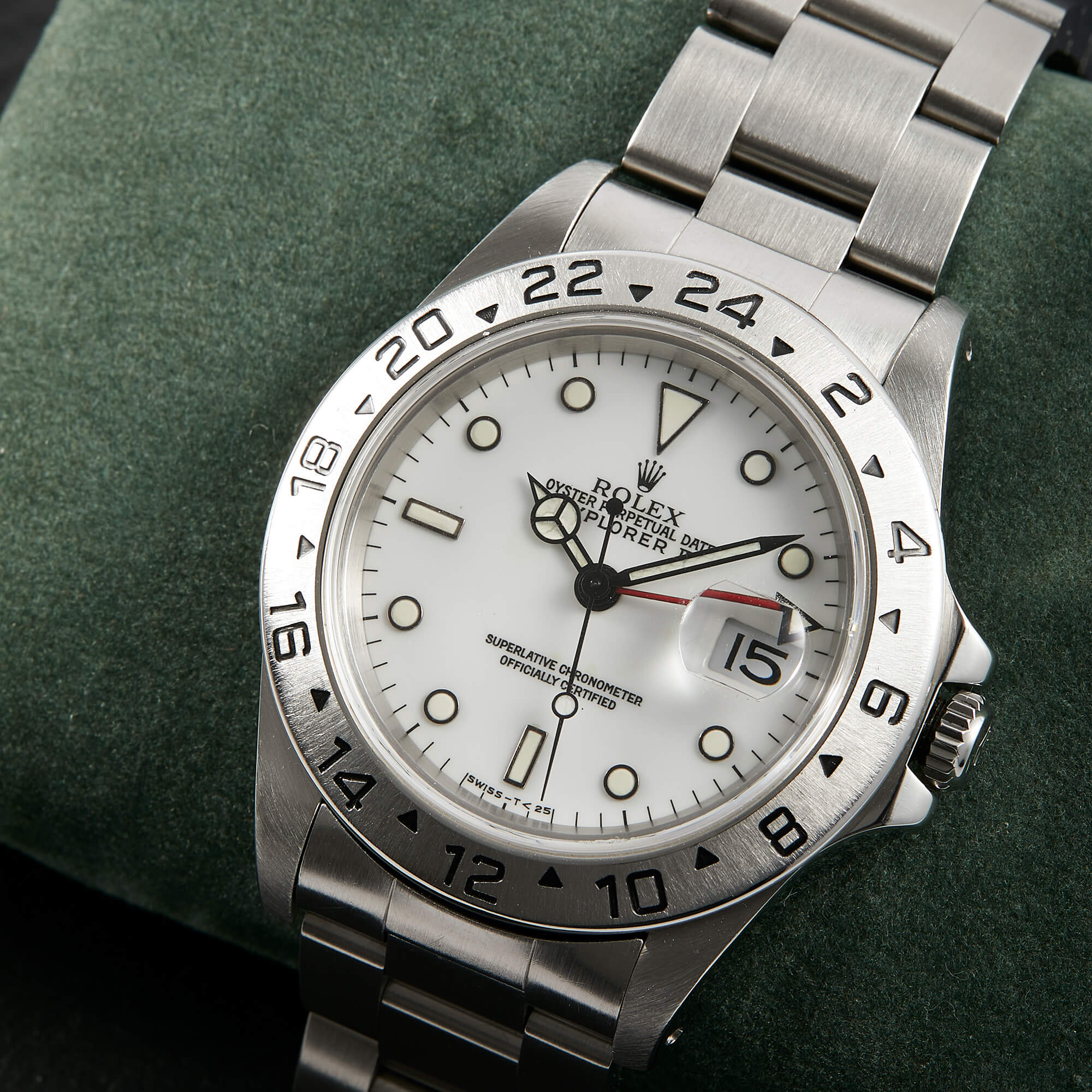 Die Rolex Explorer II mit der Referenz 16570 und weißem Zifferblatt ist ein wahres Sammlerstück. Besonders auffällig ist die wunderschöne beigefarbene Patina, die sich auf den Indizes und Zeigern gebildet hat, was dieser Uhr einen einzigartigen Charakter verleiht. Liebevoll auch "Chicchi di Mais" genannt, präsentiert sich diese ikonische Uhr im absoluten Fullset und bietet nicht nur höchste Präzision, sondern auch einen Hauch von Geschichte und Charme.