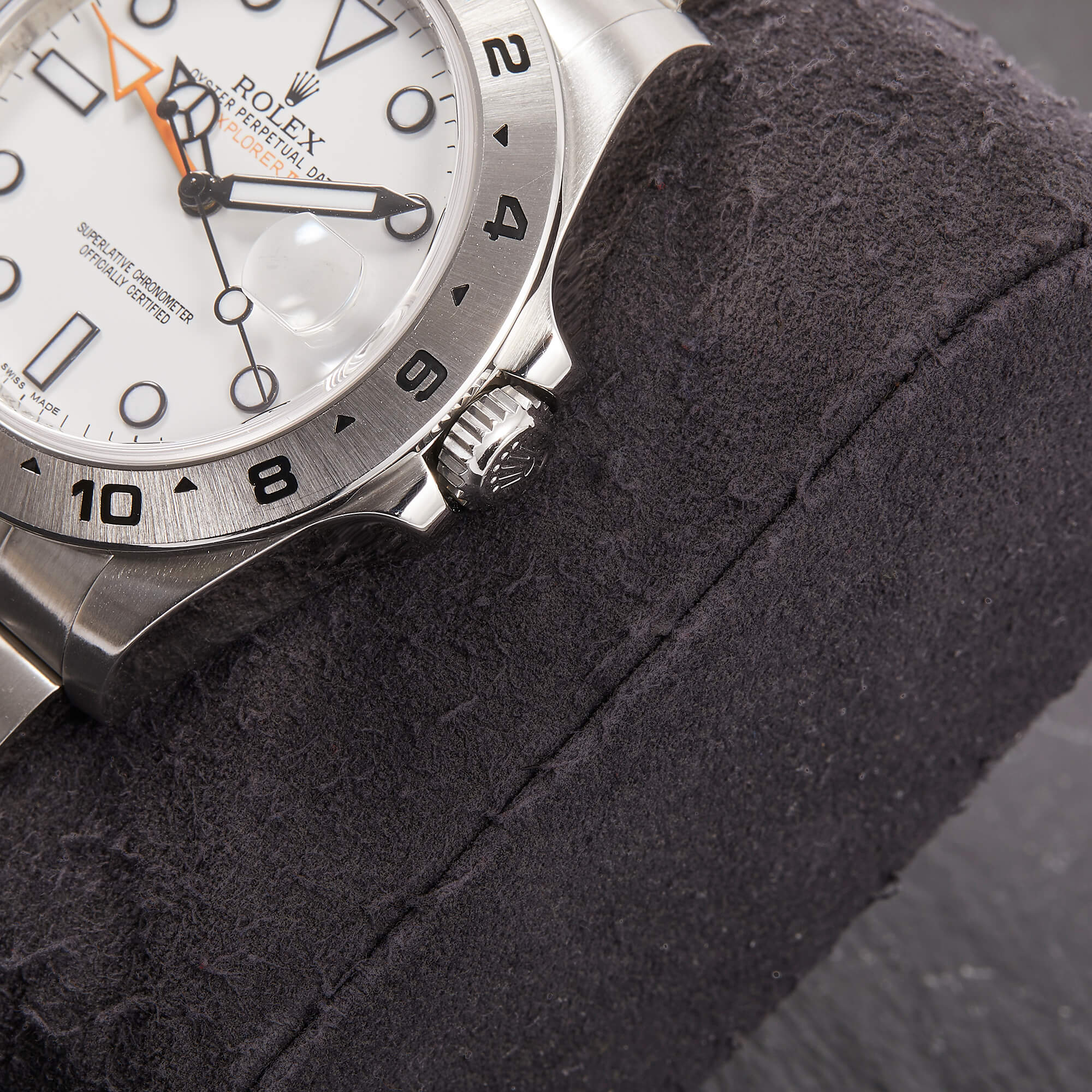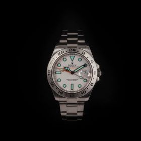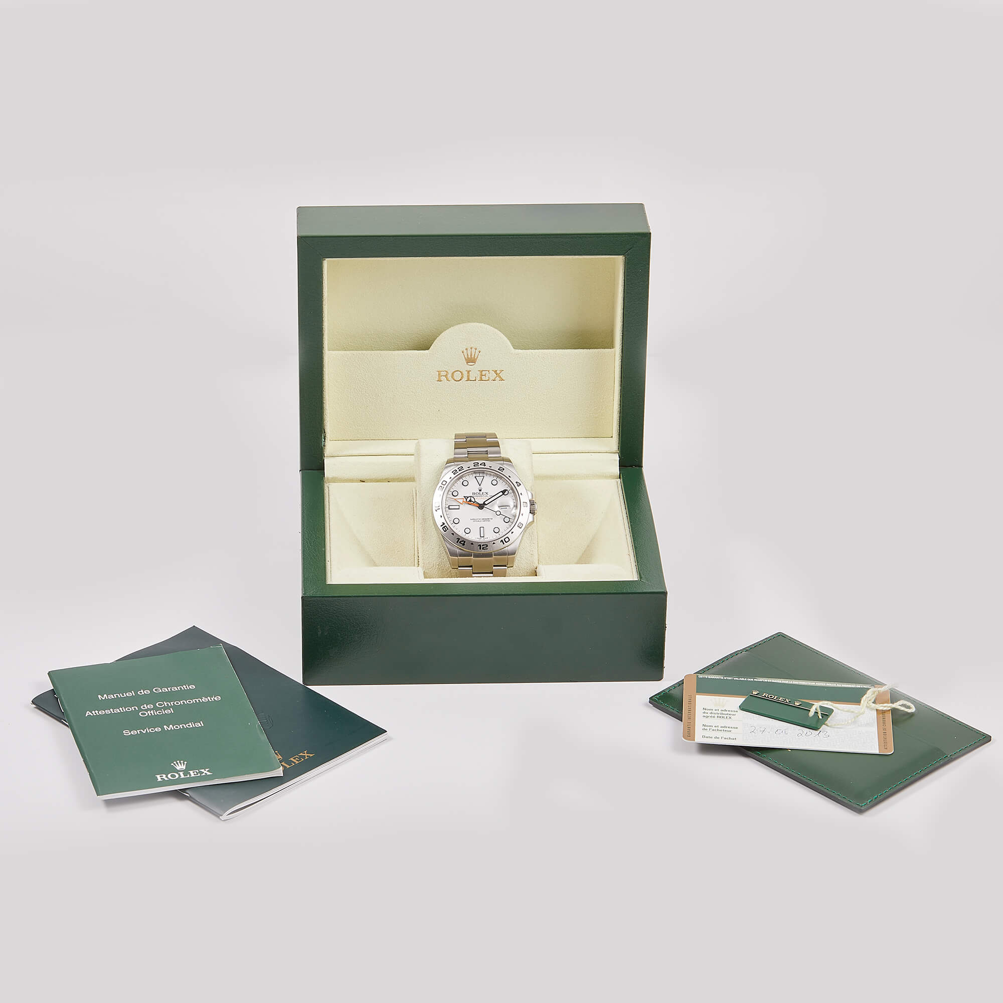 Die Rolex Explorer II Referenz 216570 präsentiert sich im Fullset in sehr gutem Zustand. Sie vereint Zuverlässigkeit mit markanter Ästhetik. Mit ihrem 42-mm-Edelstahlgehäuse, der ikonischen 24-Stunden-Lünette und dem leuchtend orangefarbenen GMT-Zeiger ist sie der perfekte Begleiter für Entdecker und Uhrenliebhaber.- Durchmesser