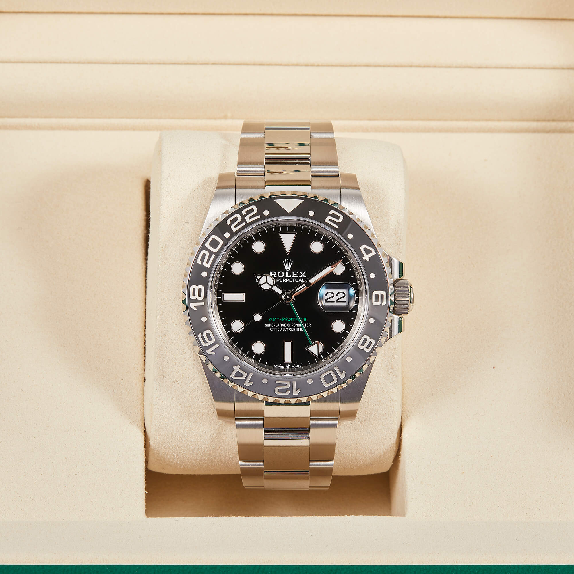 Moderne GMT-Master II mit ikonischer blau-grauer Cerachrom-Lünette und elegantem Oysterband. Die Referenz 126710GRNR vereint sportliche Funktionalität mit klassischem Rolex-Design. Die Uhr kommt im Fullset – inklusive Box, Papieren und allem Zubehör.- Durchmesser