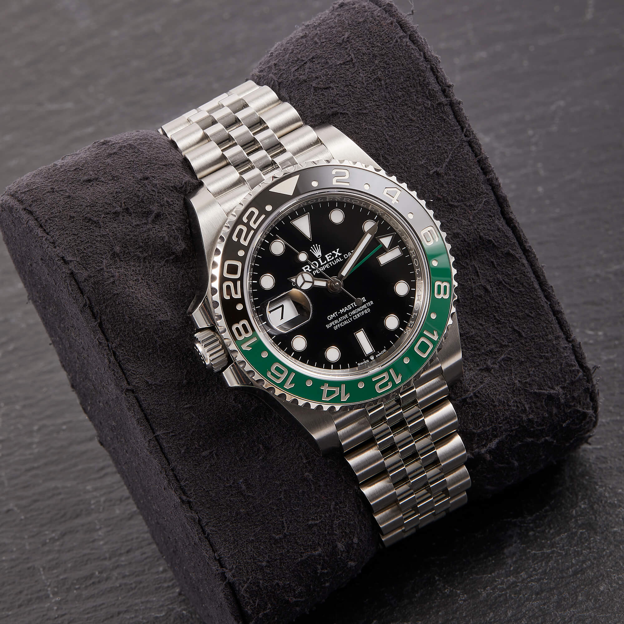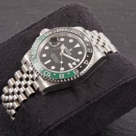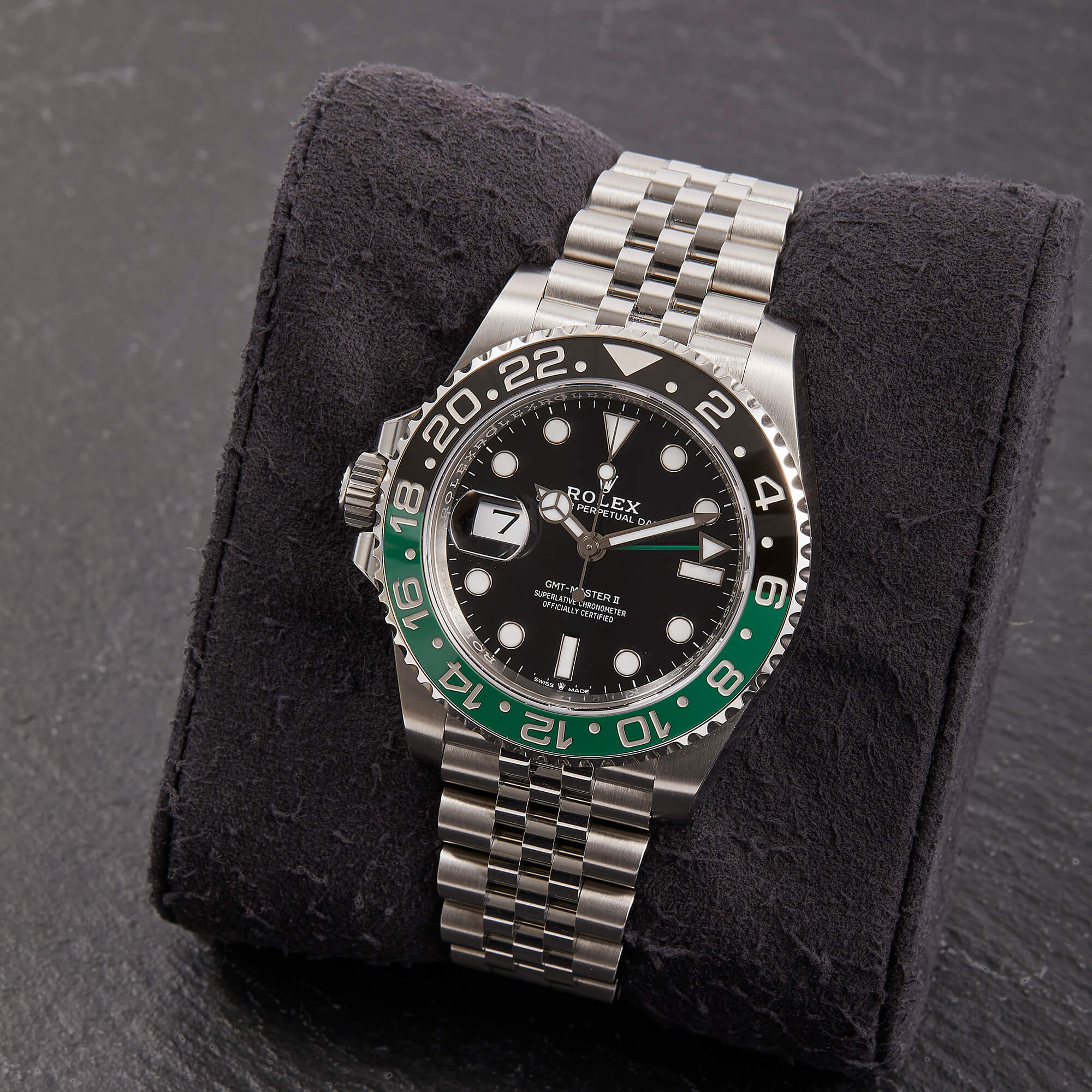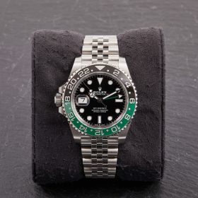 Die Rolex GMT-Master II, Referenz 126720VTNR, kommt am eleganten Jubilee-Band im Fullset. Die markante grün-schwarze „Sprite“-Lünette und die links platzierte Krone machen dieses Modell zu einer der auffälligsten modernen Varianten. Dank der GMT-Funktion lassen sich mühelos zwei Zeitzonen gleichzeitig ablesen – perfekt für Vielreisende. Eine sportliche, äußerst begehrte Rolex in hervorragendem Zustand. Bei den angezeigten Fotos handelt es sich um Beispielbilder. Fotos der zu verkaufenden Uhr senden wir Ihnen gerne auf Anfrage zu.- Durchmesser