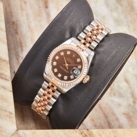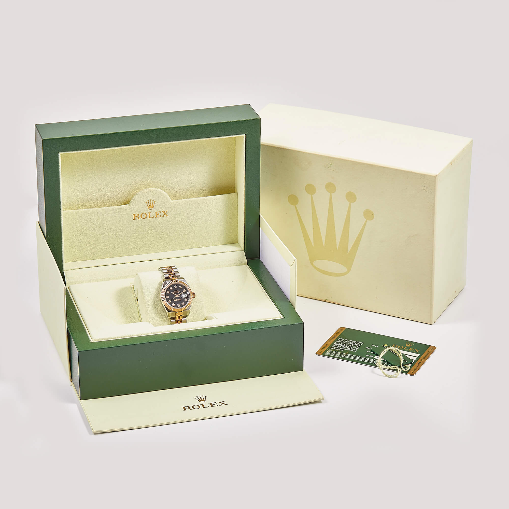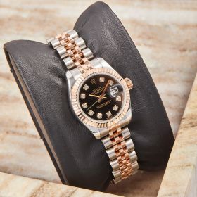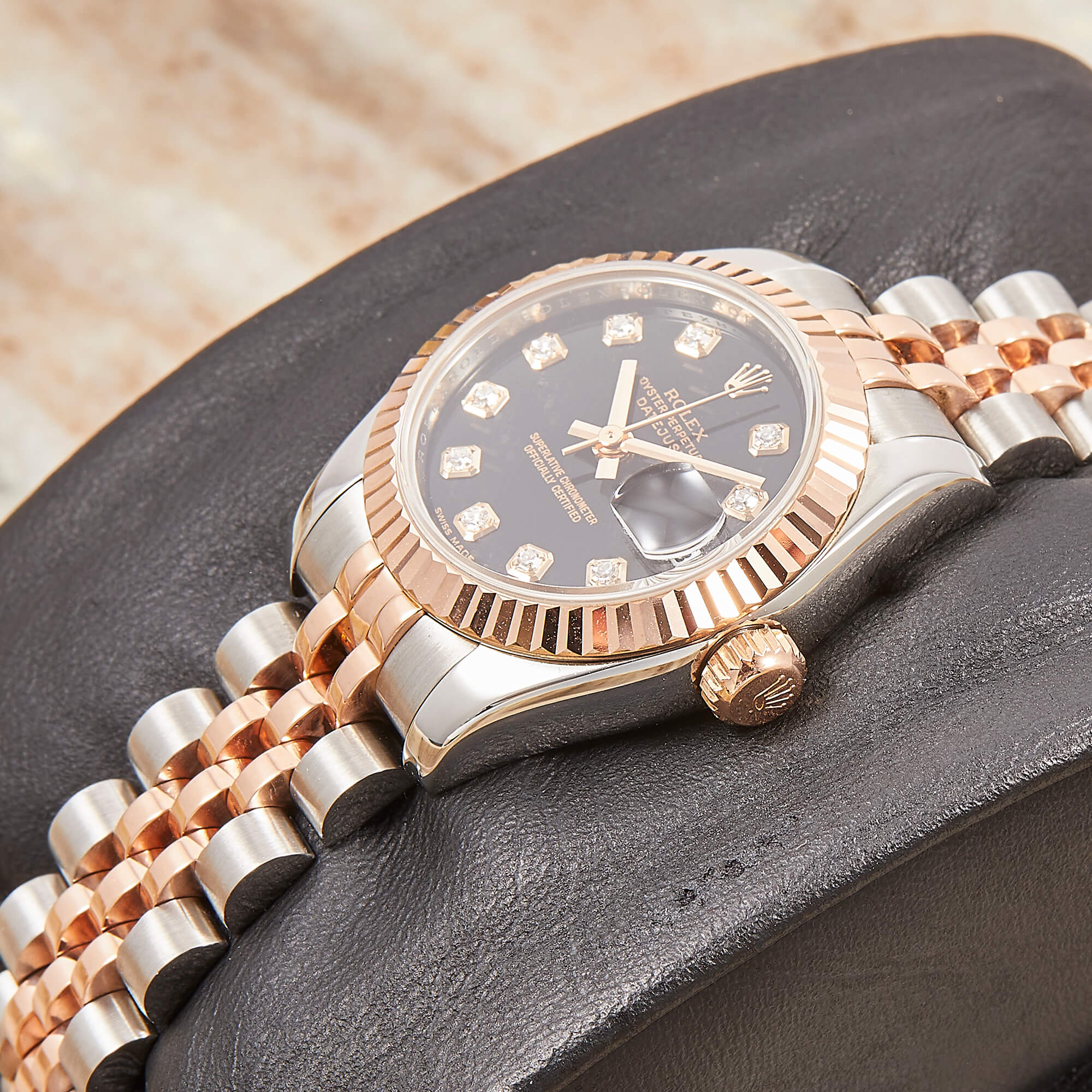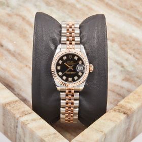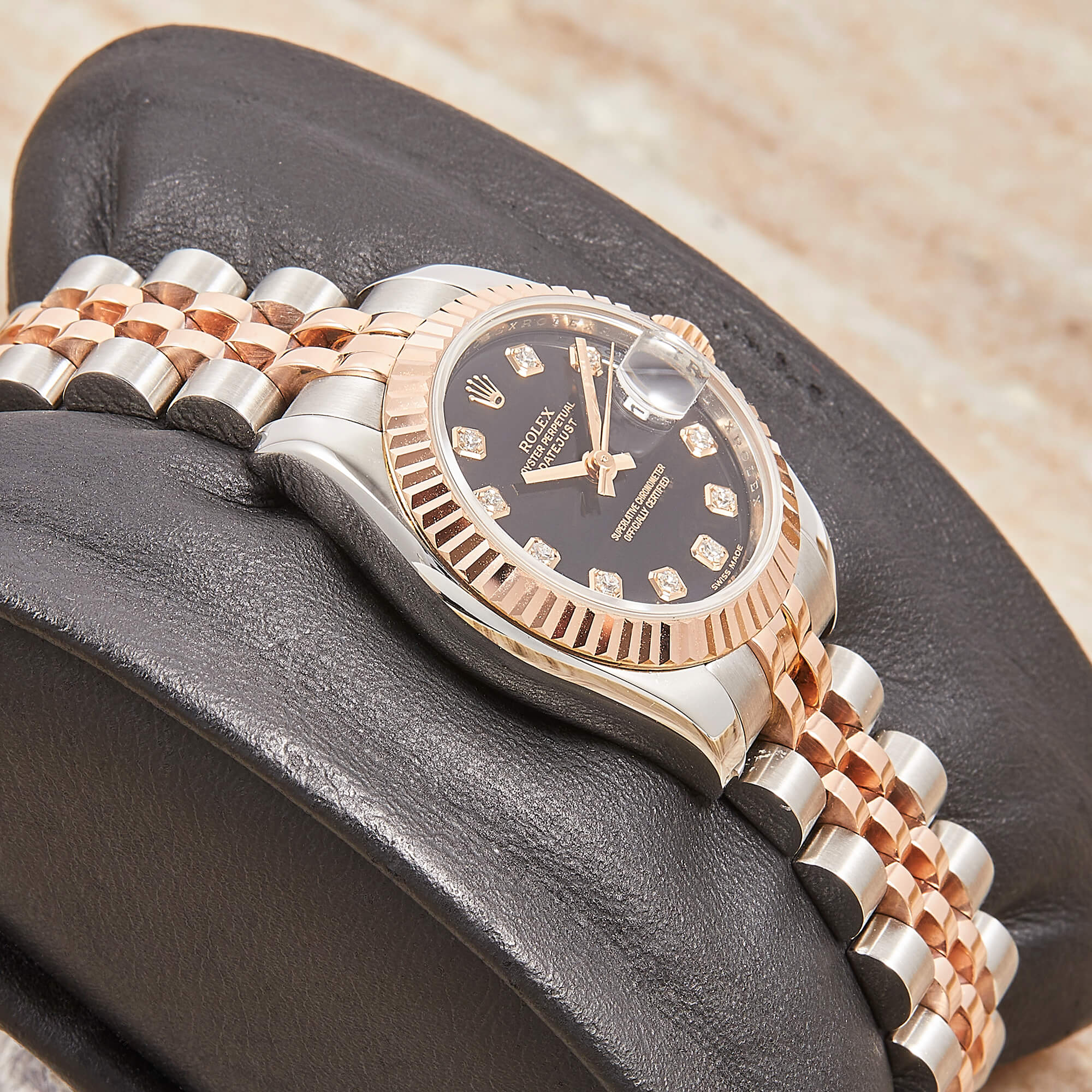 Diese elegante 26 mm Datejust Lady kommt in der seltenen Bicolor-Kombination aus Edelstahl und 18 Karat Everose-Gold. Ausgestattet mit dem edlen Superjubilee-Band mit versteckter Schließe („Crownclasp“) und einem klassischen schwarzen Zifferblatt mit funkelnden Diamantindizes, verkörpert sie zeitlose Raffinesse. Die Ref. 179171 in Stahl-Roségold wurde nur in geringer Stückzahl produziert.- Durchmesser
