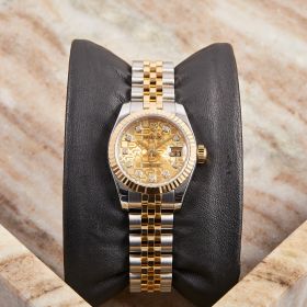 Elegante Rolex Datejust Lady Referenz 179173 mit Champagnerfarbenem Computer-Zifferblatt und funkelnden Diamantindizes. Ausgestattet mit einem Jubileeband und verdeckter Crownclasp-Schließe für ein besonders harmonisches Erscheinungsbild. Die Uhr befindet sich in schönem Zustand und kommt inklusive originaler Box sowie Papiere – ein stilvoller Klassiker mit luxuriösem Touch.- Durchmesser