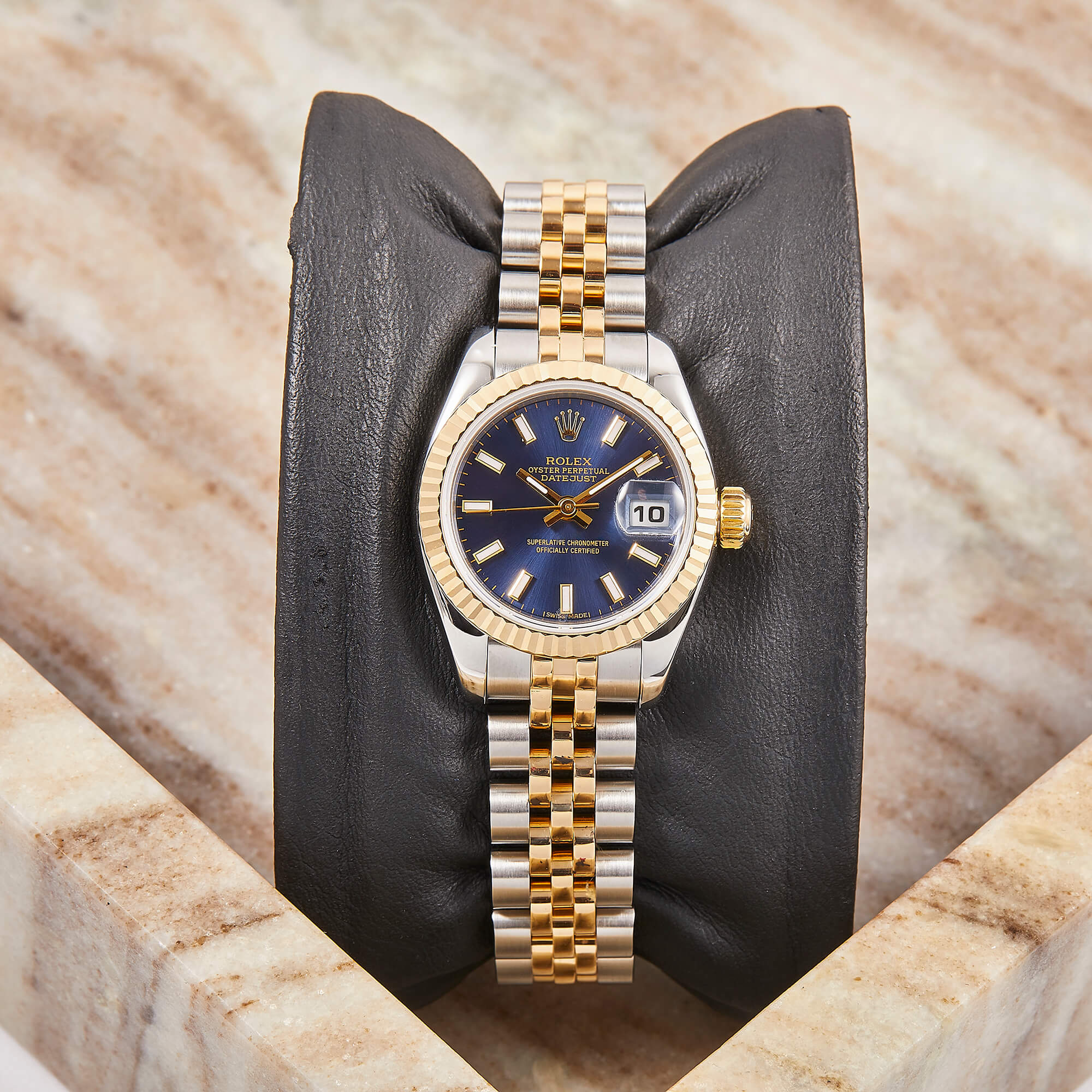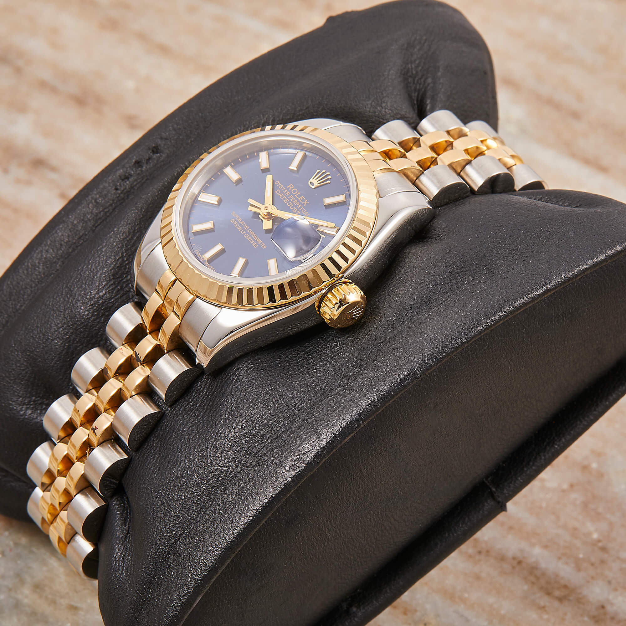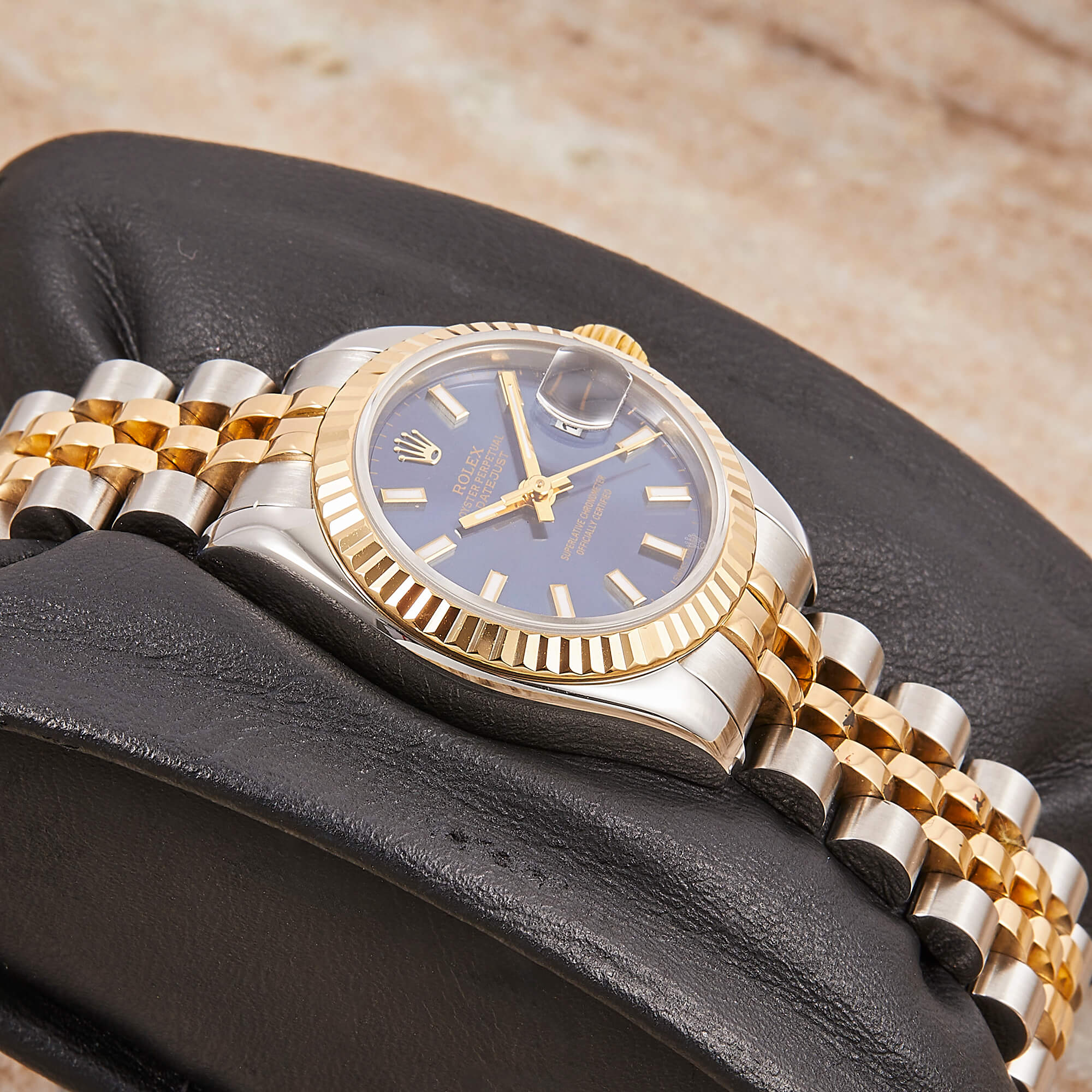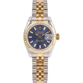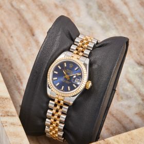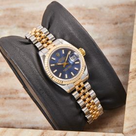 Elegante Rolex Datejust Lady Referenz 179173 mit blauem Zifferblatt und Strichindizes. Ausgestattet mit einem Jubileeband und verdeckter Crownclasp-Schließe für ein besonders harmonisches Erscheinungsbild. Die Uhr befindet sich in schönem Zustand und kommt inklusive originaler Box sowie Papiere – ein stilvoller Klassiker mit luxuriösem Touch.- Durchmesser