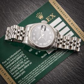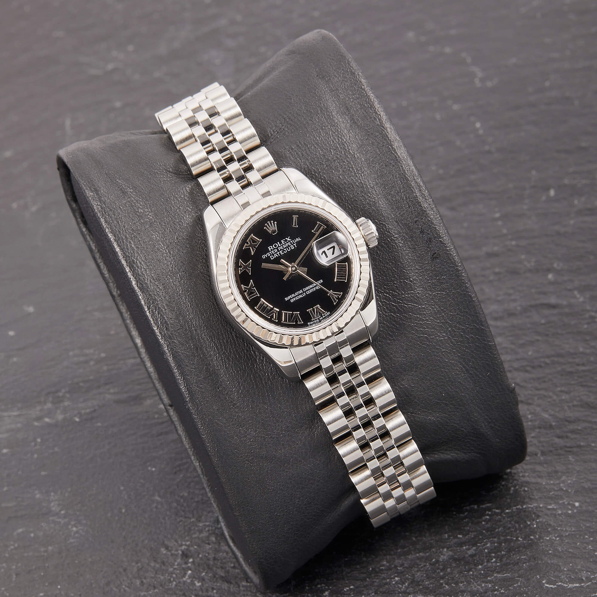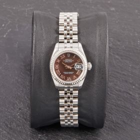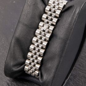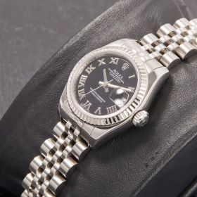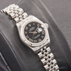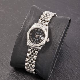 Diese elegante Lady-Datejust 179174 überzeugt mit einem schönen schwarzen Zifferblatt inkl. römischen Indizes und originalem Jubilee-Band, welches durch eine verdeckte Crownclaspschließe veredelt wird. Die Uhr befindet sich in sehr schönem Zustand. Ein klassisches Damenmodell mit besonderem Charme.- Durchmesser