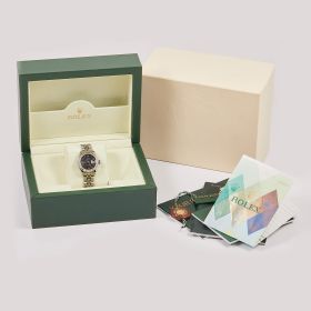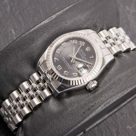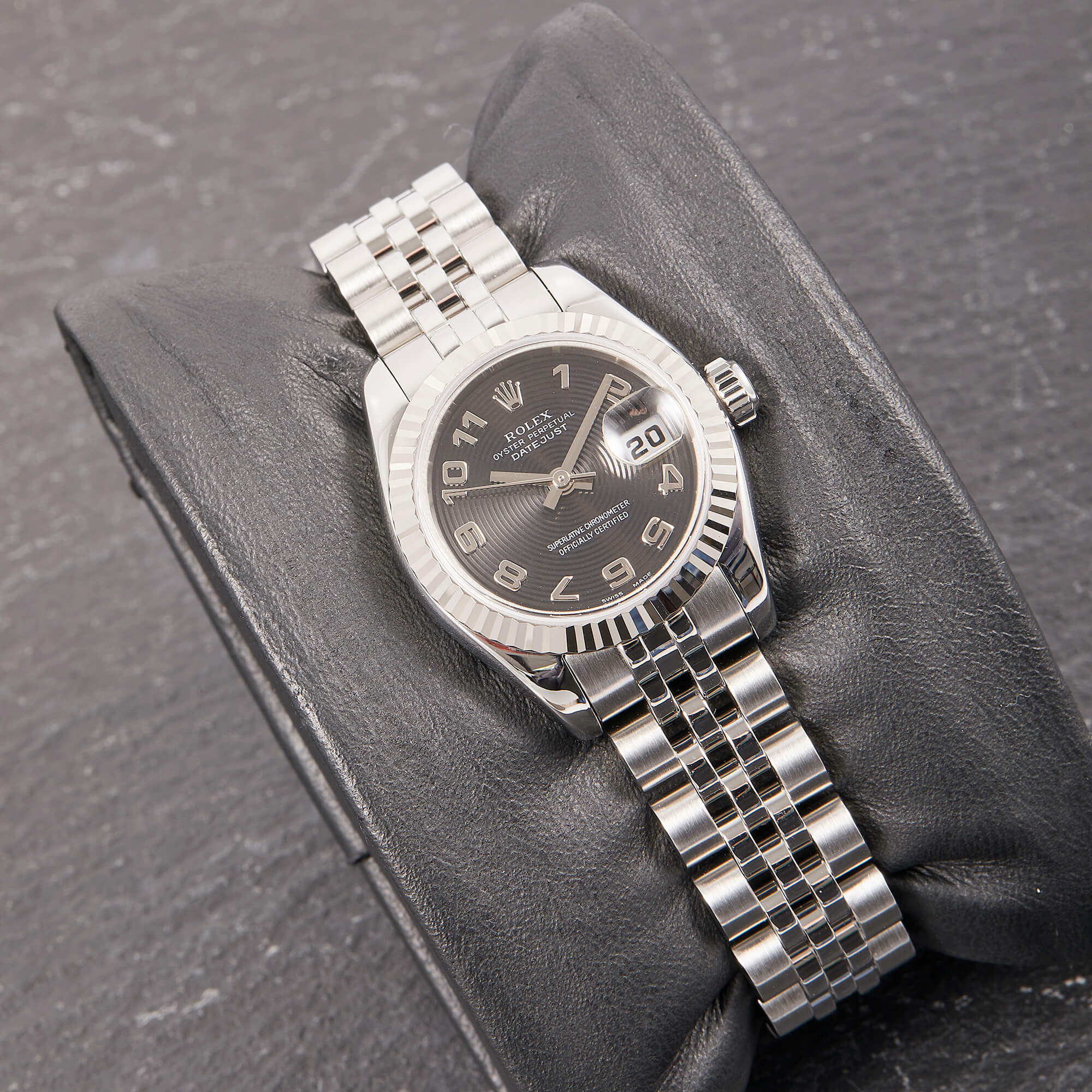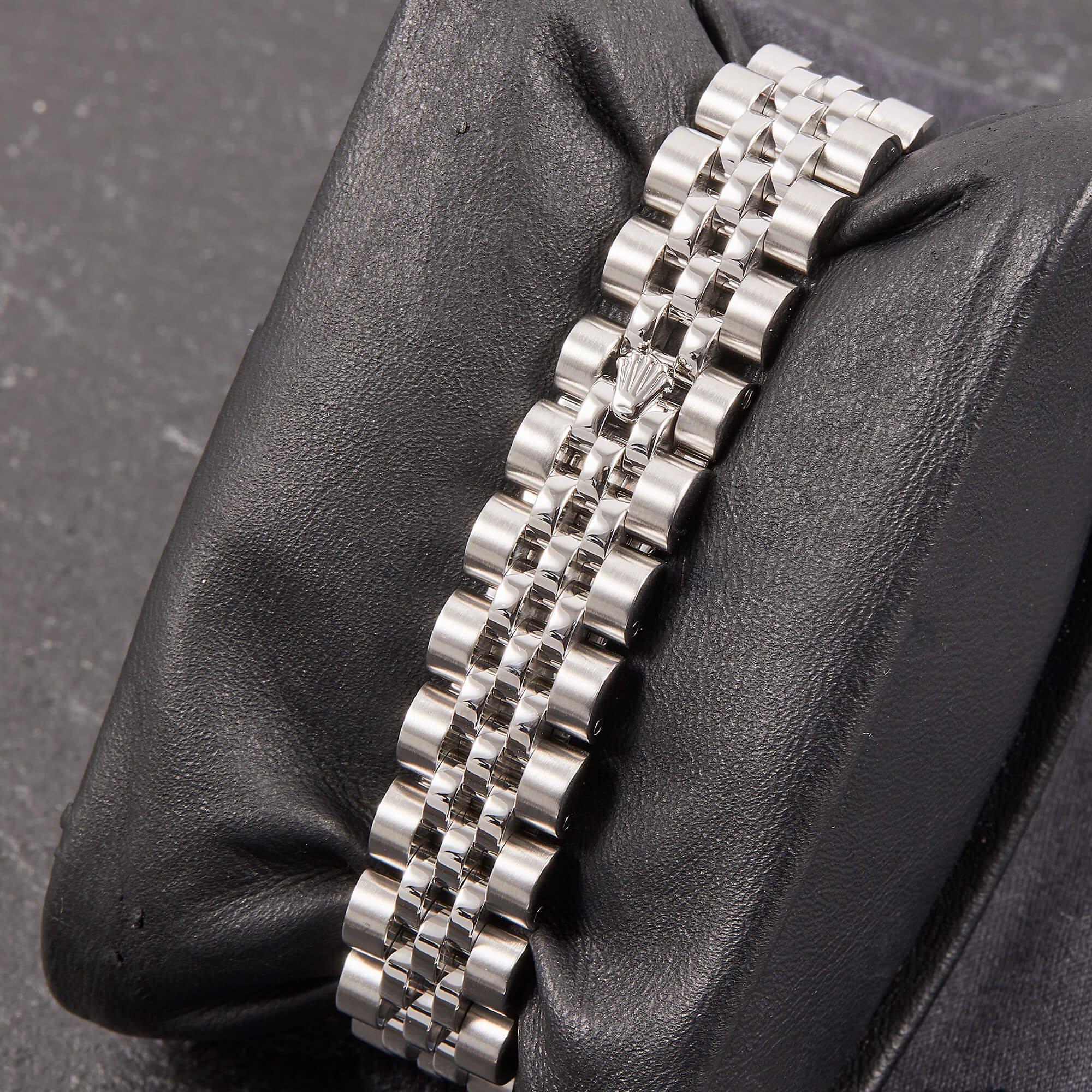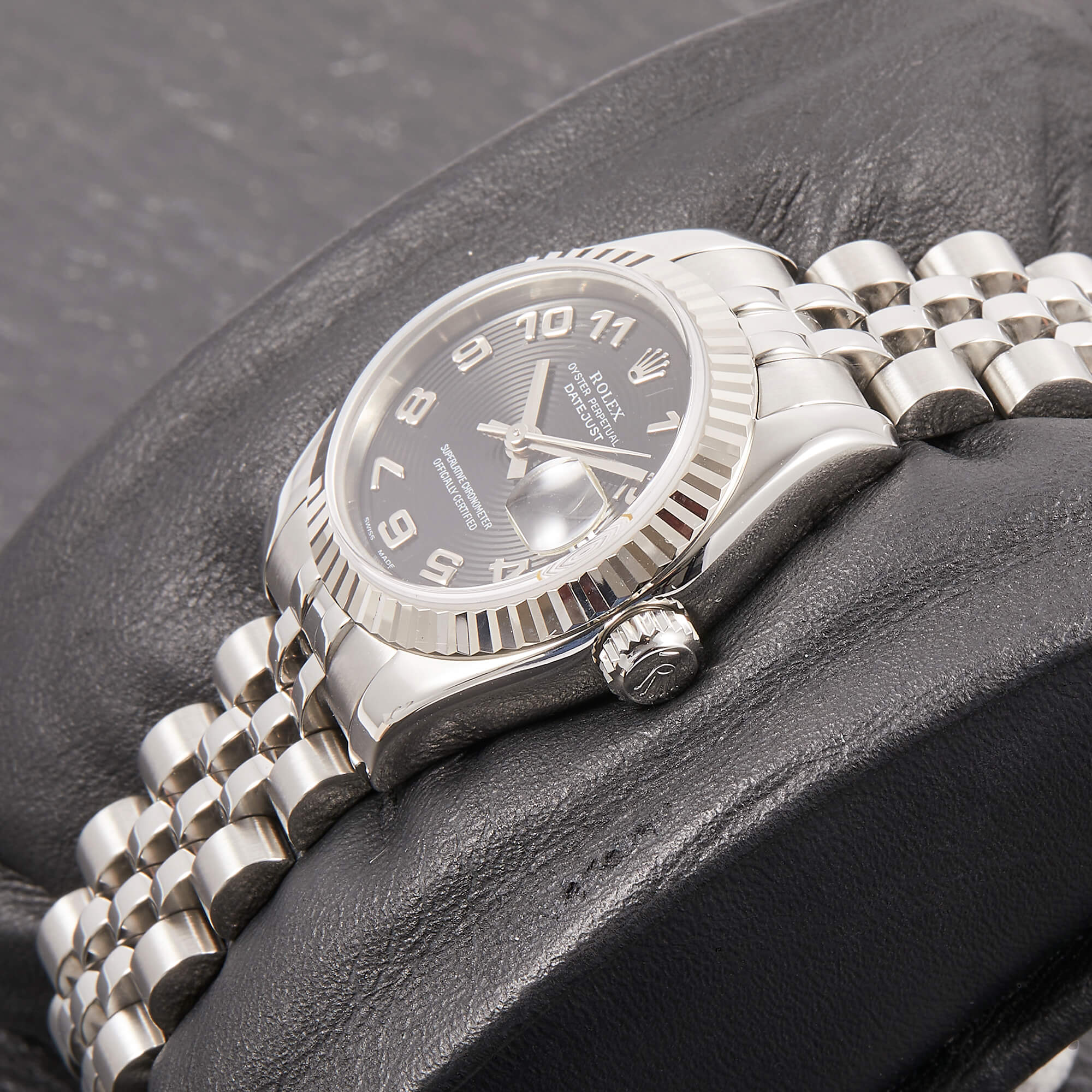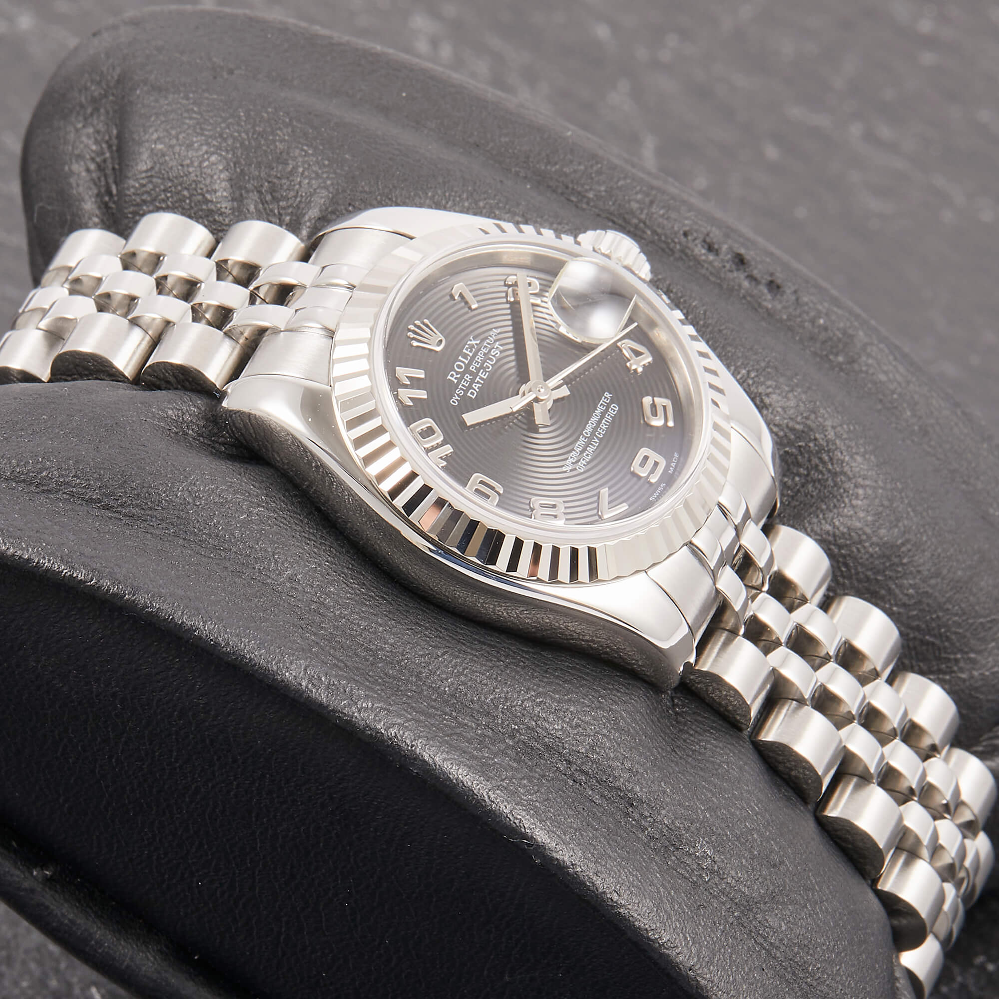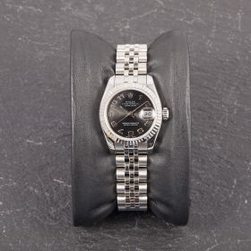 Elegante Rolex Datejust Lady Referenz 179174 mit schwarzem Zifferblatt und arabischen Indizes. Ausgestattet mit einem Jubileeband und verdeckter Crownclasp-Schließe für ein besonders harmonisches Erscheinungsbild.- Durchmesser