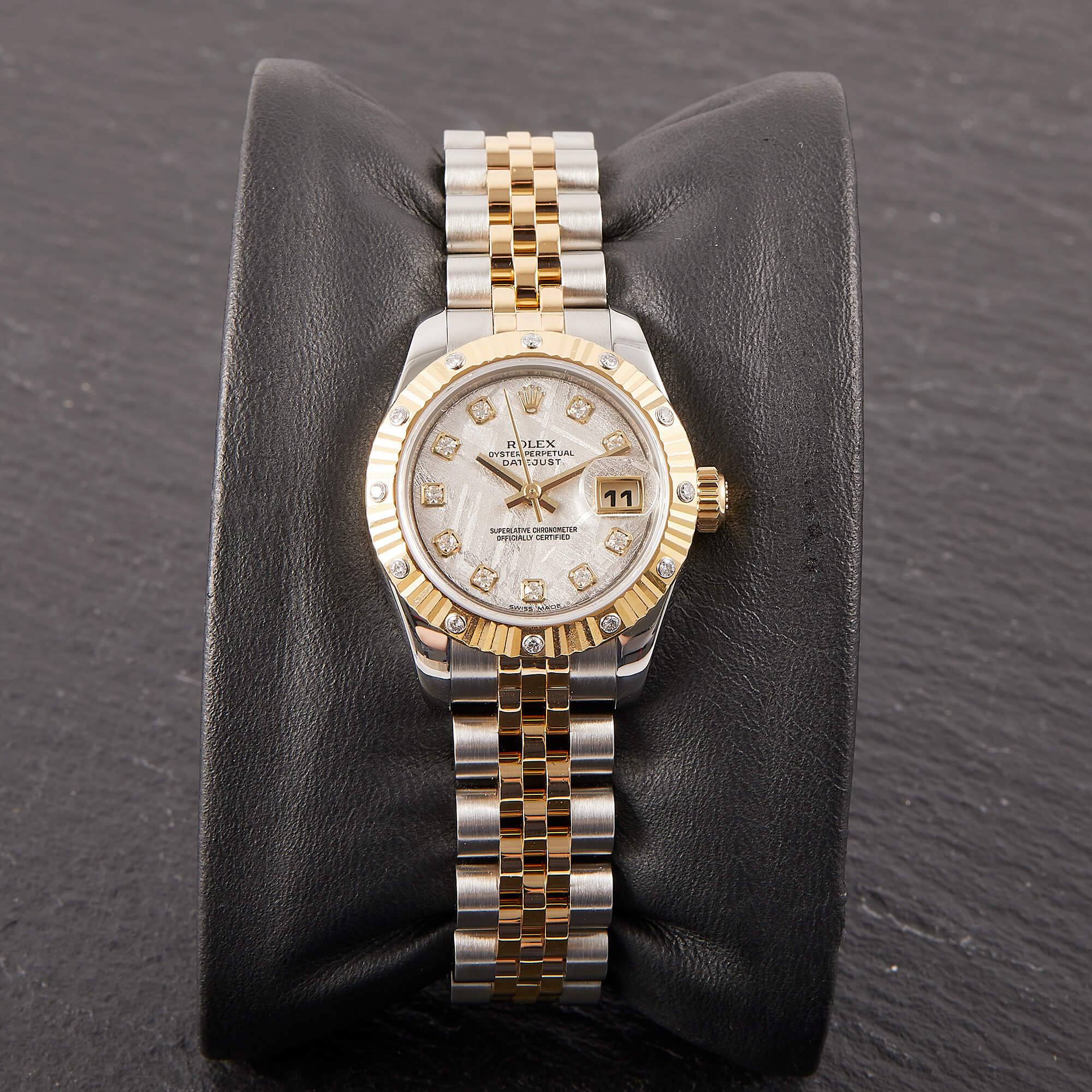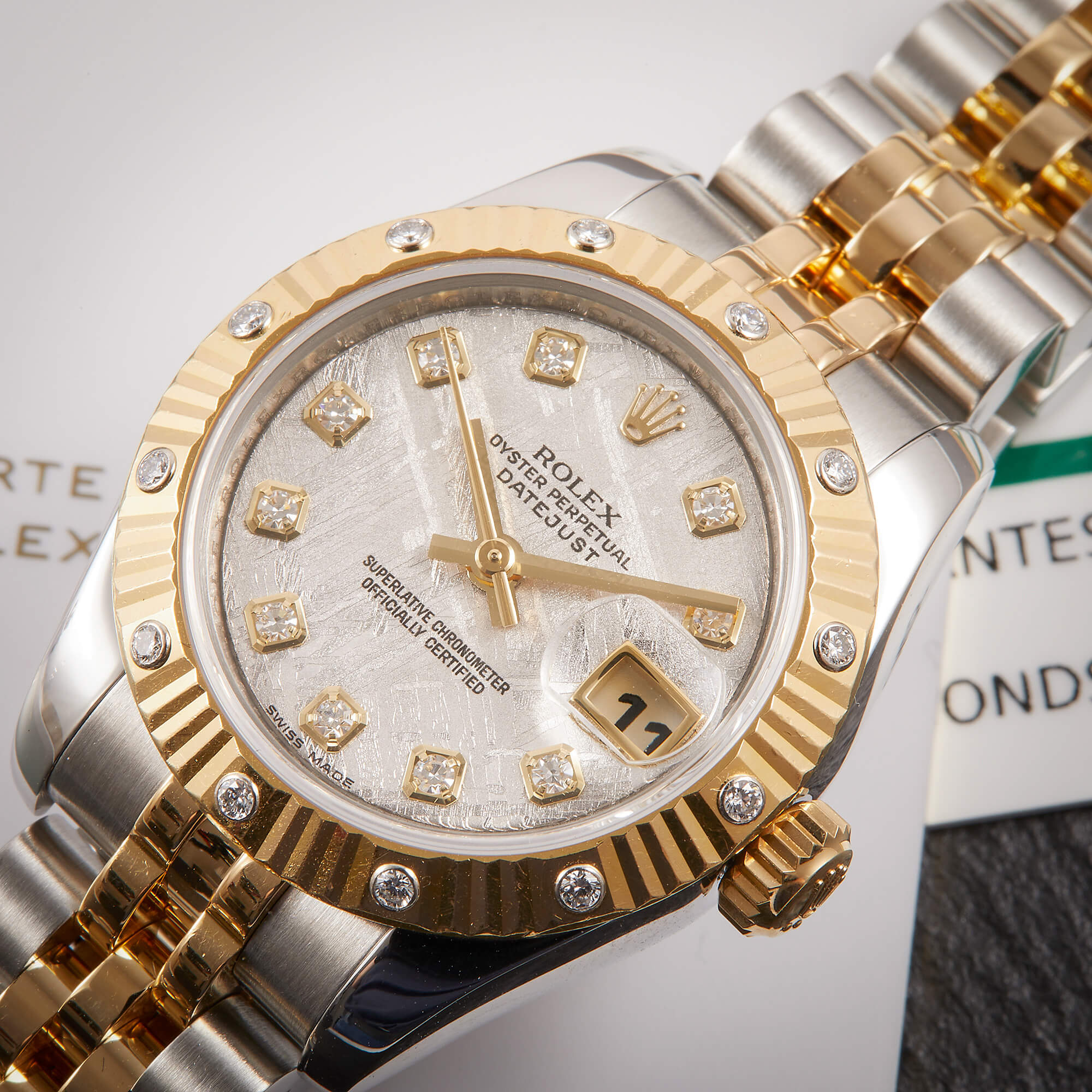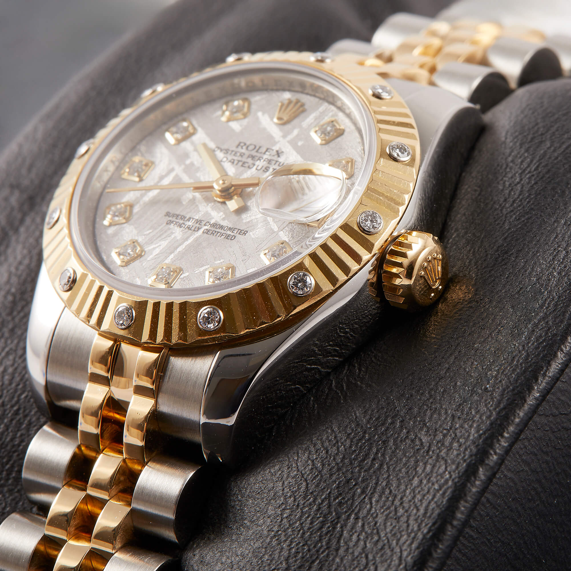 Sehr seltene Lady Datejust mit einzigartigem Meteorit-Zifferblatt. Originale Riffellünette mit eingefassten Diamanten, dazu klassisches Jubileeband mit versteckter Schließe. Frisch revisioniert, inkl. Servicecard und originaler Garantiekarte – eleganter Klassiker mit besonderem Flair.
