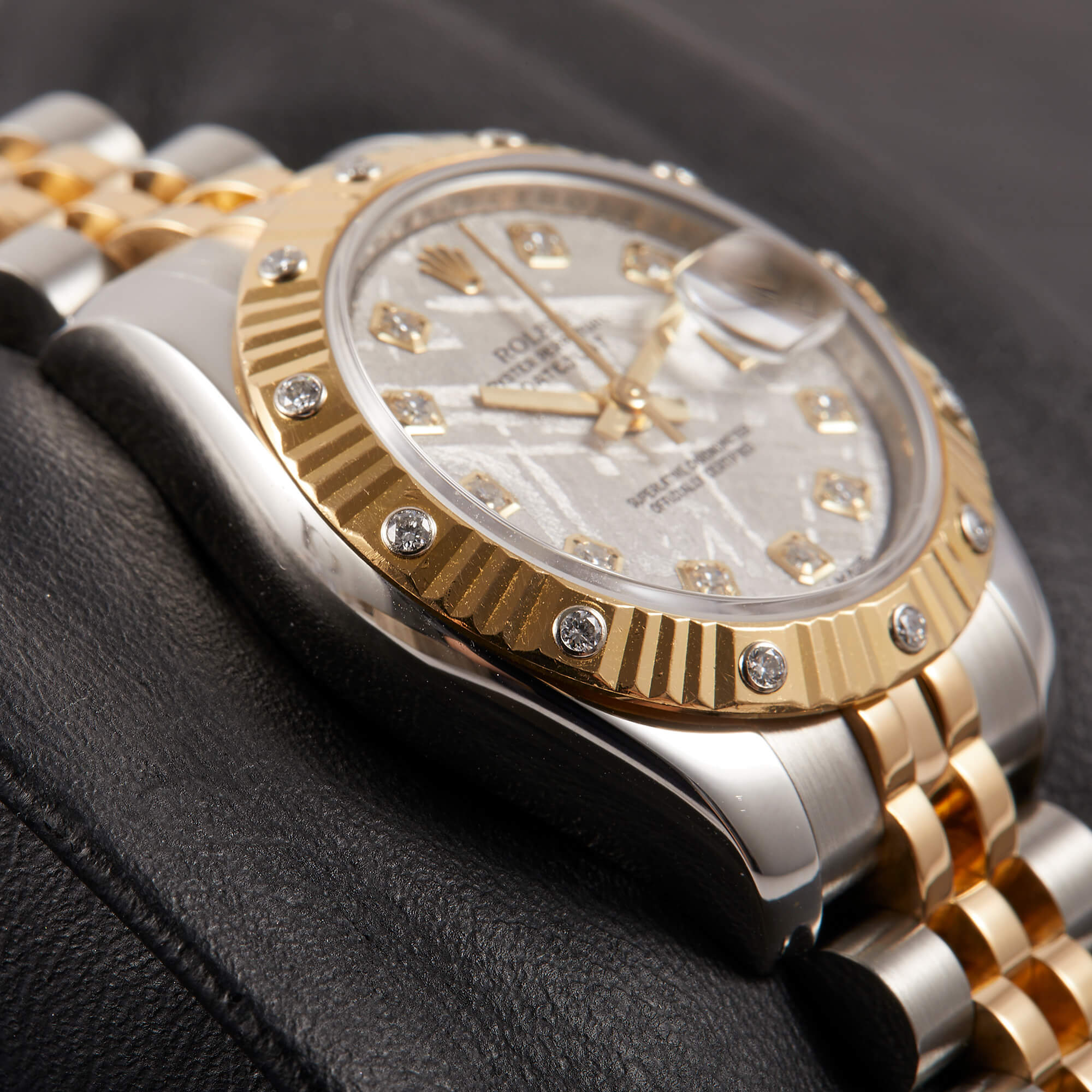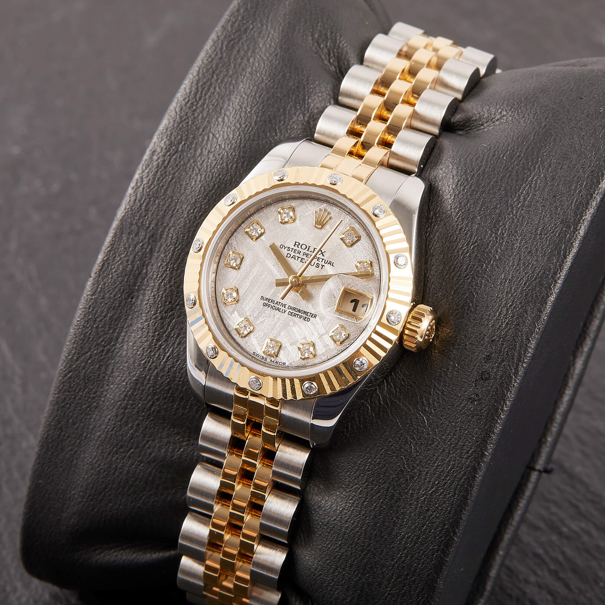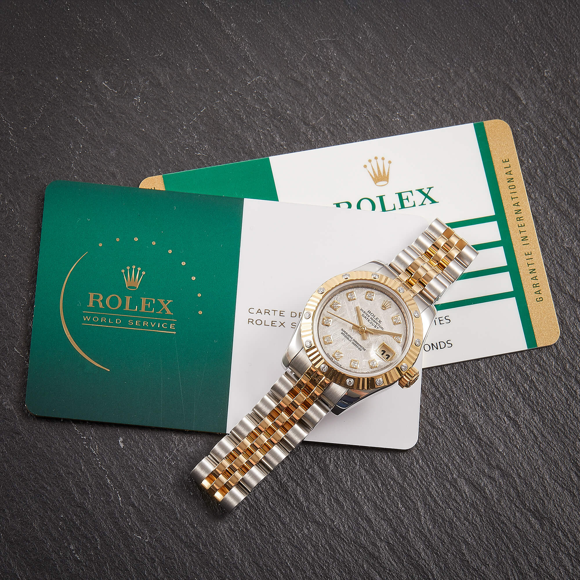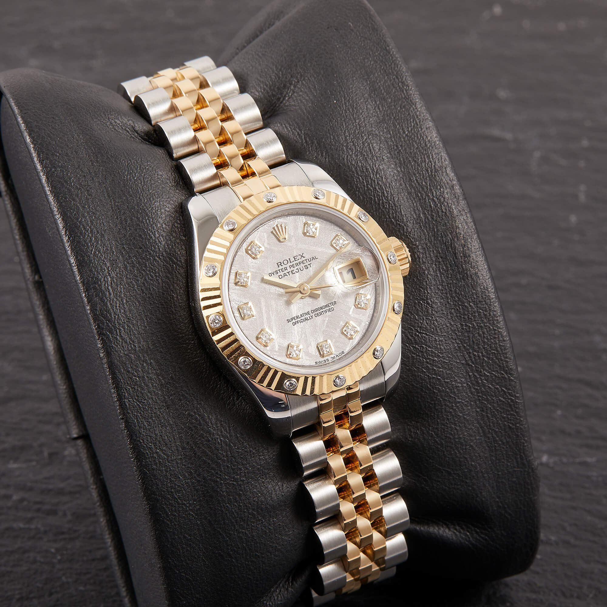 Sehr seltene Lady Datejust mit einzigartigem Meteorit-Zifferblatt. Originale Riffellünette mit eingefassten Diamanten, dazu klassisches Jubileeband mit versteckter Schließe. Frisch revisioniert, inkl. Servicecard und originaler Garantiekarte – eleganter Klassiker mit besonderem Flair.