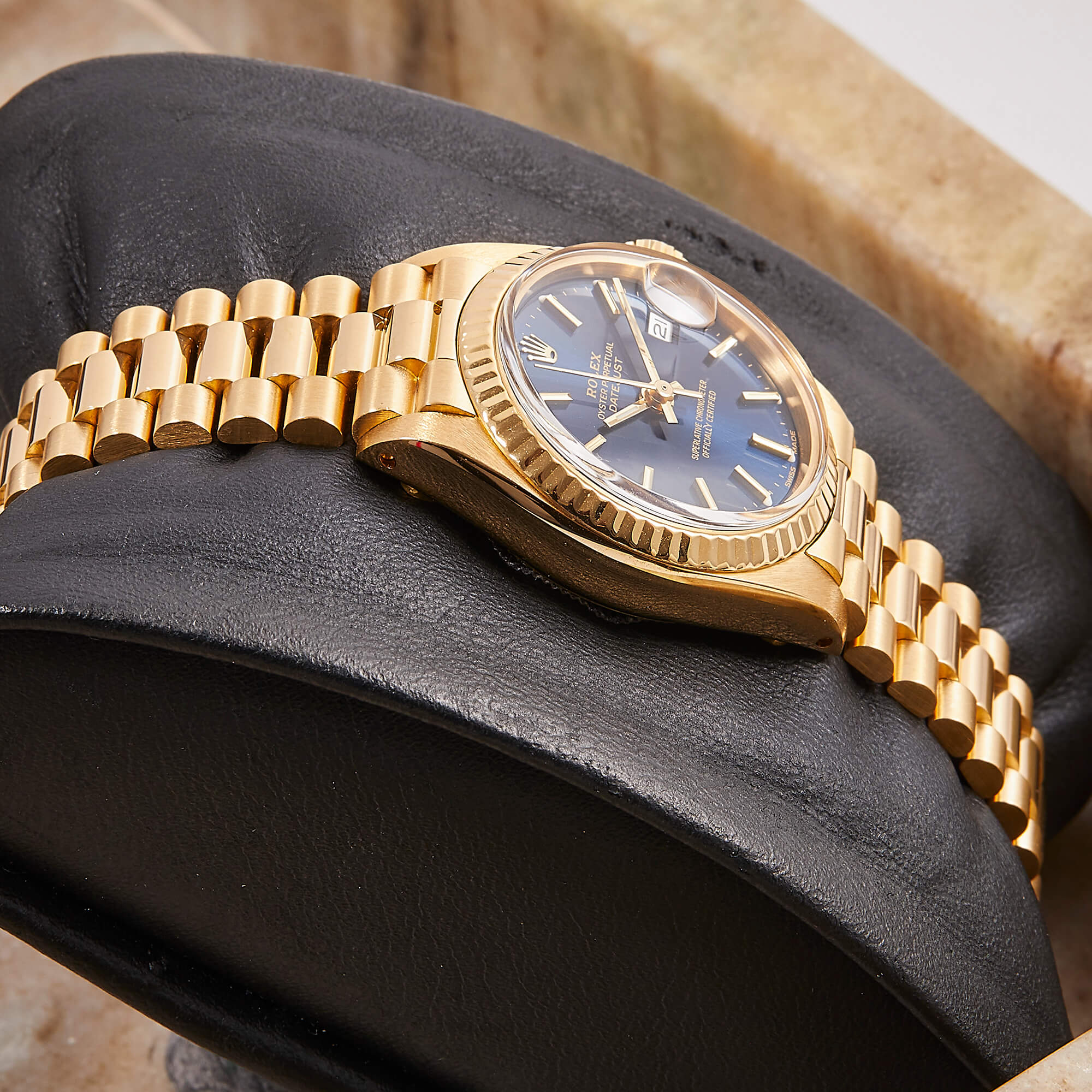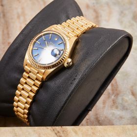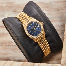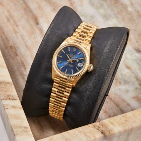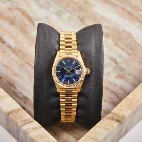 Die Rolex Lady Datejust 26, Referenz 69178, präsentiert sich in einem edlen 18-Karat-Gelbgoldgehäuse mit einem blauen Zifferblatt, das mit klassischen Strichindizes verziert ist. Das klassische Design und die kompakte Größe machen sie zur perfekten Damenuhr für jeden Anlass. Frisch nach Herstellervorgaben revisioniert.- Durchmesser