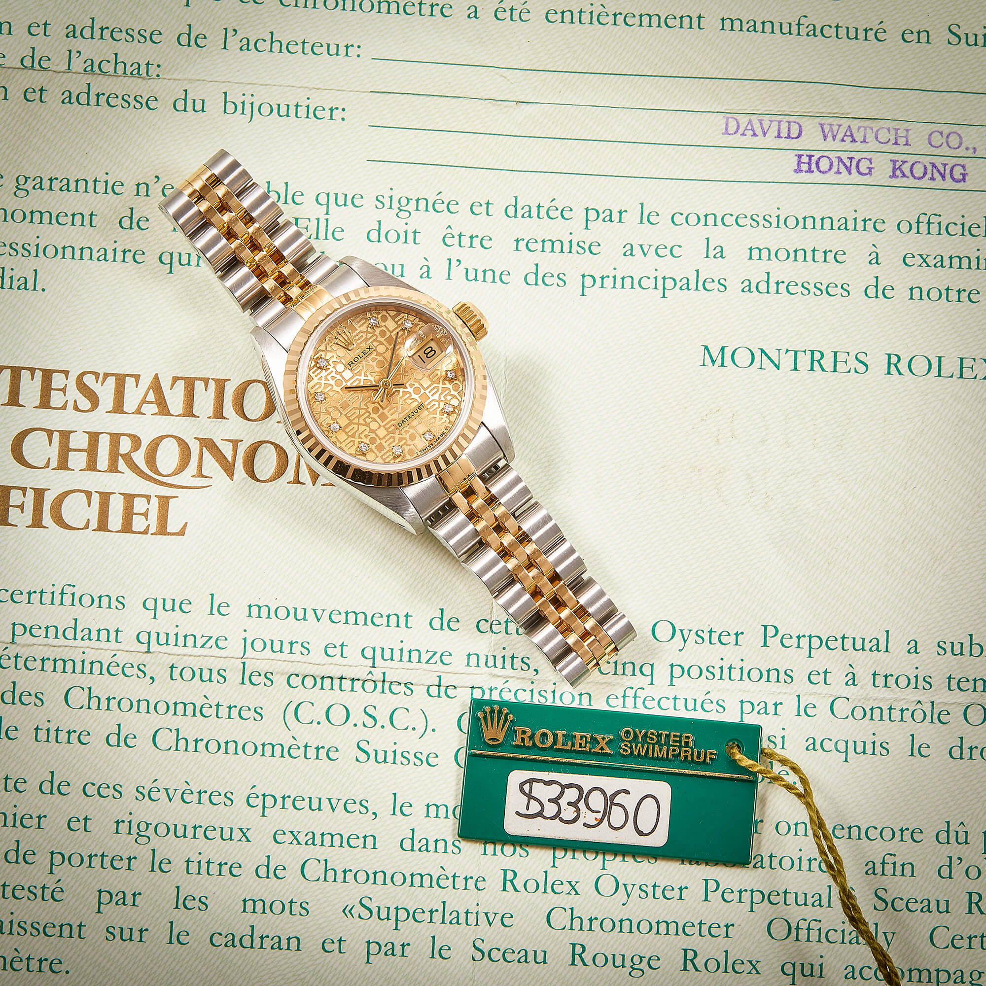 Diese elegante Lady-Datejust 69173 überzeugt mit einem schönen champagnerfarbenem Computer-Zifferblatt inkl. Diamantindizes und originalem Jubilee-Band. Die Uhr befindet sich in sehr schönem Zustand. Ein klassisches Damenmodell mit besonderem Charme, welches mit originalen Garantieunterlagen ausgeliefert wird.- Durchmesser