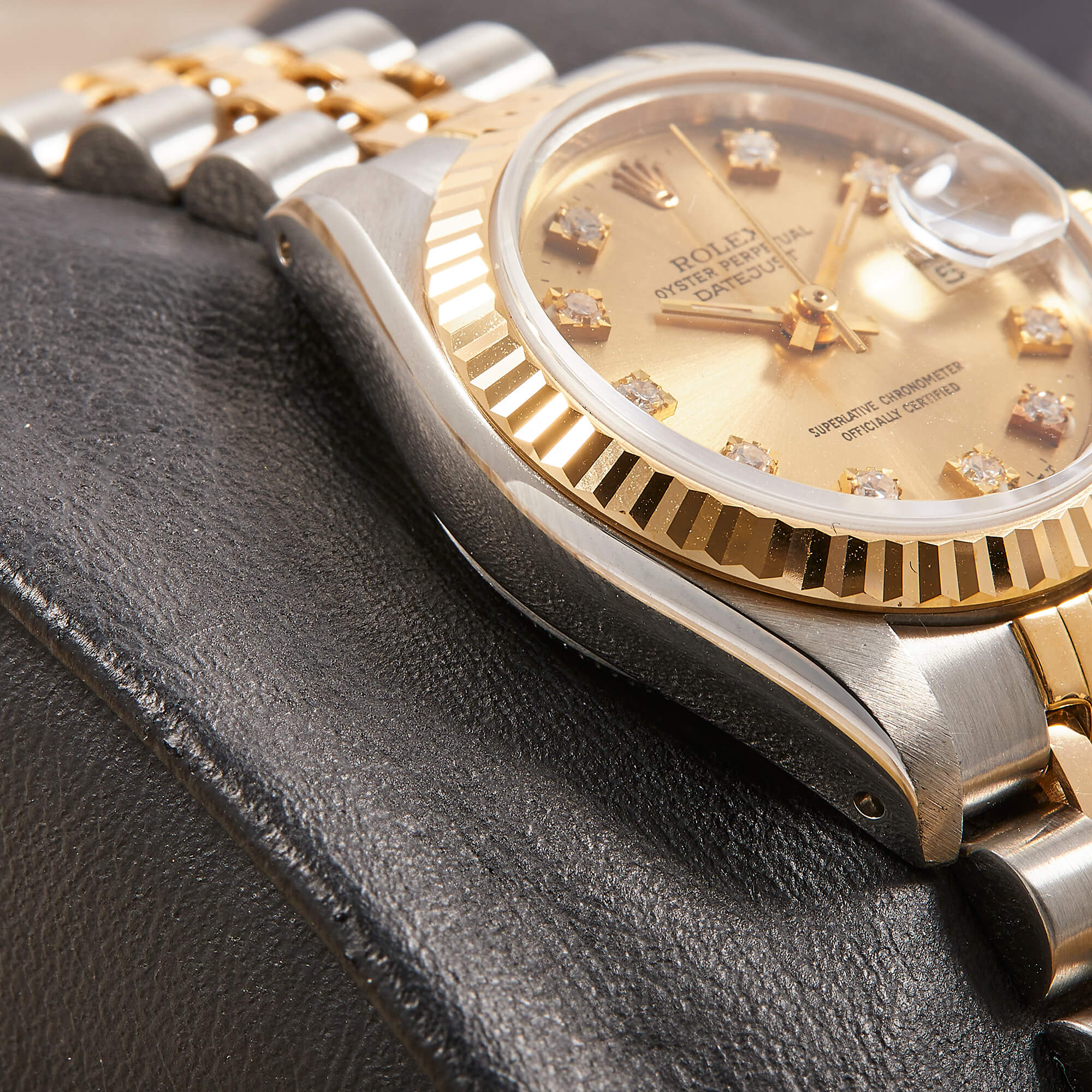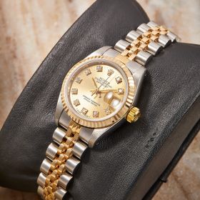 Diese elegante Lady-Datejust 69173 überzeugt mit einem schönen champagnerfarbenem Zifferblatt inkl. Diamantindizes und originalem Jubilee-Band. Die Uhr befindet sich in sehr schönem Zustand. Ein klassisches Damenmodell mit besonderem Charme, welches im Fullset ausgeliefert wird.- Durchmesser