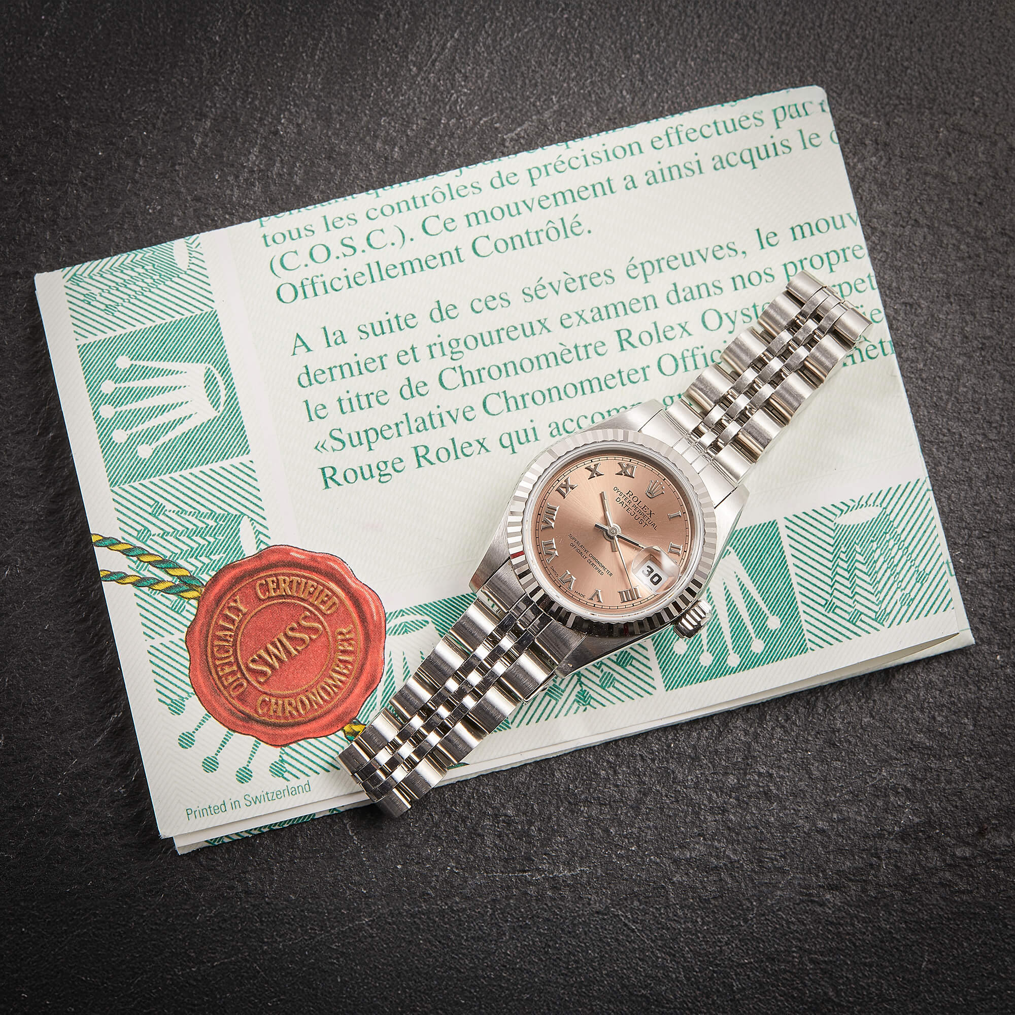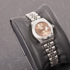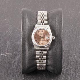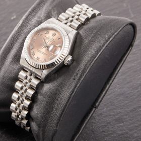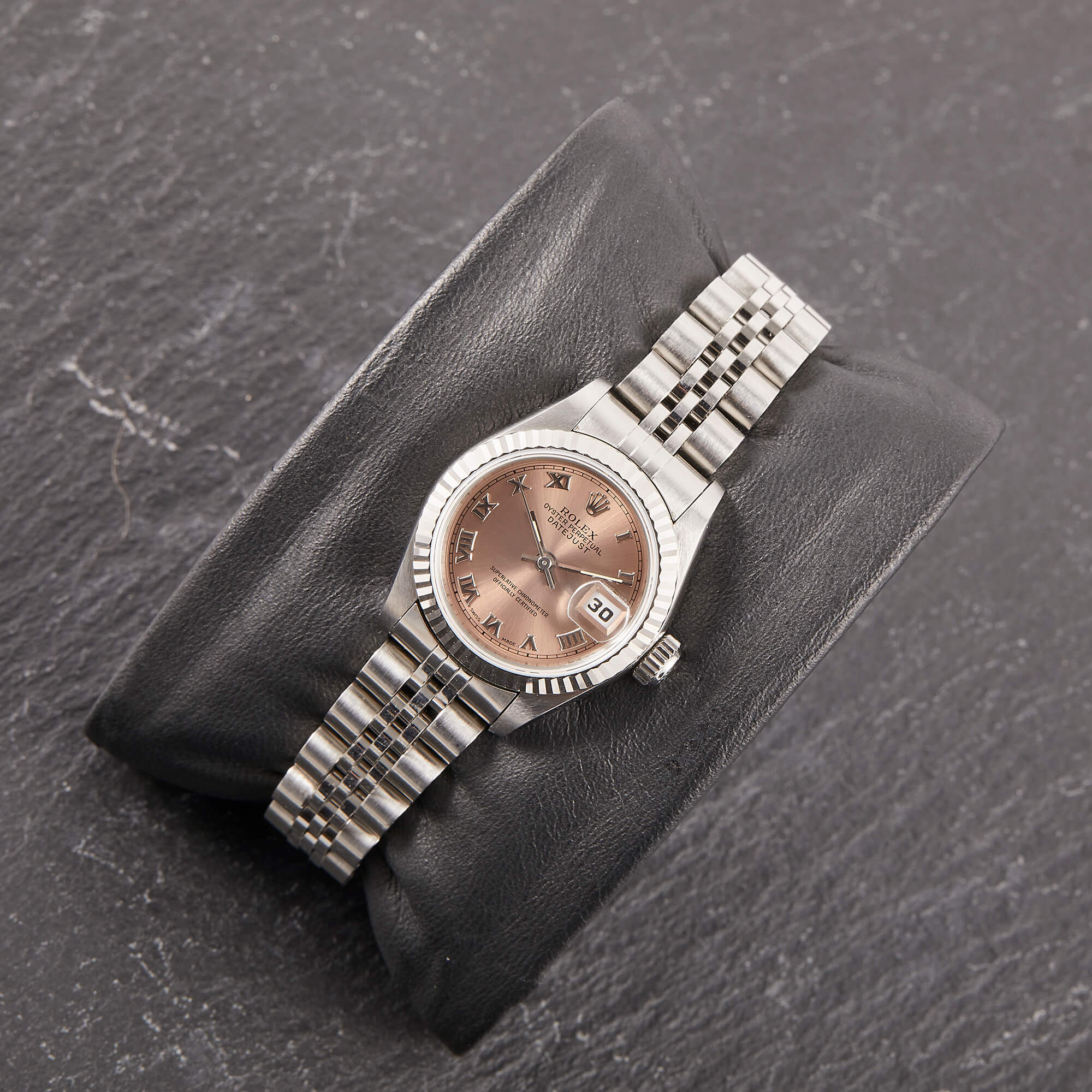Die Rolex Lady Datejust 26, Referenz 69174, besticht durch ihr Edelstahlgehäuse mit der eleganten, geriffelten Weißgoldlünette. Das rosafarbene Zifferblatt ist mit römischen Indizes ausgestattet und verleiht der Uhr eine zeitlose, edle Ausstrahlung. Die Uhr wird mit originalen Garantieunterlagen geliefert.- Durchmesser