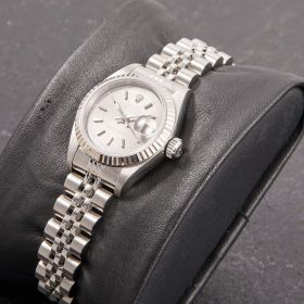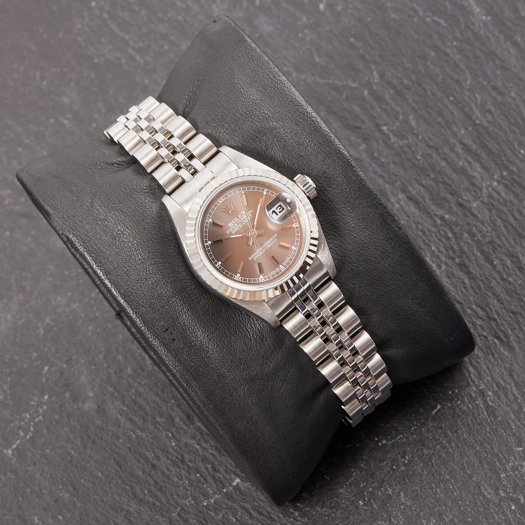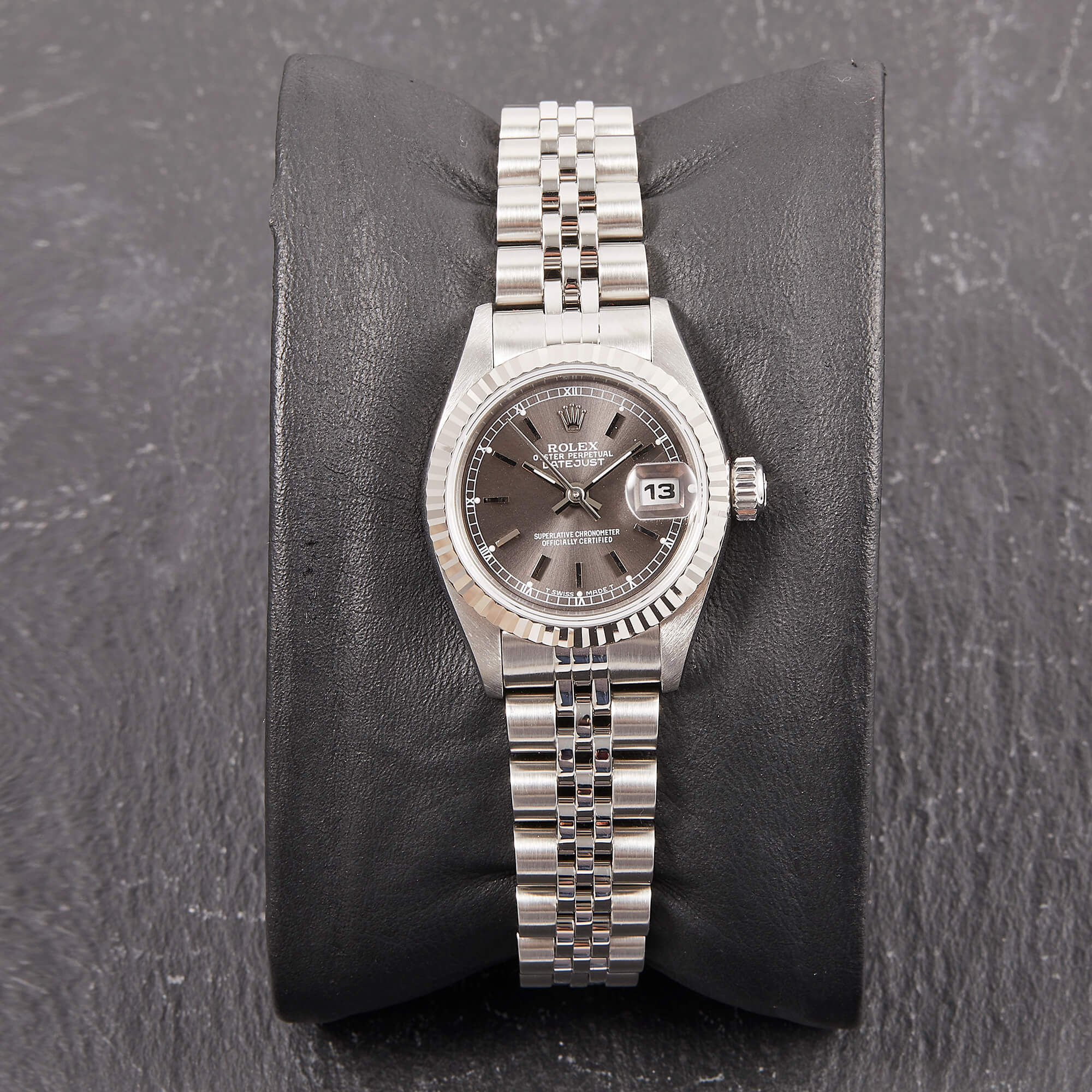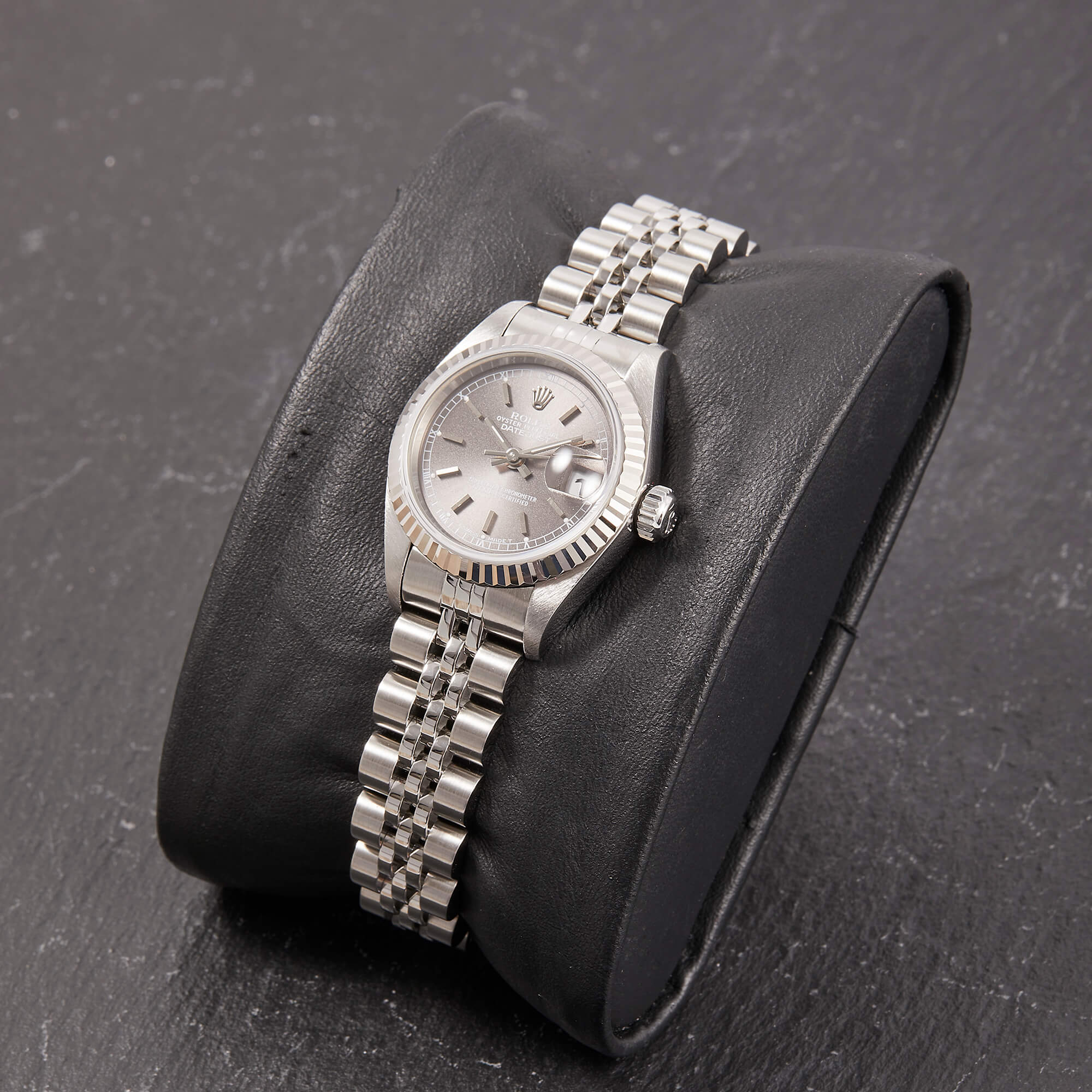 Die Rolex Lady Datejust 26, Referenz 69174, besticht durch ihr Edelstahlgehäuse mit der eleganten, geriffelten Weißgoldlünette. Das graue Zifferblatt ist mit Strichindizes ausgestattet und verleiht der Uhr eine zeitlose, edle Ausstrahlung. Die Uhr wird im Fullset geliefert.- Durchmesser