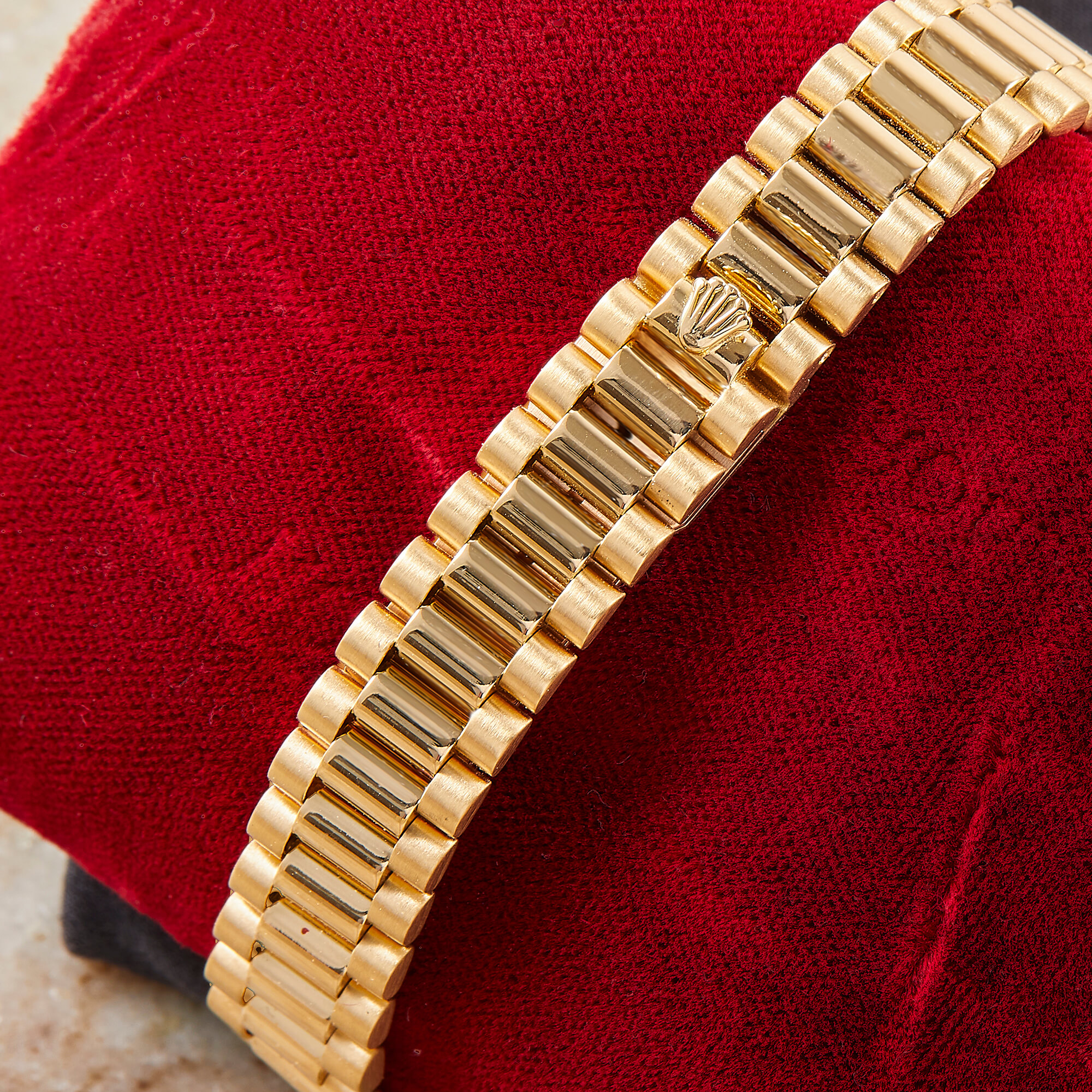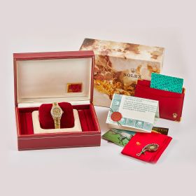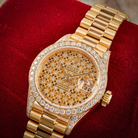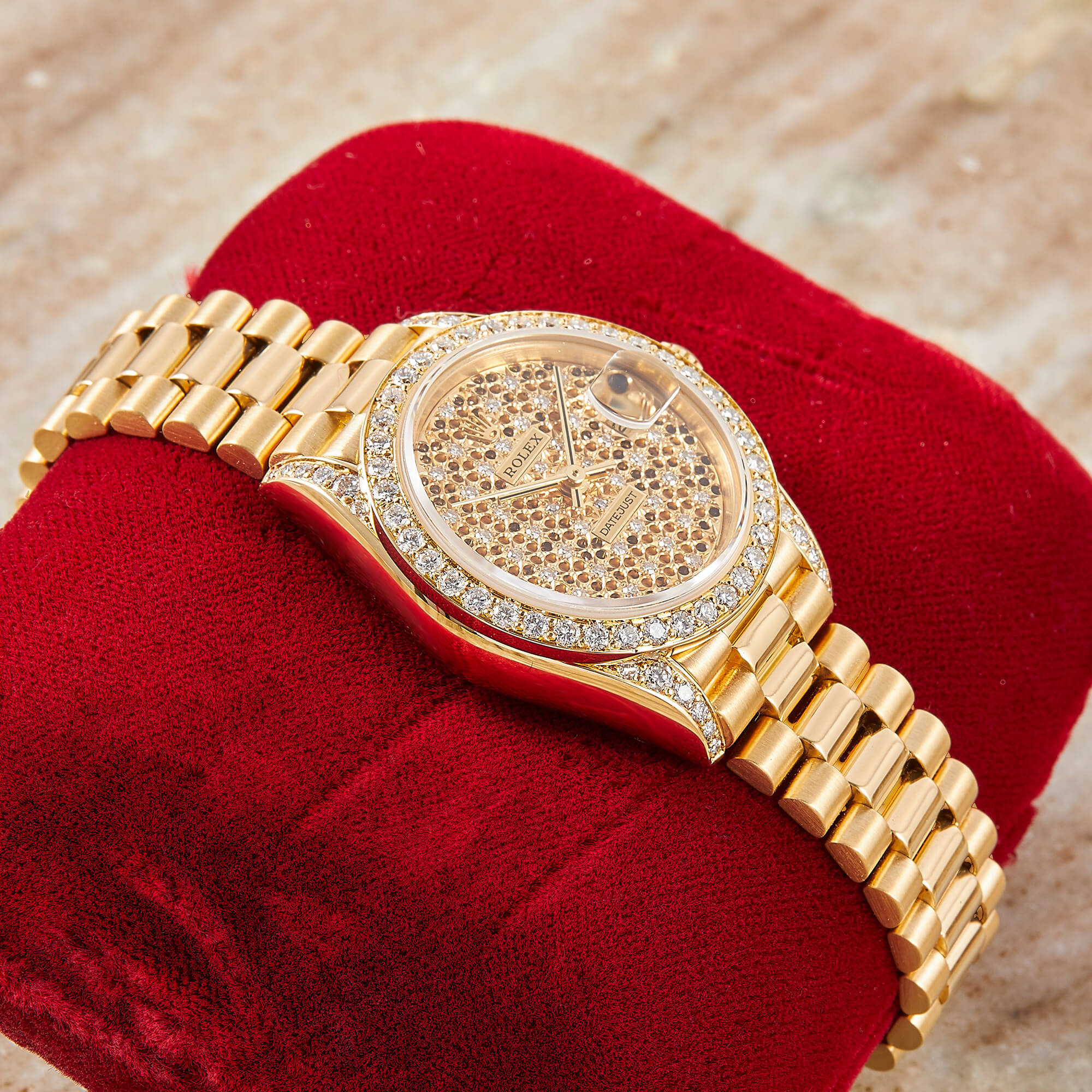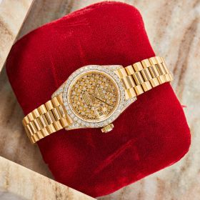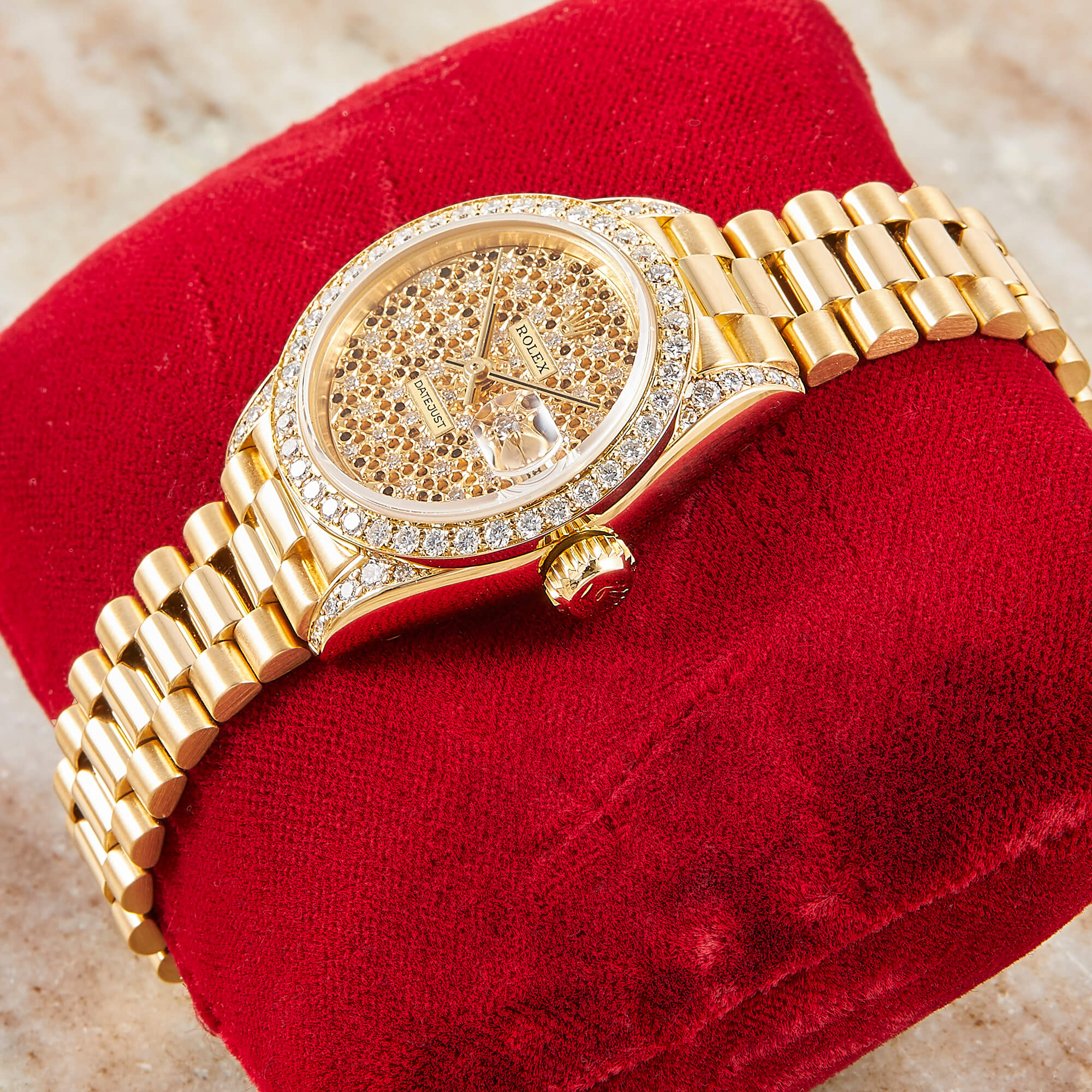 Diese elegante Lady-Datejust 69178 überzeugt mit einem seltenen Pavézifferblatt, sowie Diamantbesatz auf Lünette und Gehäuse und originalem Präsident-Band. Die Uhr befindet sich in sehr schönem Zustand. Ein klassisches Damenmodell mit besonderem Charme, welches im Fullset ausgeliefert wird.- Durchmesser