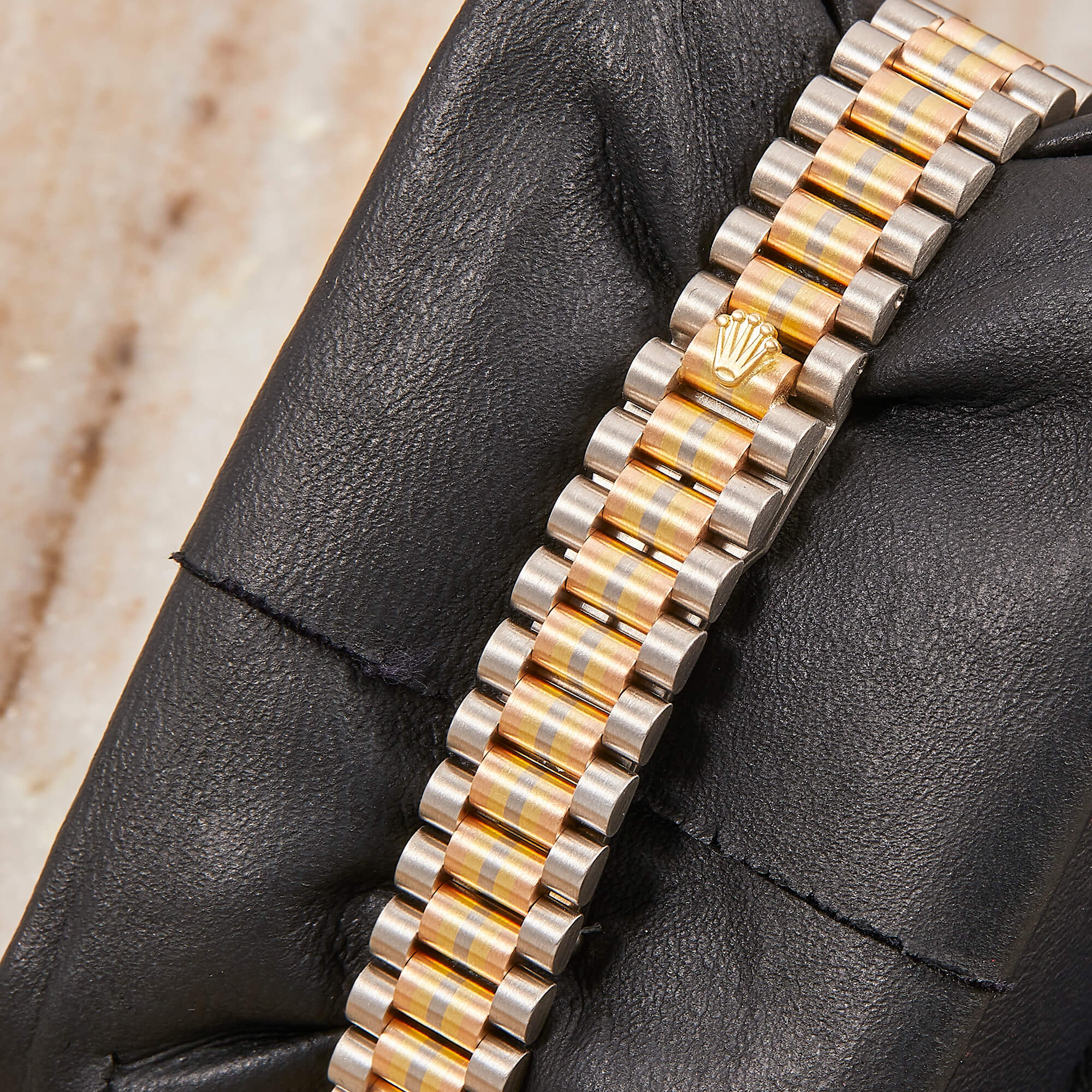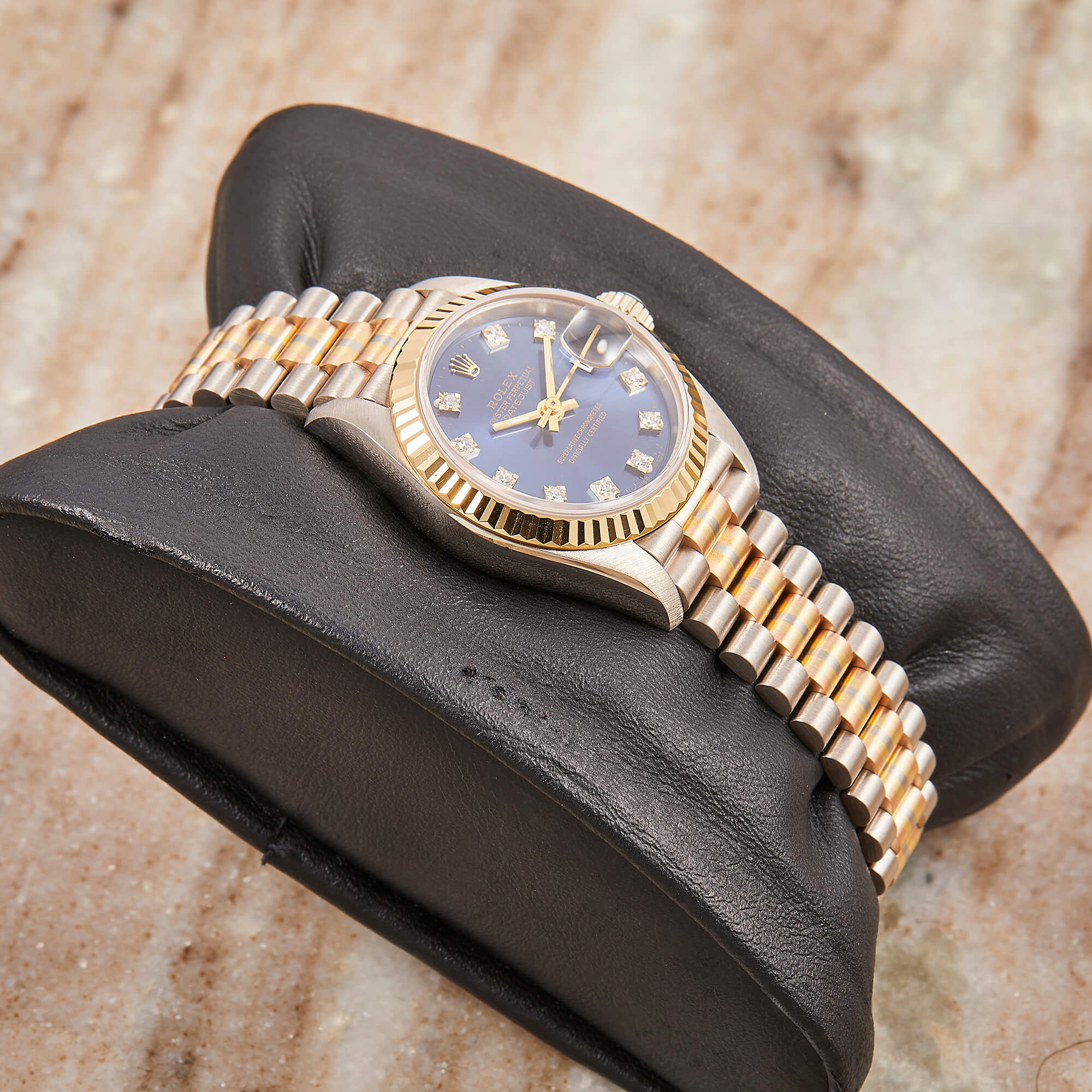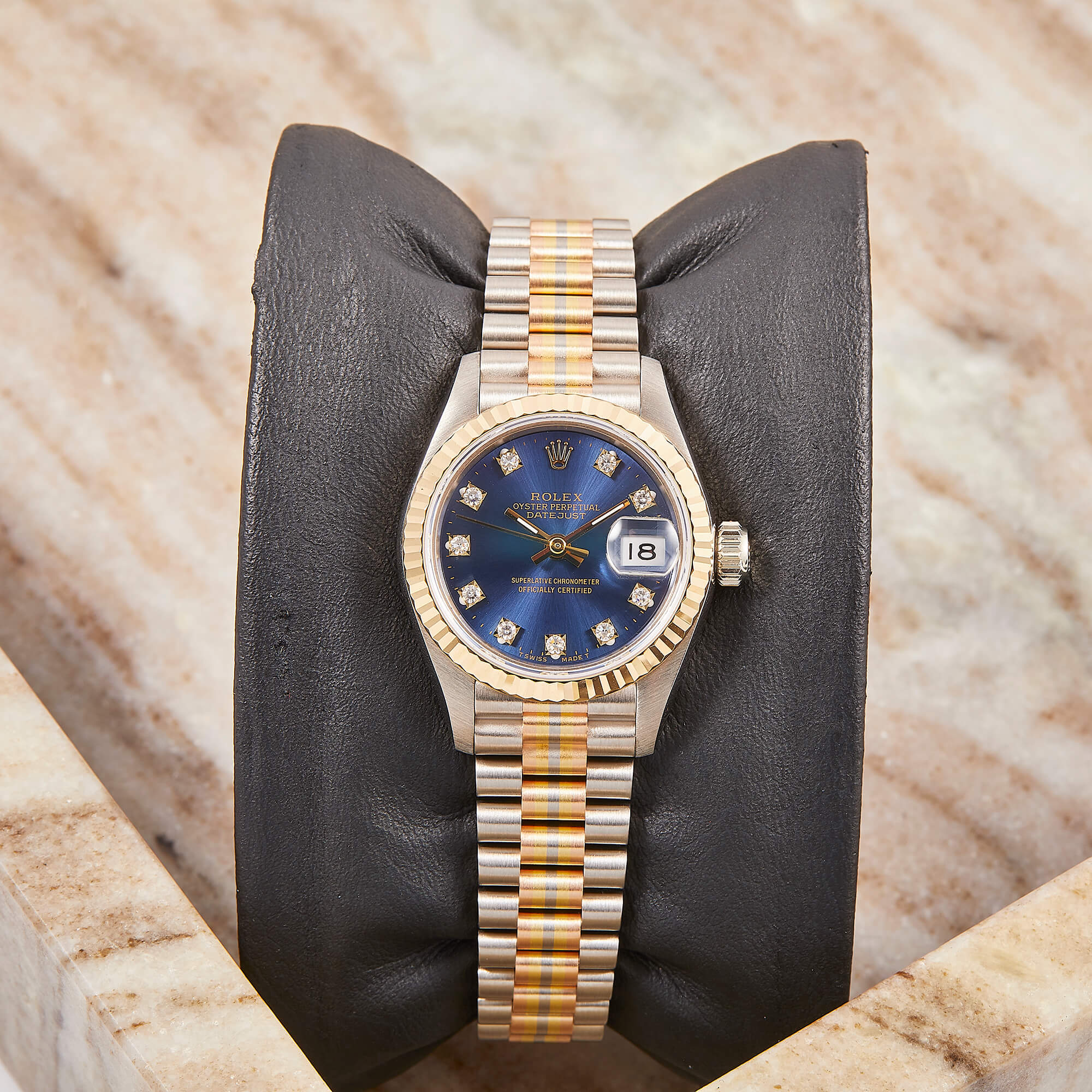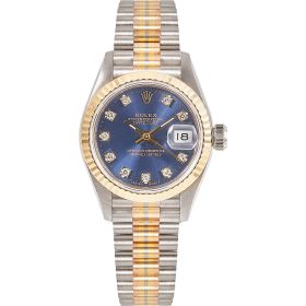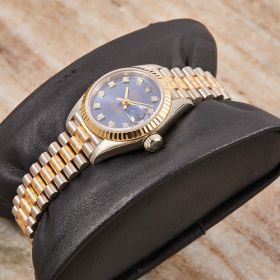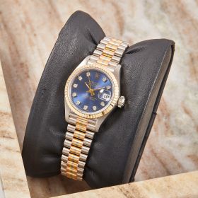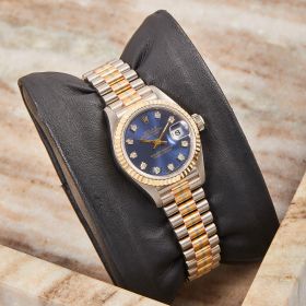 Die Rolex Lady Datejust 26, Referenz 69179, besticht durch ihr Goldgehäuse, welches in drei verschiedenen Goldvarianten gefertigt wurde. Mit der eleganten, geriffelten Goldlünette und dem blauen Zifferblatt ist mit funkelnden Diamantindizes ausgestattet und verleiht der Uhr eine zeitlose, edle Ausstrahlung. Sogenannte "Tri-Dor" Rolexuhren sind äußerst selten und die perfekte Ergänzung für jede ernstzunehmende Uhrensammlung.