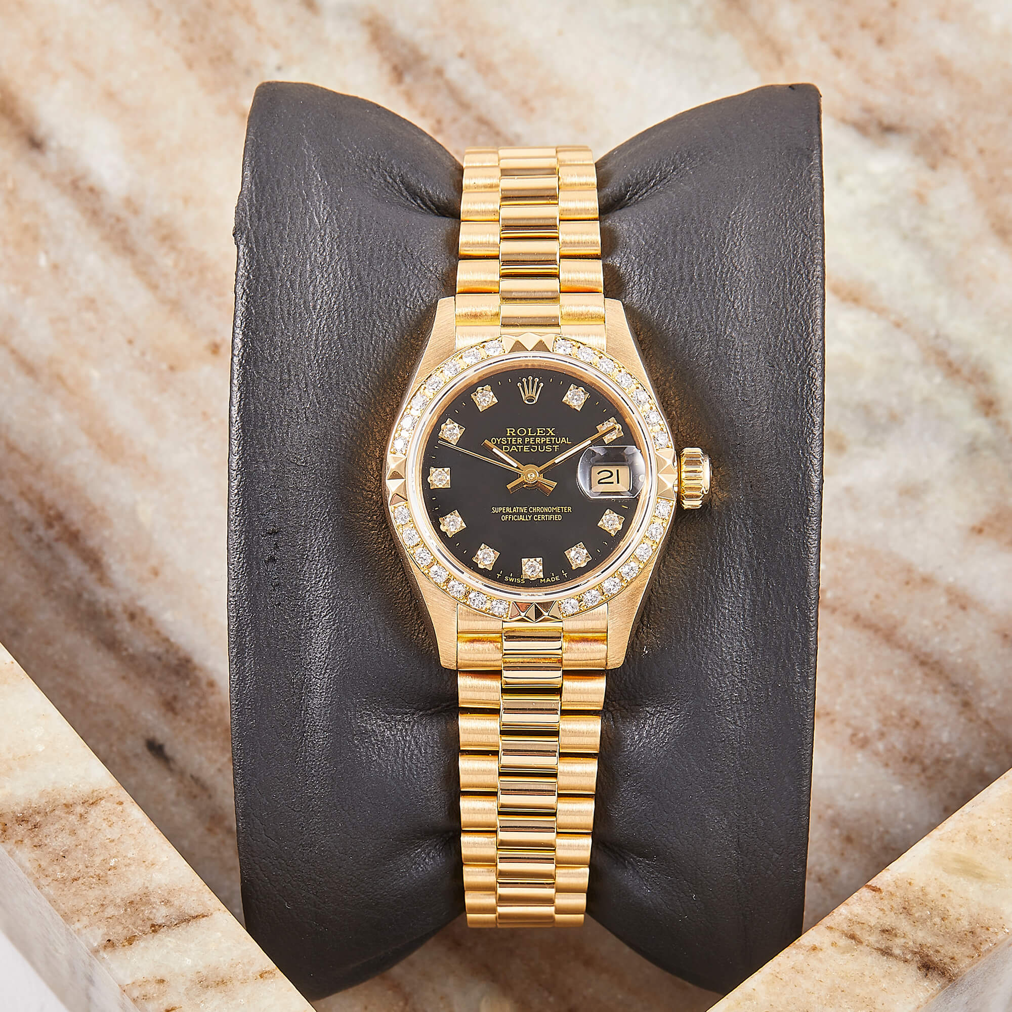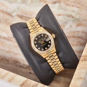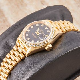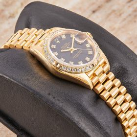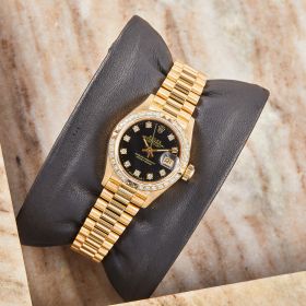 Diese elegante Lady-Datejust 69268 überzeugt mit einem schönen schwarzen Zifferblatt inkl. Diamantindizes und originalem Präsident-Band, sowie ausgefasste Lünette. Die Uhr befindet sich in sehr schönem Zustand. Ein klassisches Damenmodell mit besonderem Charme, welches mit originalen Garantieunterlagen ausgeliefert wird.